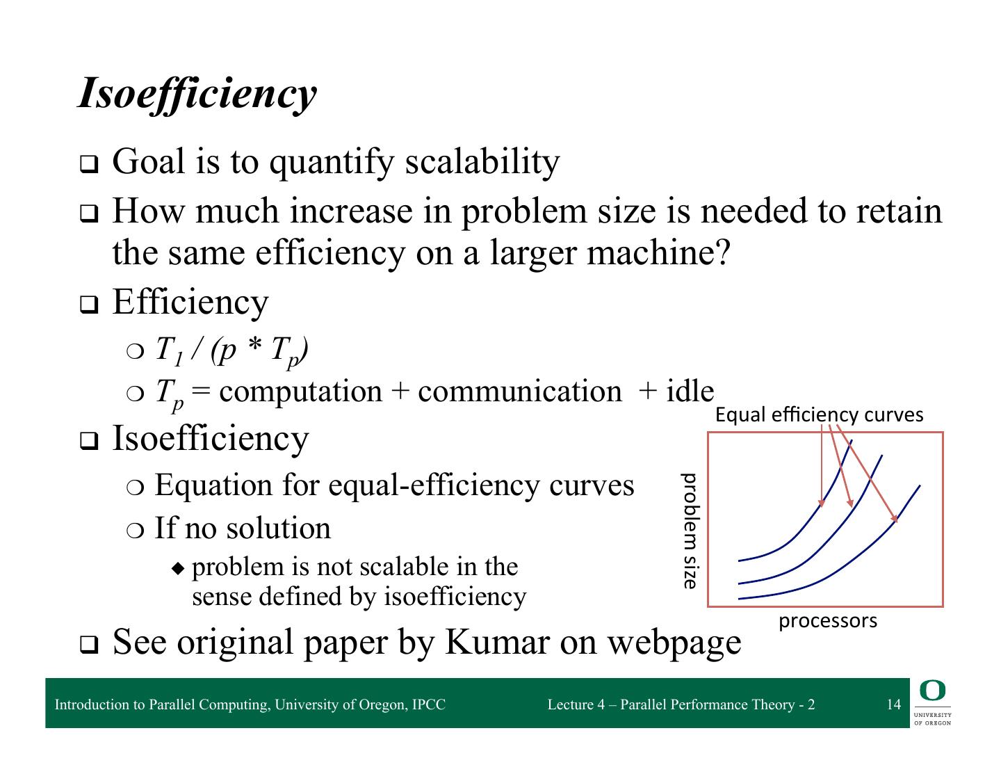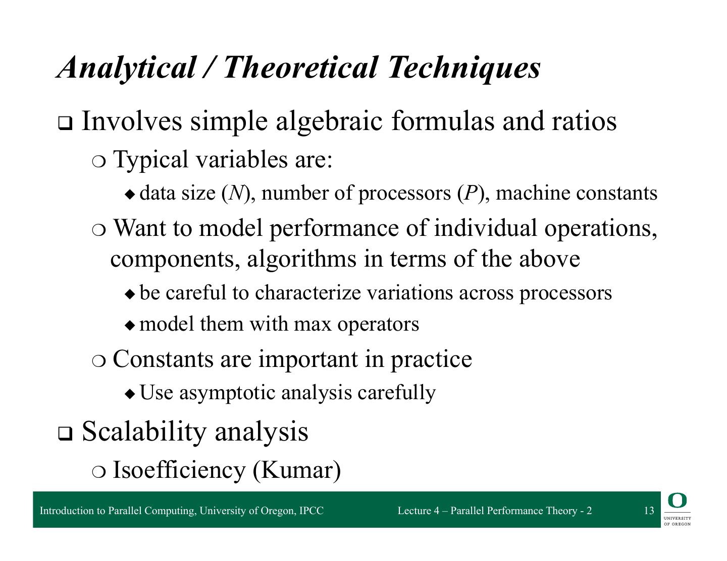 13 . Analytical / Theoretical Techniques q Involves simple algebraic formulas and ratios ❍ Typical variables are: ◆ data size (N), number of processors (P), machine constants ❍ Want to model performance of individual operations, components, algorithms in terms of the above ◆ be careful to characterize variations across processors ◆ model them with max operators ❍ Constants are important in practice ◆ Use asymptotic analysis carefully q Scalability analysis ❍ Isoefficiency (Kumar) Introduction to Parallel Computing, University of Oregon, IPCC Lecture 4 – Parallel Performance Theory - 2 13