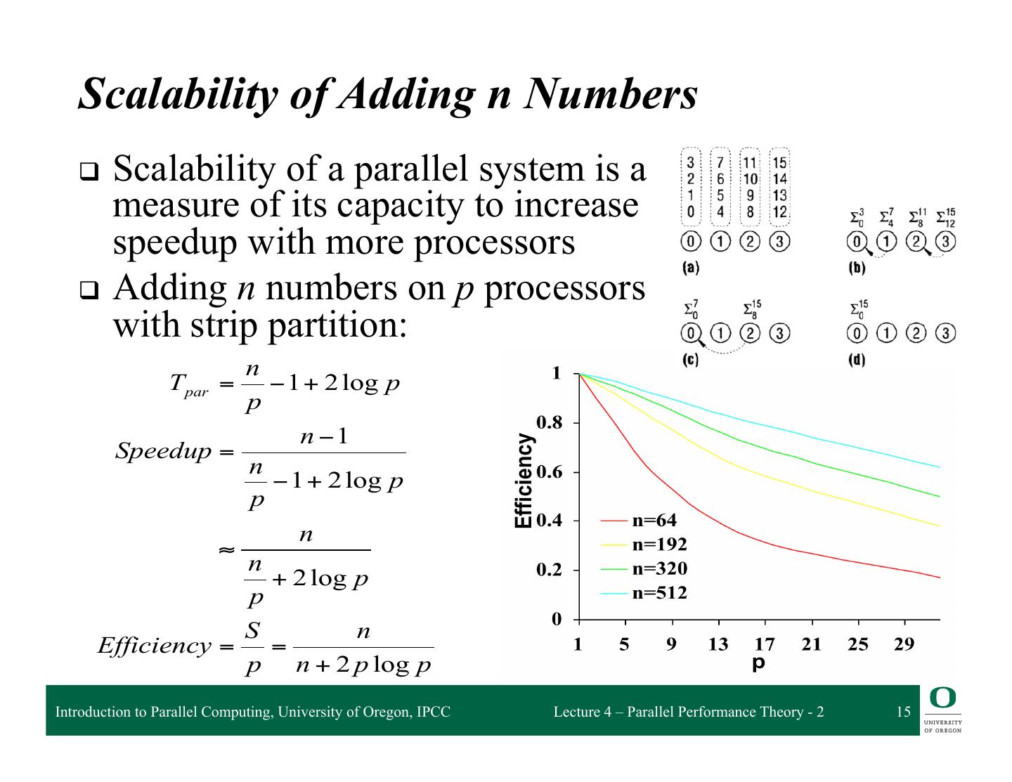 15 . Scalability of Adding n Numbers q Scalability of a parallel system is a measure of its capacity to increase speedup with more processors q Adding n numbers on p processors with strip partition: n T par = − 1 + 2 log p p n −1 Speedup = n − 1 + 2 log p p n ≈ n + 2 log p p S n Efficiency = = p n + 2 p log p Introduction to Parallel Computing, University of Oregon, IPCC Lecture 4 – Parallel Performance Theory - 2 15
