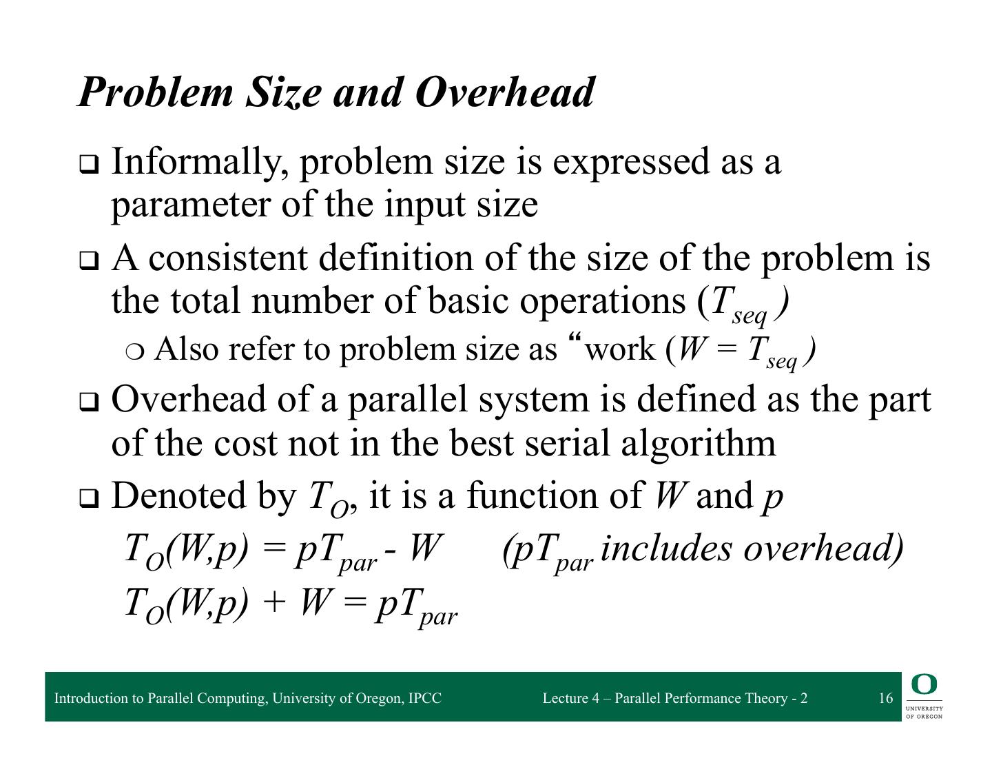 16 . Problem Size and Overhead q Informally, problem size is expressed as a parameter of the input size q A consistent definition of the size of the problem is the total number of basic operations (Tseq ) ❍ Also refer to problem size as “work (W = Tseq ) q Overhead of a parallel system is defined as the part of the cost not in the best serial algorithm q Denoted by TO, it is a function of W and p TO(W,p) = pTpar - W (pTpar includes overhead) TO(W,p) + W = pTpar Introduction to Parallel Computing, University of Oregon, IPCC Lecture 4 – Parallel Performance Theory - 2 16