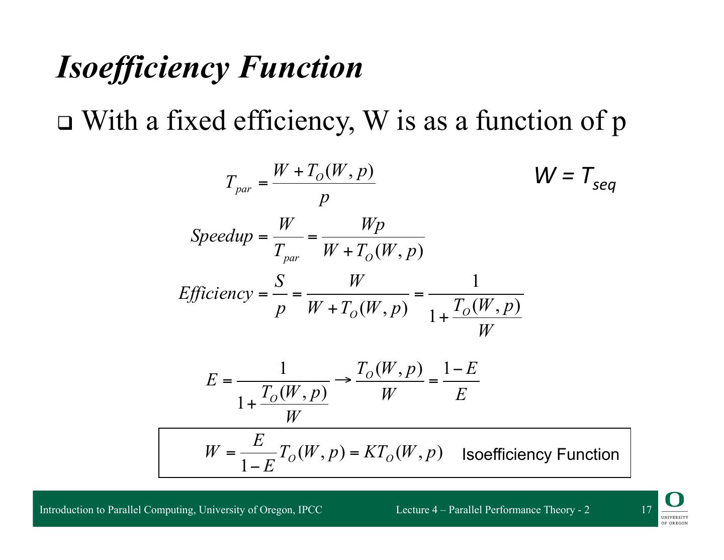 20 . Isoefficiency q Consider a parallel system with an overhead function TO = p 3 / 2 + p 3 / 4W 3 / 4 q Using only the first term W = Kp 3 / 2 q Using only the second term W = Kp 3 / 4W 3 / 4 W 1/ 4 = Kp 3 / 4 W = K 4 p3 q K4p3 is the overall asymptotic isoefficiency function Introduction to Parallel Computing, University of Oregon, IPCC Lecture 4 – Parallel Performance Theory - 2 20