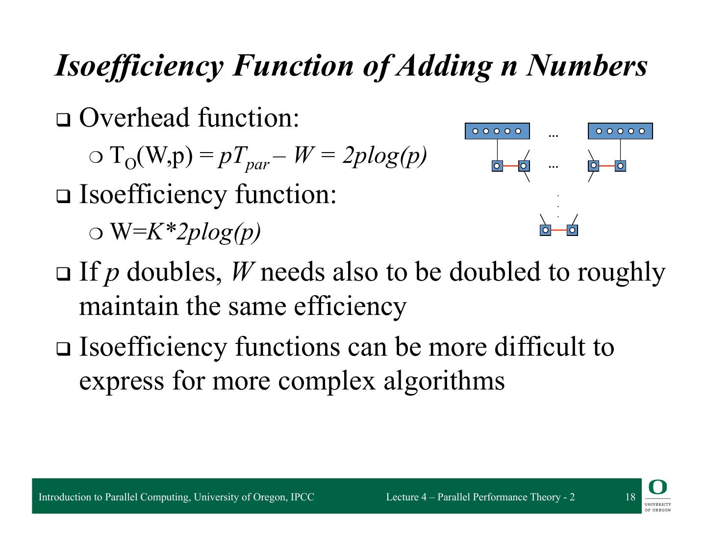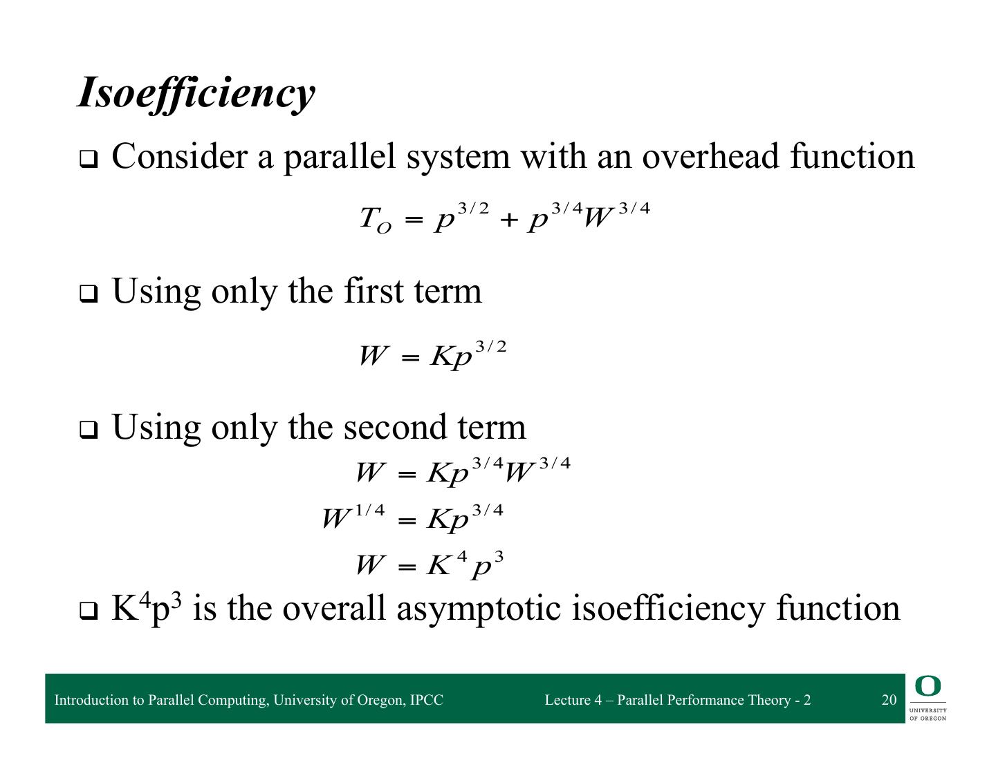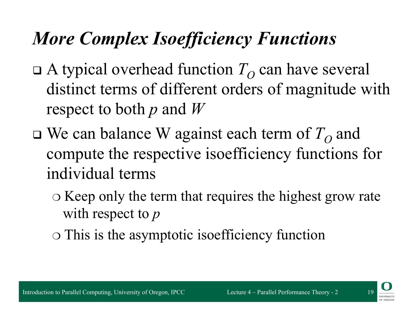 19 . More Complex Isoefficiency Functions q A typical overhead function TO can have several distinct terms of different orders of magnitude with respect to both p and W q We can balance W against each term of TO and compute the respective isoefficiency functions for individual terms ❍ Keep only the term that requires the highest grow rate with respect to p ❍ This is the asymptotic isoefficiency function Introduction to Parallel Computing, University of Oregon, IPCC Lecture 4 – Parallel Performance Theory - 2 19