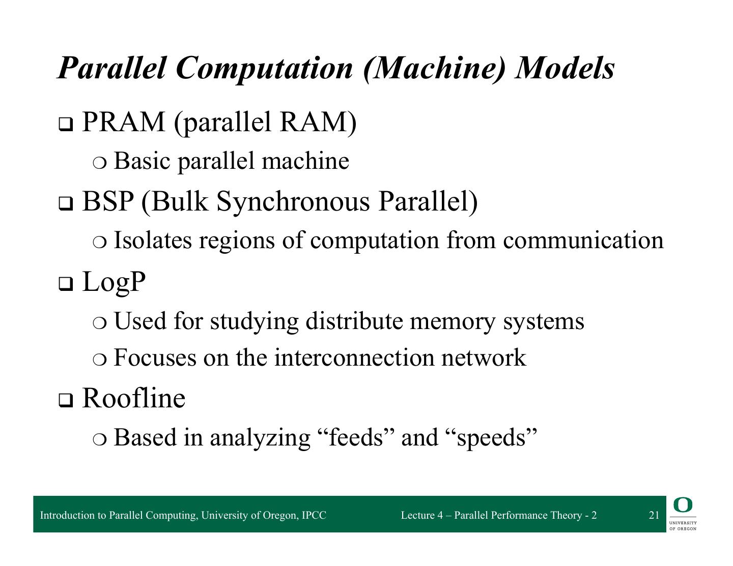 21 . Parallel Computation (Machine) Models q PRAM (parallel RAM) ❍ Basic parallel machine q BSP (Bulk Synchronous Parallel) ❍ Isolates regions of computation from communication q LogP ❍ Used for studying distribute memory systems ❍ Focuses on the interconnection network q Roofline ❍ Based in analyzing “feeds” and “speeds” Introduction to Parallel Computing, University of Oregon, IPCC Lecture 4 – Parallel Performance Theory - 2 21