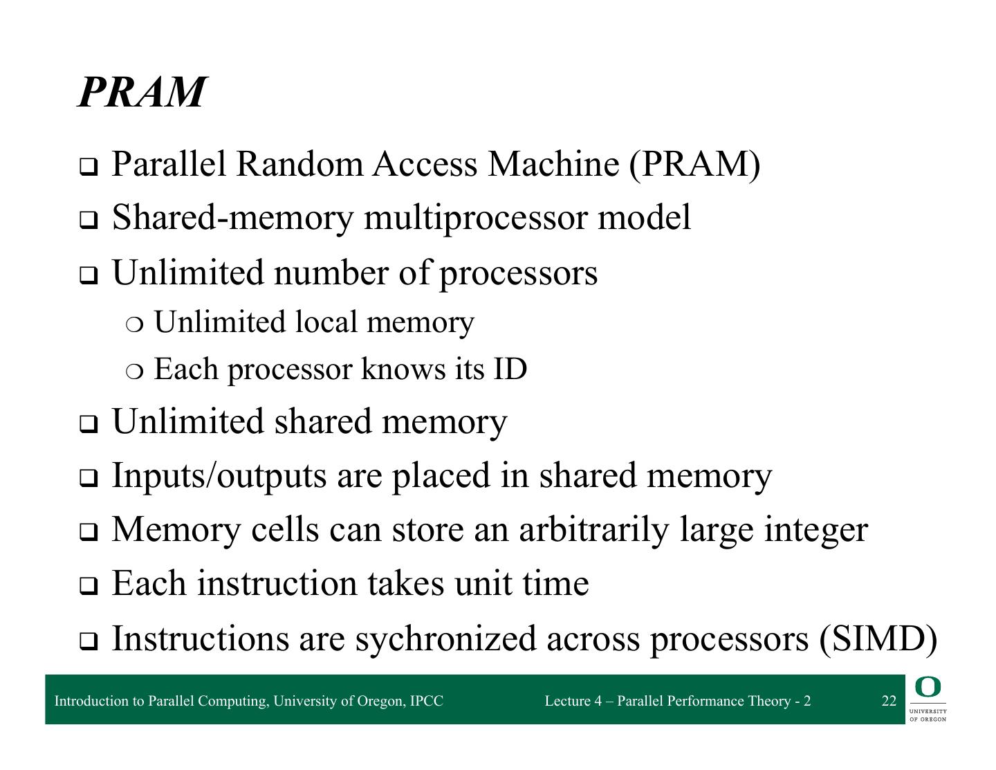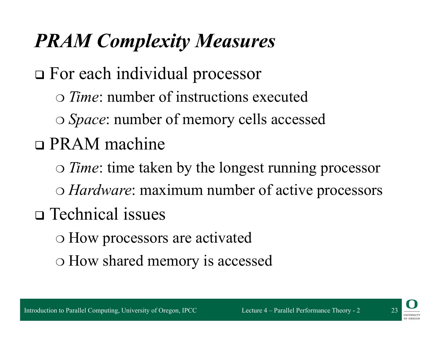 22 . PRAM q Parallel Random Access Machine (PRAM) q Shared-memory multiprocessor model q Unlimited number of processors ❍ Unlimited local memory ❍ Each processor knows its ID q Unlimited shared memory q Inputs/outputs are placed in shared memory q Memory cells can store an arbitrarily large integer q Each instruction takes unit time q Instructions are sychronized across processors (SIMD) Introduction to Parallel Computing, University of Oregon, IPCC Lecture 4 – Parallel Performance Theory - 2 22