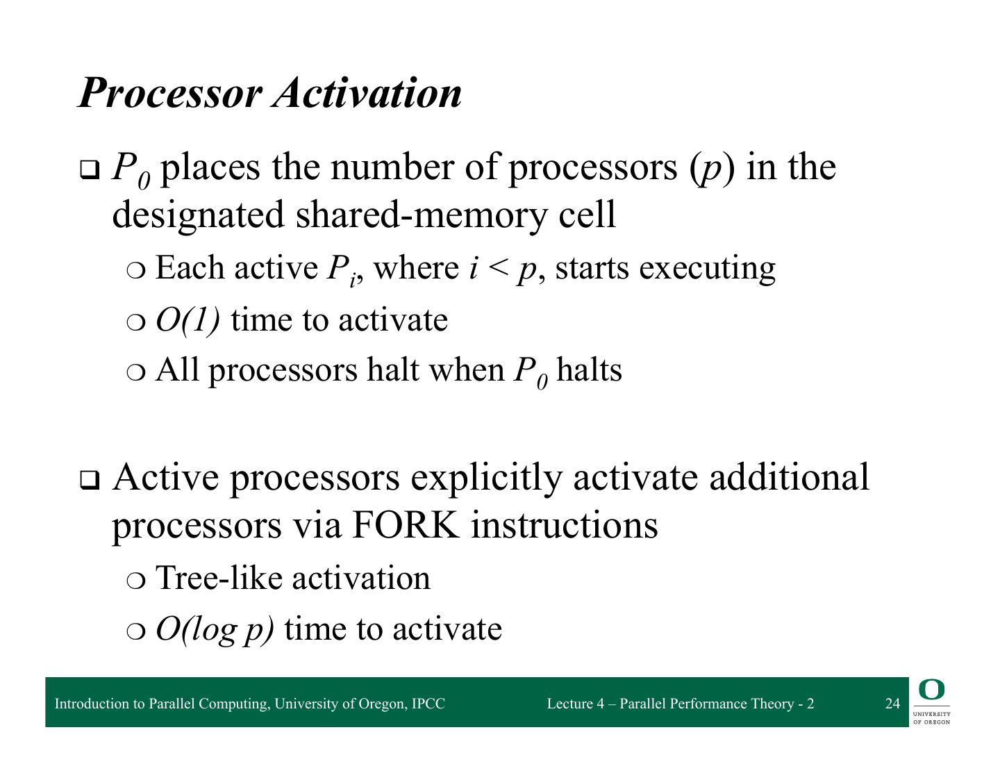 24 . Processor Activation q P0 places the number of processors (p) in the designated shared-memory cell ❍ Each active Pi, where i < p, starts executing ❍ O(1) time to activate ❍ All processors halt when P0 halts q Active processors explicitly activate additional processors via FORK instructions ❍ Tree-like activation ❍ O(log p) time to activate Introduction to Parallel Computing, University of Oregon, IPCC Lecture 4 – Parallel Performance Theory - 2 24
