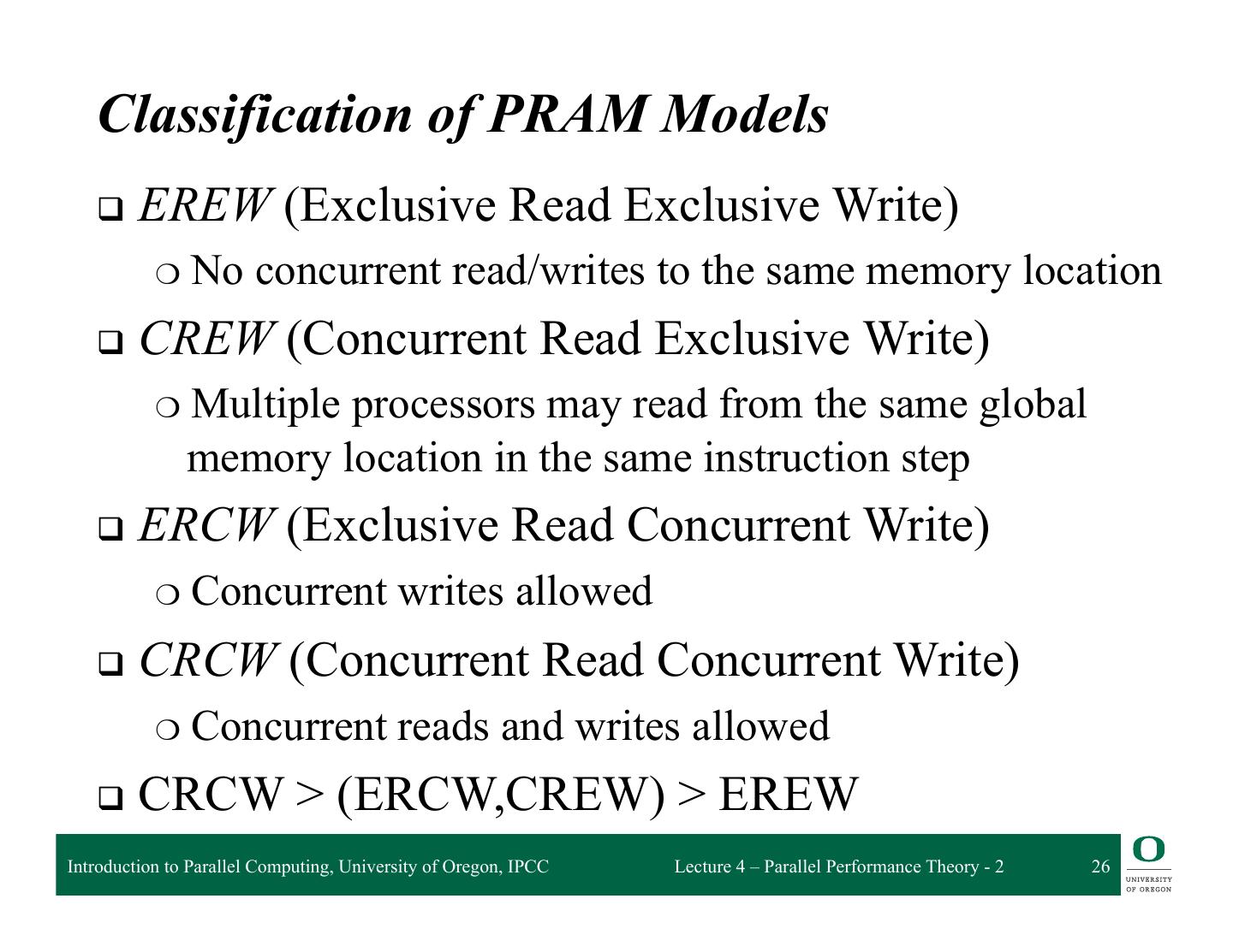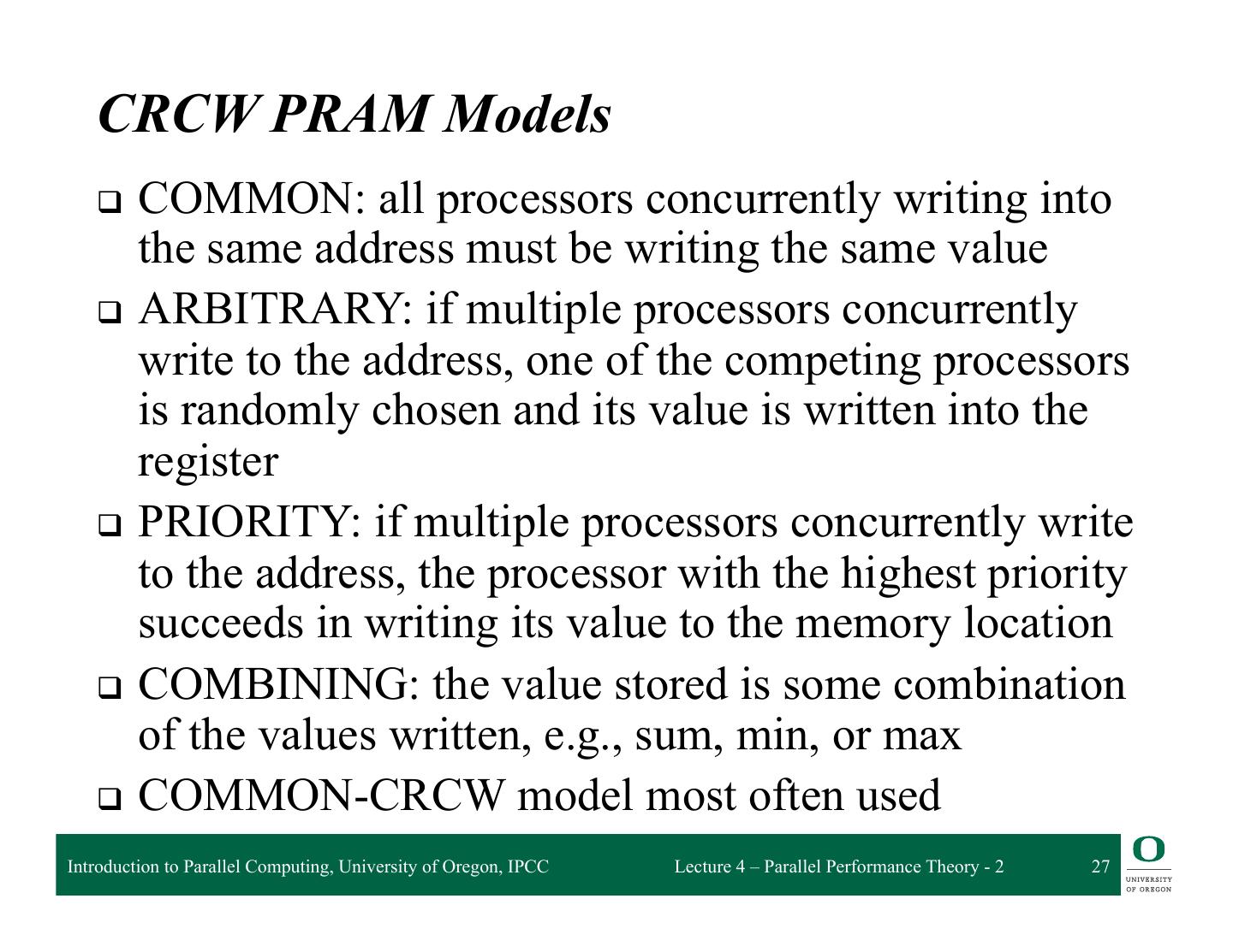 26 . Classification of PRAM Models q EREW (Exclusive Read Exclusive Write) ❍ No concurrent read/writes to the same memory location q CREW (Concurrent Read Exclusive Write) ❍ Multiple processors may read from the same global memory location in the same instruction step q ERCW (Exclusive Read Concurrent Write) ❍ Concurrent writes allowed q CRCW (Concurrent Read Concurrent Write) ❍ Concurrent reads and writes allowed q CRCW > (ERCW,CREW) > EREW Introduction to Parallel Computing, University of Oregon, IPCC Lecture 4 – Parallel Performance Theory - 2 26