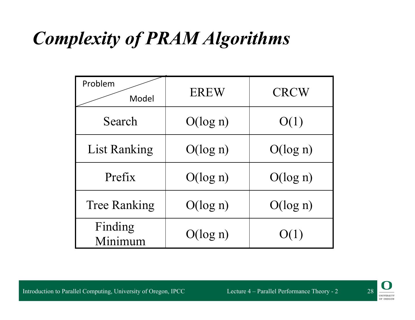 28 . Complexity of PRAM Algorithms Problem Model EREW CRCW Search O(log n) O(1) List Ranking O(log n) O(log n) Prefix O(log n) O(log n) Tree Ranking O(log n) O(log n) Finding O(log n) O(1) Minimum Introduction to Parallel Computing, University of Oregon, IPCC Lecture 4 – Parallel Performance Theory - 2 28