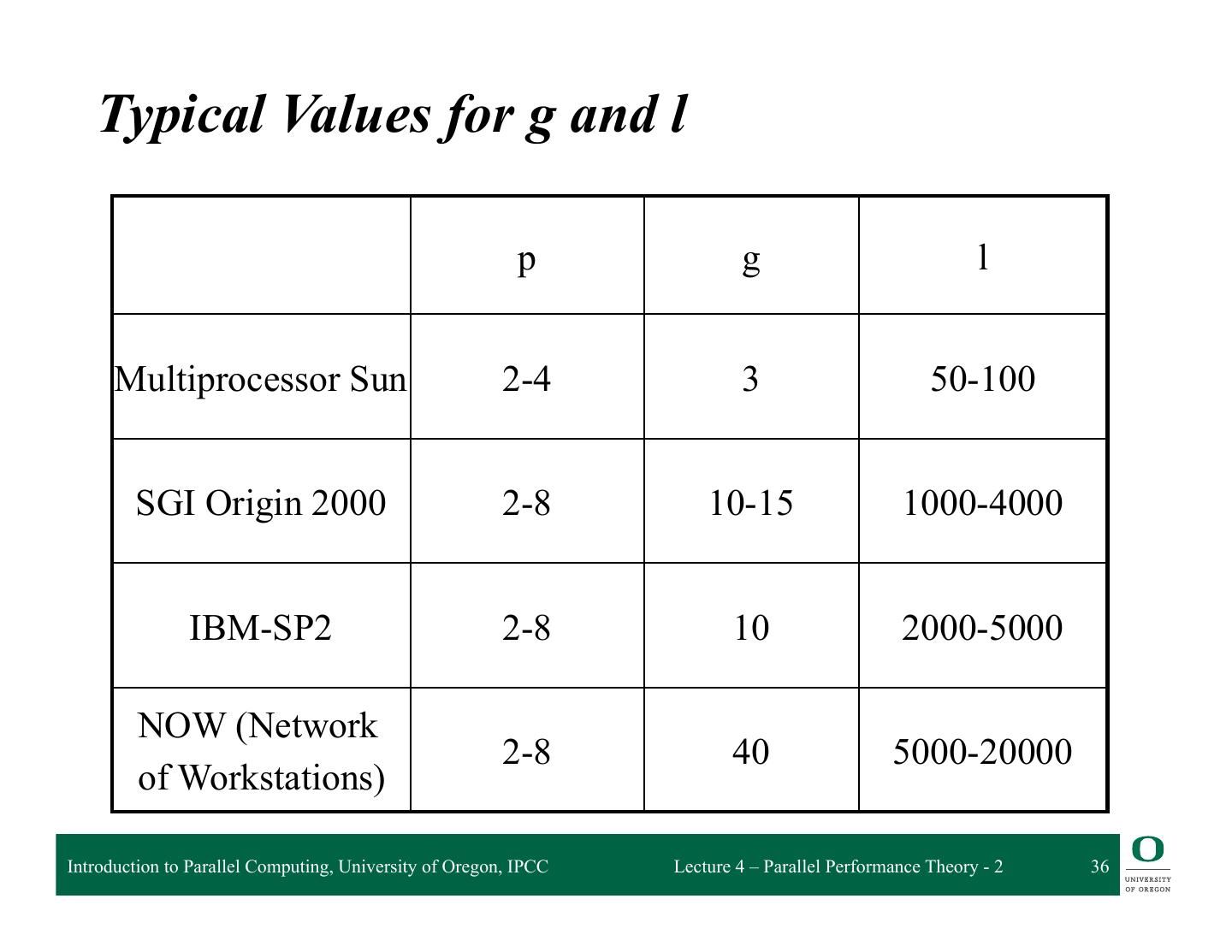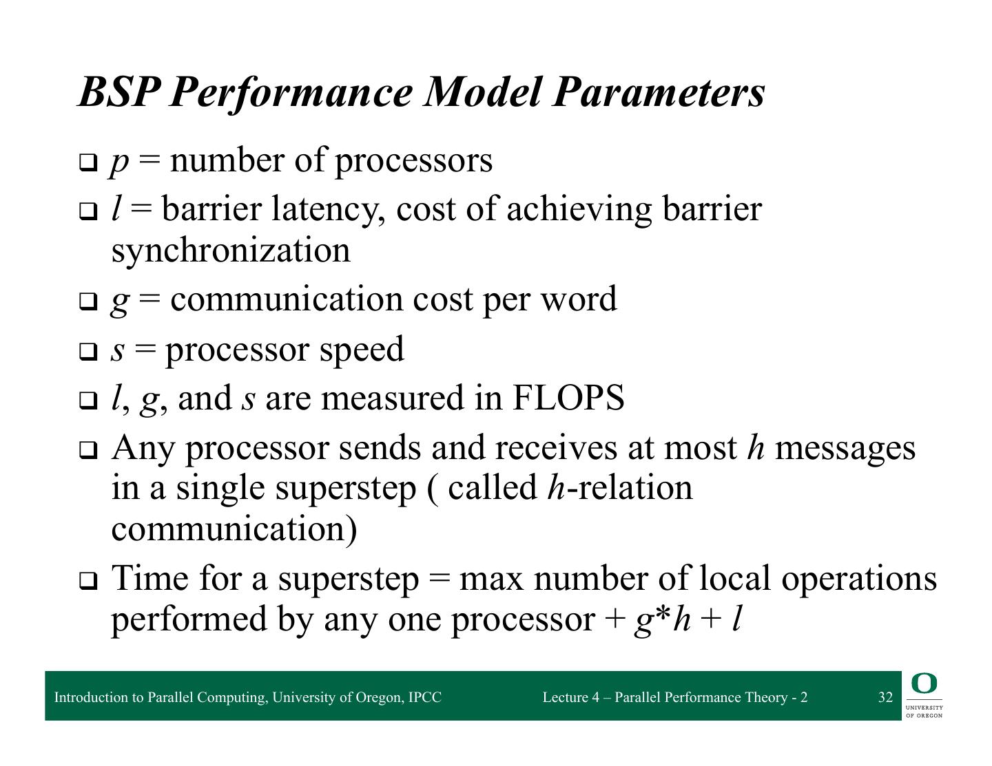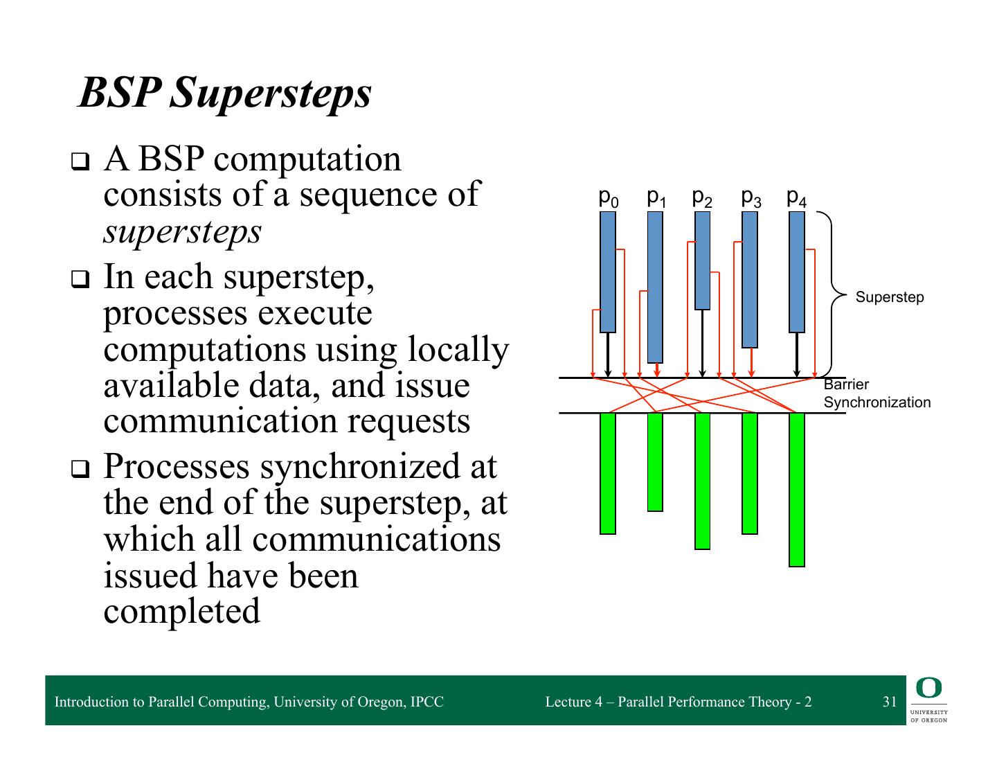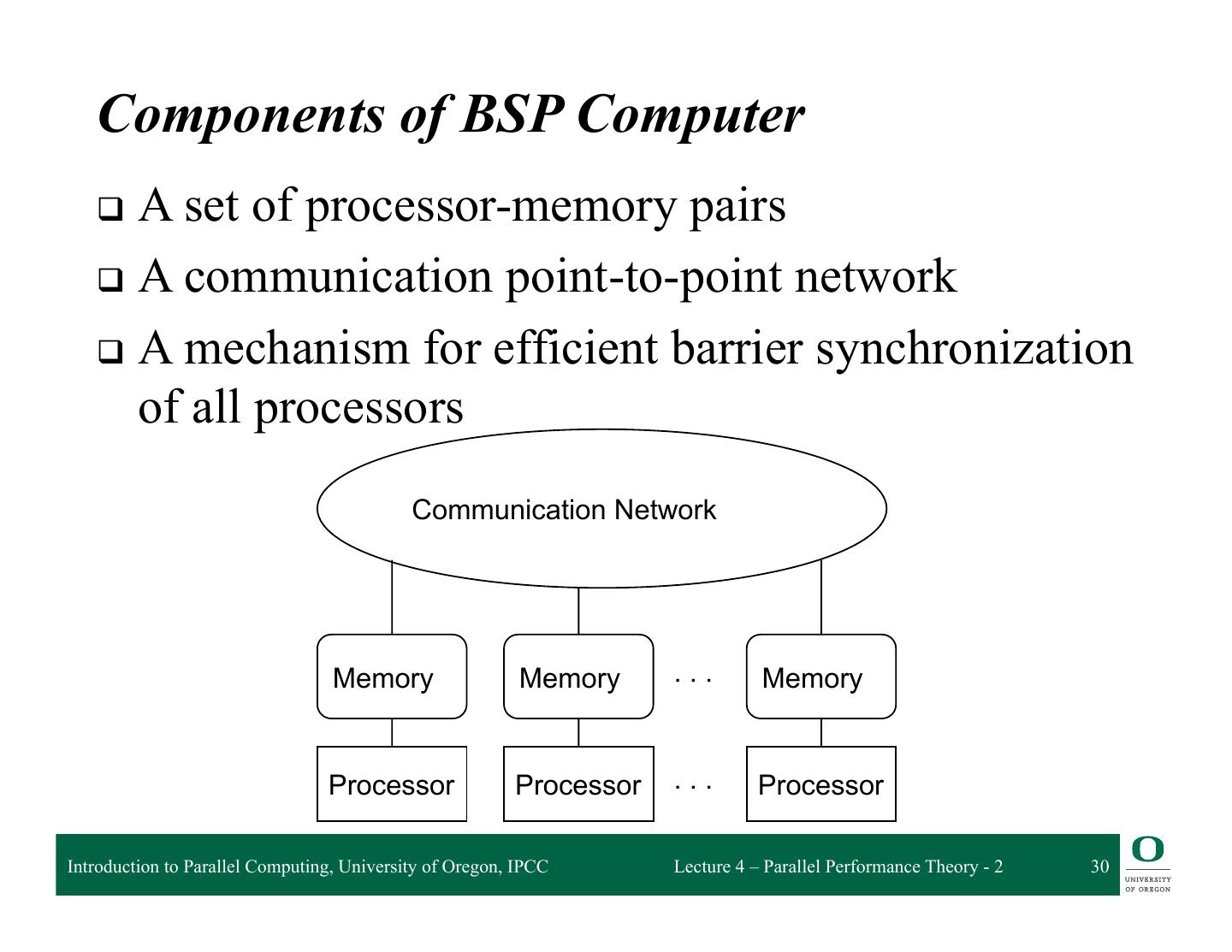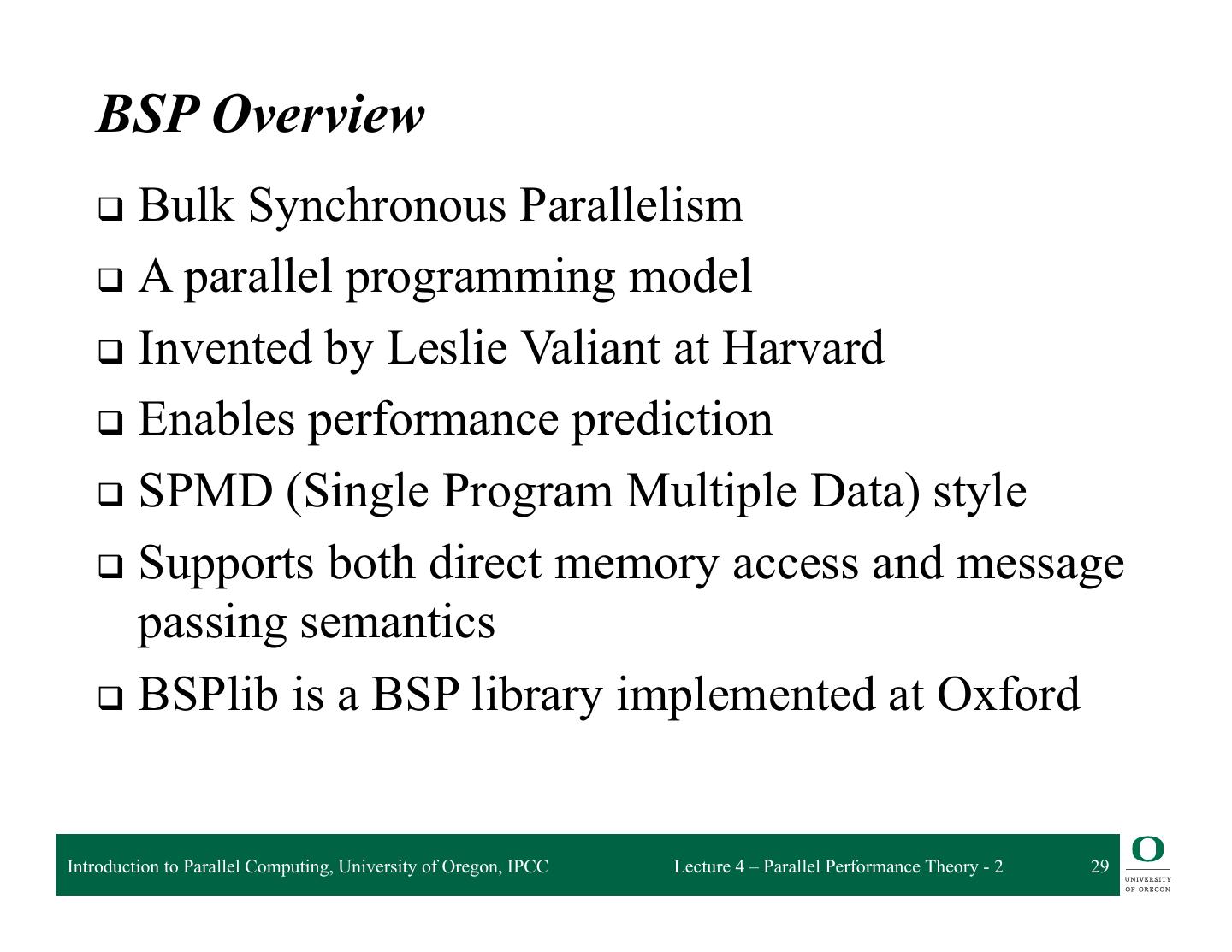 29 . BSP Overview q Bulk Synchronous Parallelism q A parallel programming model q Invented by Leslie Valiant at Harvard q Enables performance prediction q SPMD (Single Program Multiple Data) style q Supports both direct memory access and message passing semantics q BSPlib is a BSP library implemented at Oxford Introduction to Parallel Computing, University of Oregon, IPCC Lecture 4 – Parallel Performance Theory - 2 29