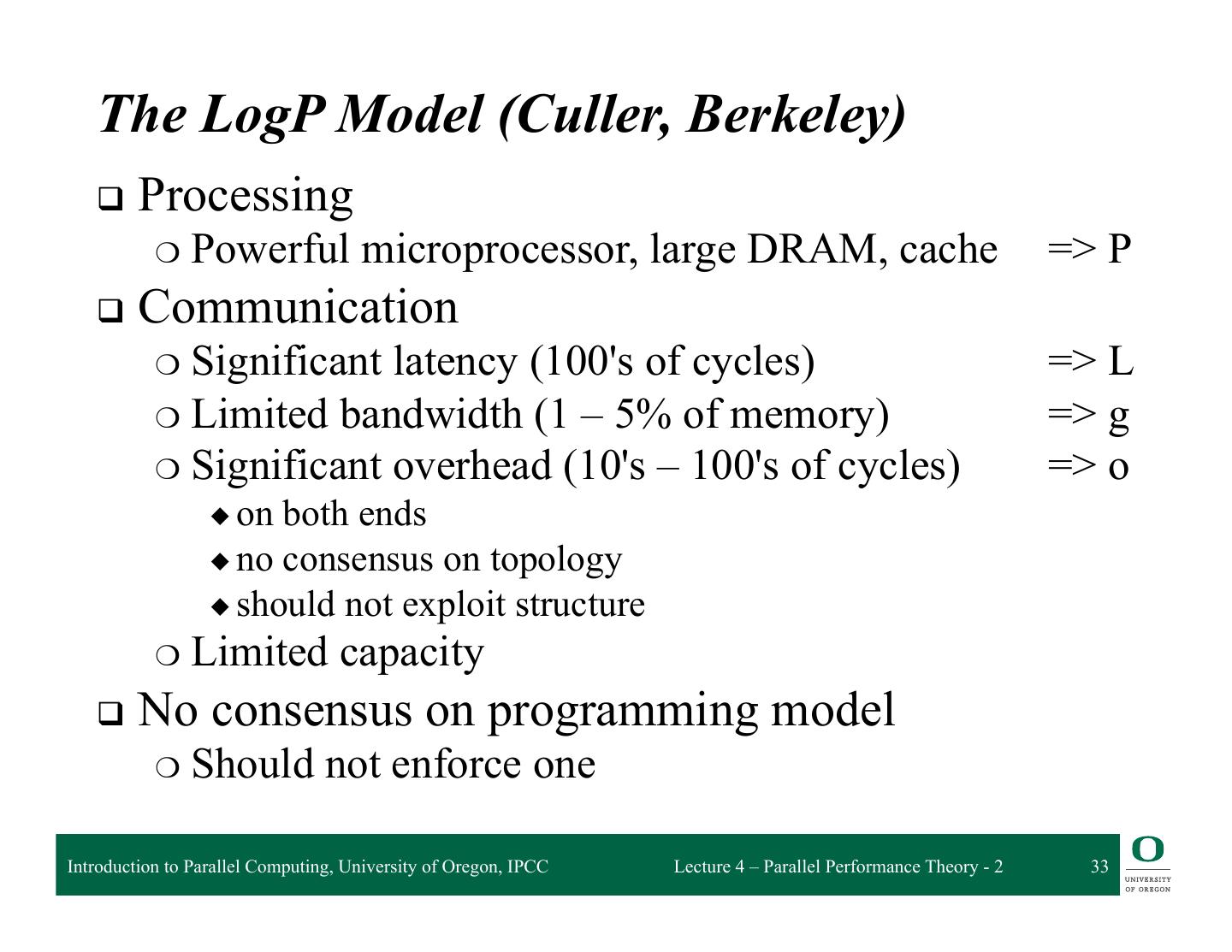 25 . PRAM is a Theoretical (Unfeasible) Model q Interconnection network between processors and memory would require a very large amount of area q The message-routing on the interconnection network would require time proportional to network size q Algorithm’s designers can forget the communication problems and focus their attention on the parallel computation only q There exist algorithms simulating any PRAM algorithm on bounded degree networks q Design general algorithms for the PRAM model and simulate them on a feasible network Introduction to Parallel Computing, University of Oregon, IPCC Lecture 4 – Parallel Performance Theory - 2 25