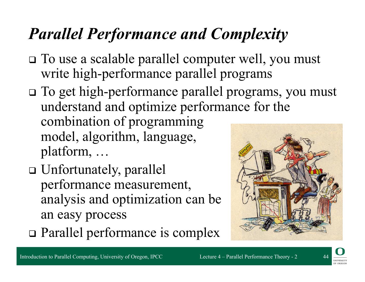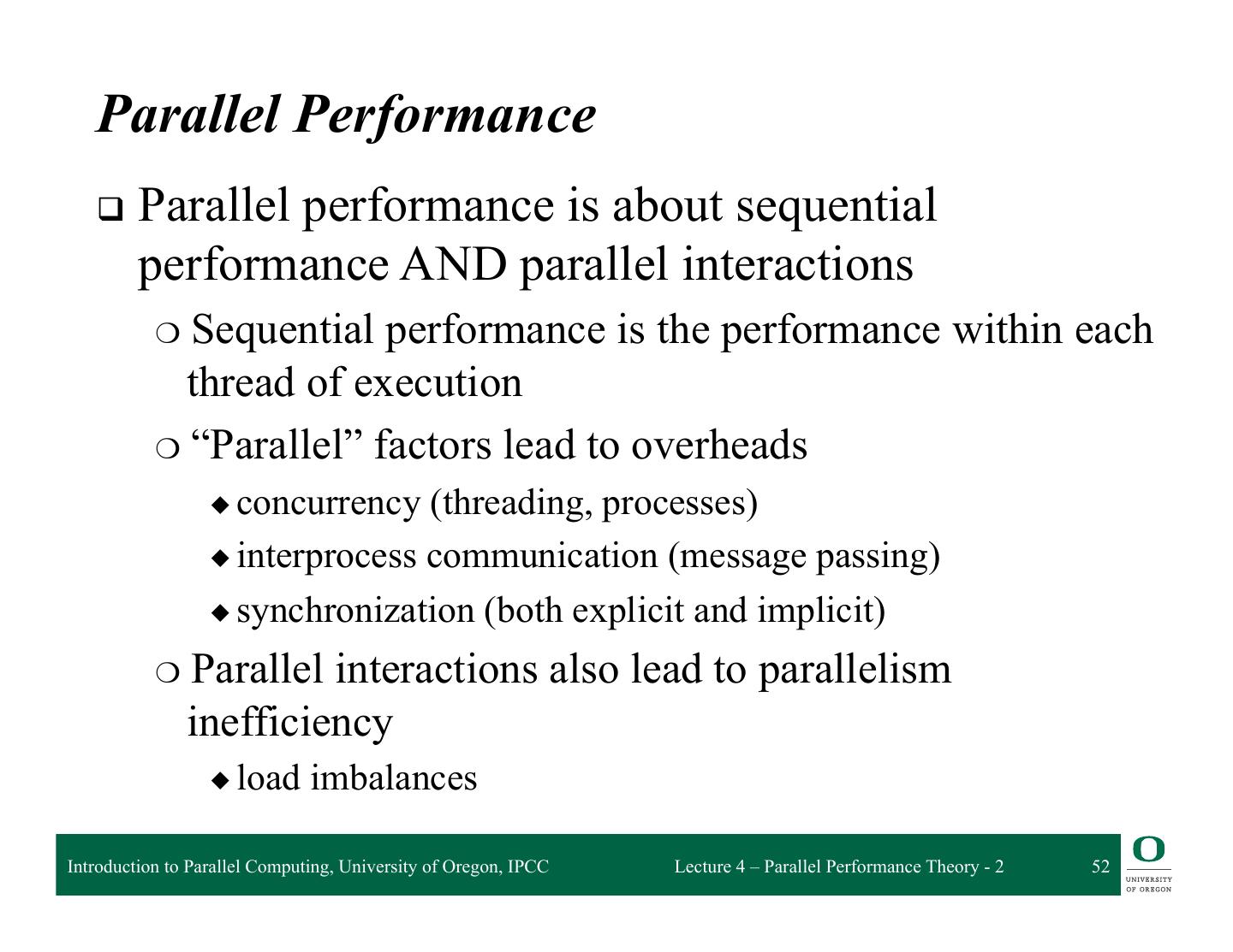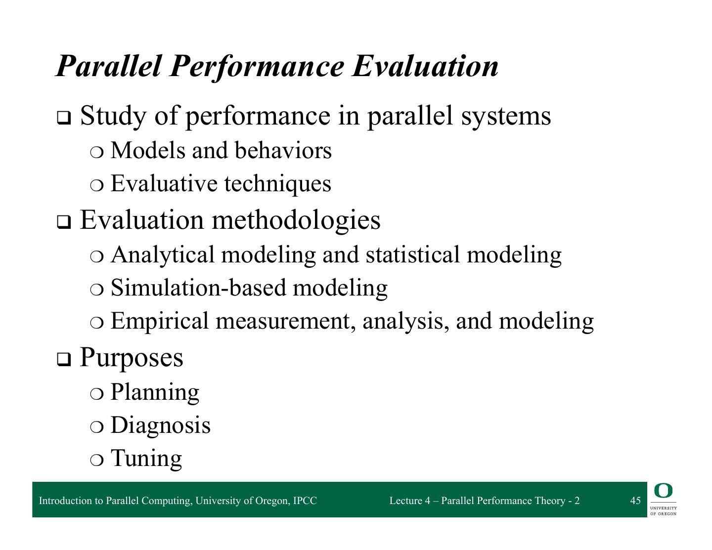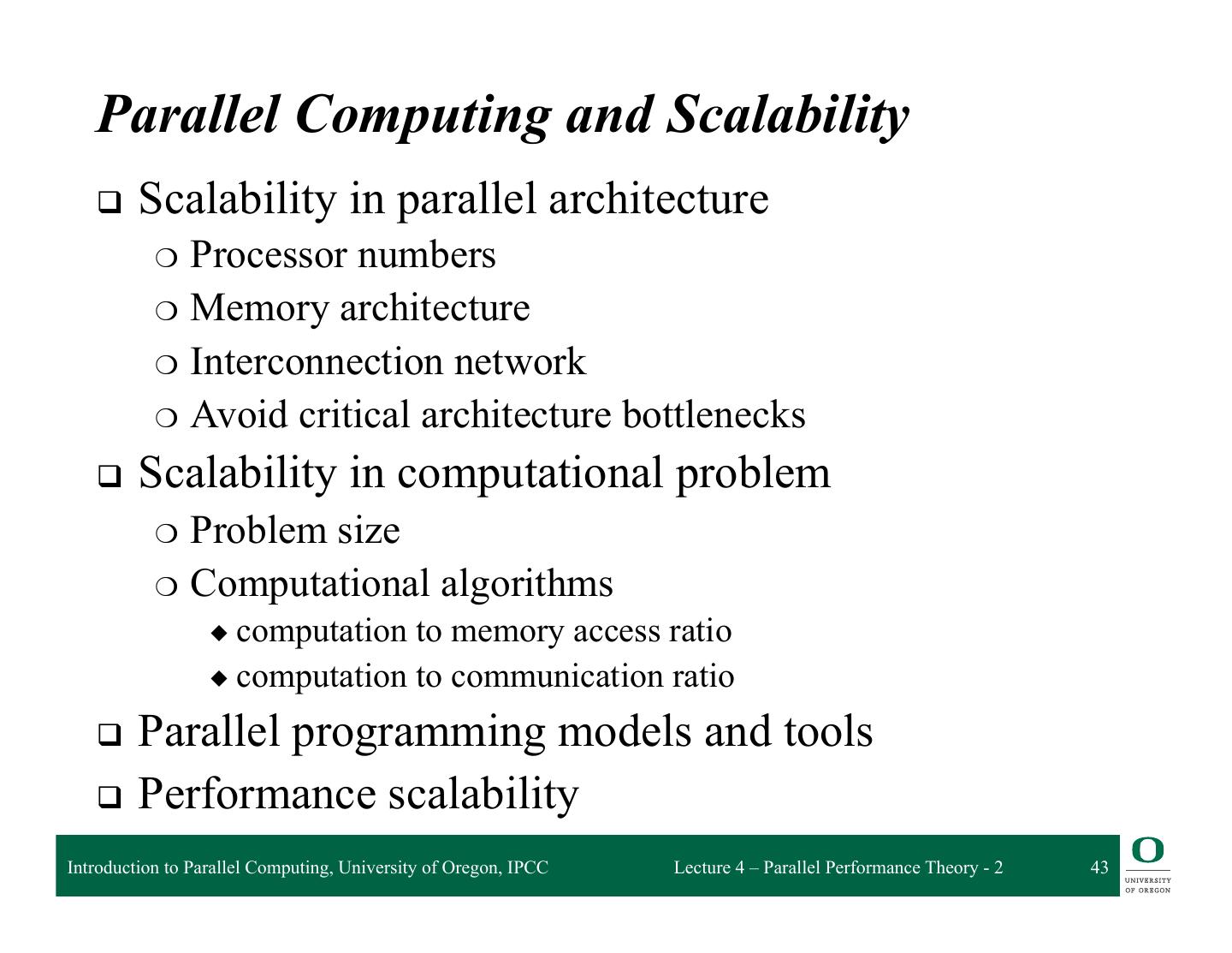 3 . Scalable Parallel Computing q Scalability in parallel architecture ❍ Processor numbers ❍ Memory architecture ❍ Interconnection network ❍ Avoid critical architecture bottlenecks q Scalability in computational problem ❍ Problemsize ❍ Computational algorithms ◆ Computation to memory access ratio ◆ Computation to communication ratio q Parallel programming models and tools q Performance scalability Introduction to Parallel Computing, University of Oregon, IPCC Lecture 4 – Parallel Performance Theory - 2 3