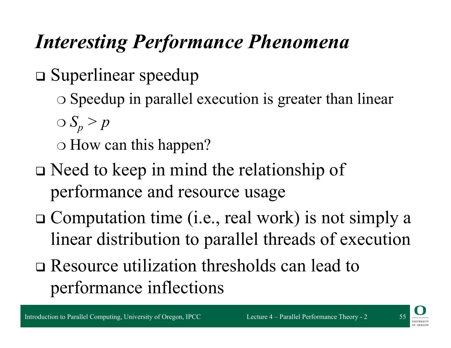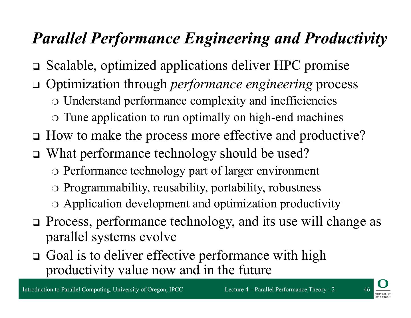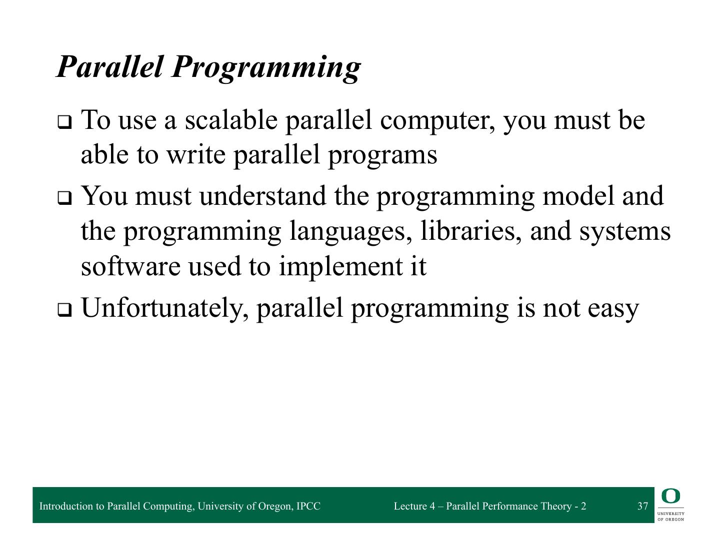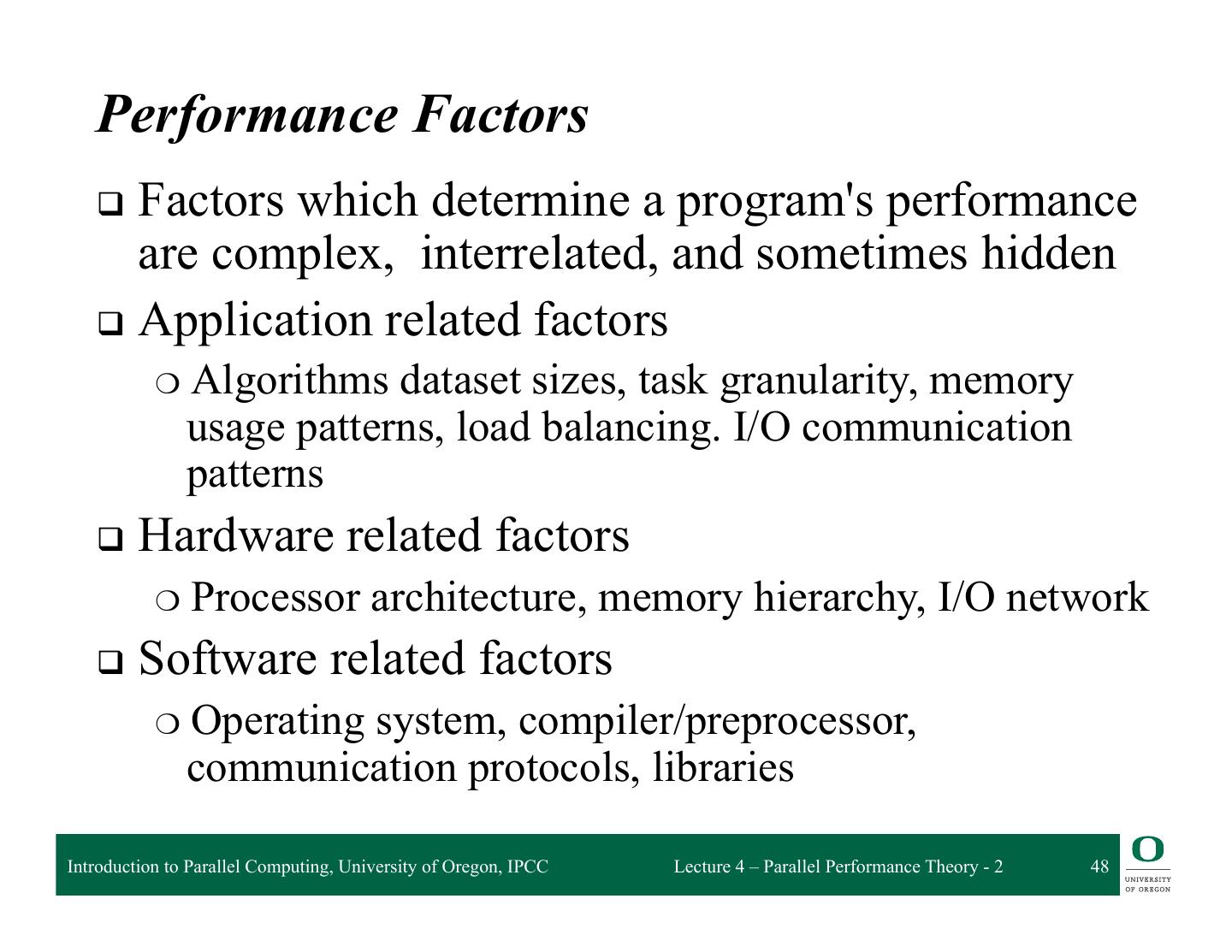 3 . Scalable Parallel Computing q Scalability in parallel architecture ❍ Processor numbers ❍ Memory architecture ❍ Interconnection network ❍ Avoid critical architecture bottlenecks q Scalability in computational problem ❍ Problemsize ❍ Computational algorithms ◆ Computation to memory access ratio ◆ Computation to communication ratio q Parallel programming models and tools q Performance scalability Introduction to Parallel Computing, University of Oregon, IPCC Lecture 4 – Parallel Performance Theory - 2 3