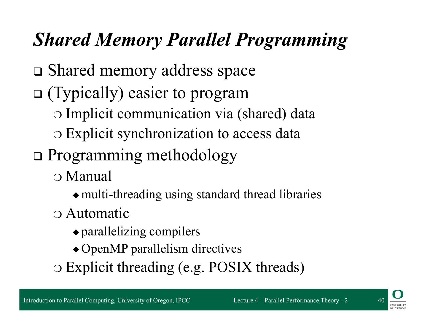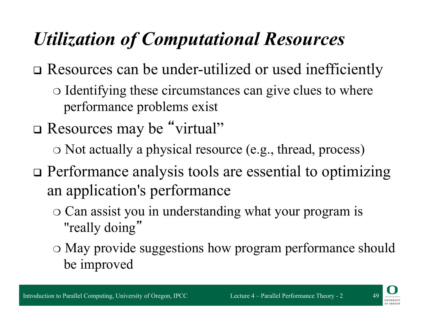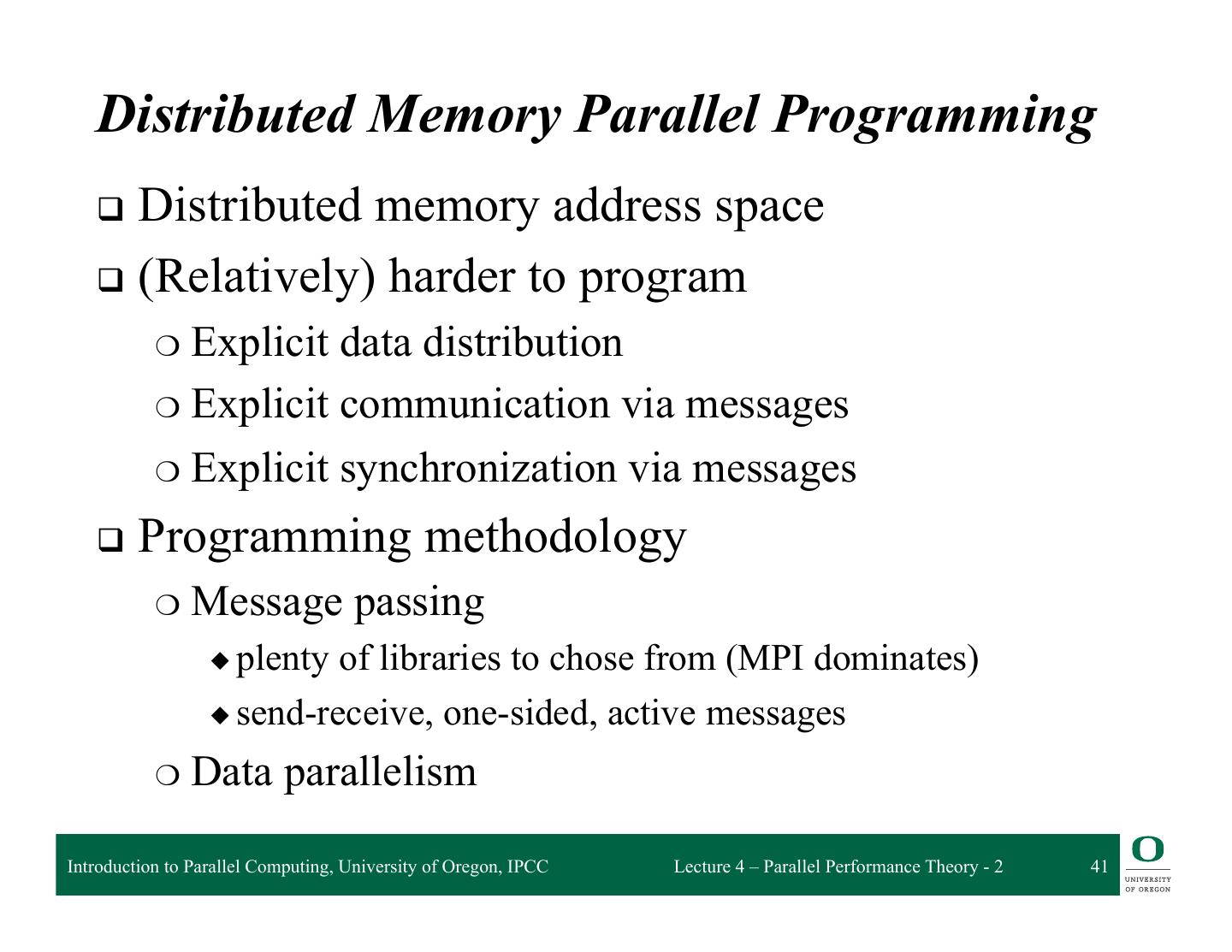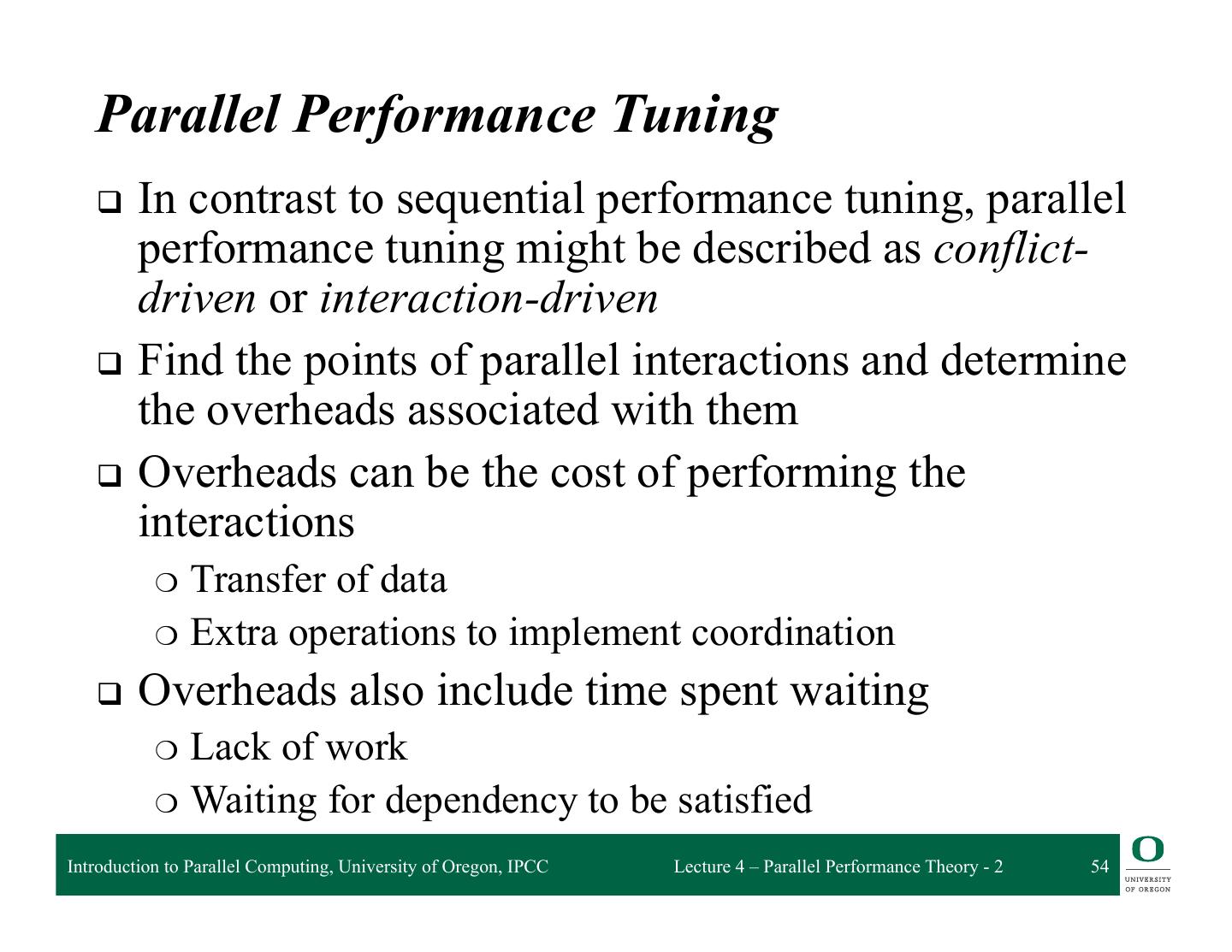 3 . Scalable Parallel Computing q Scalability in parallel architecture ❍ Processor numbers ❍ Memory architecture ❍ Interconnection network ❍ Avoid critical architecture bottlenecks q Scalability in computational problem ❍ Problemsize ❍ Computational algorithms ◆ Computation to memory access ratio ◆ Computation to communication ratio q Parallel programming models and tools q Performance scalability Introduction to Parallel Computing, University of Oregon, IPCC Lecture 4 – Parallel Performance Theory - 2 3
