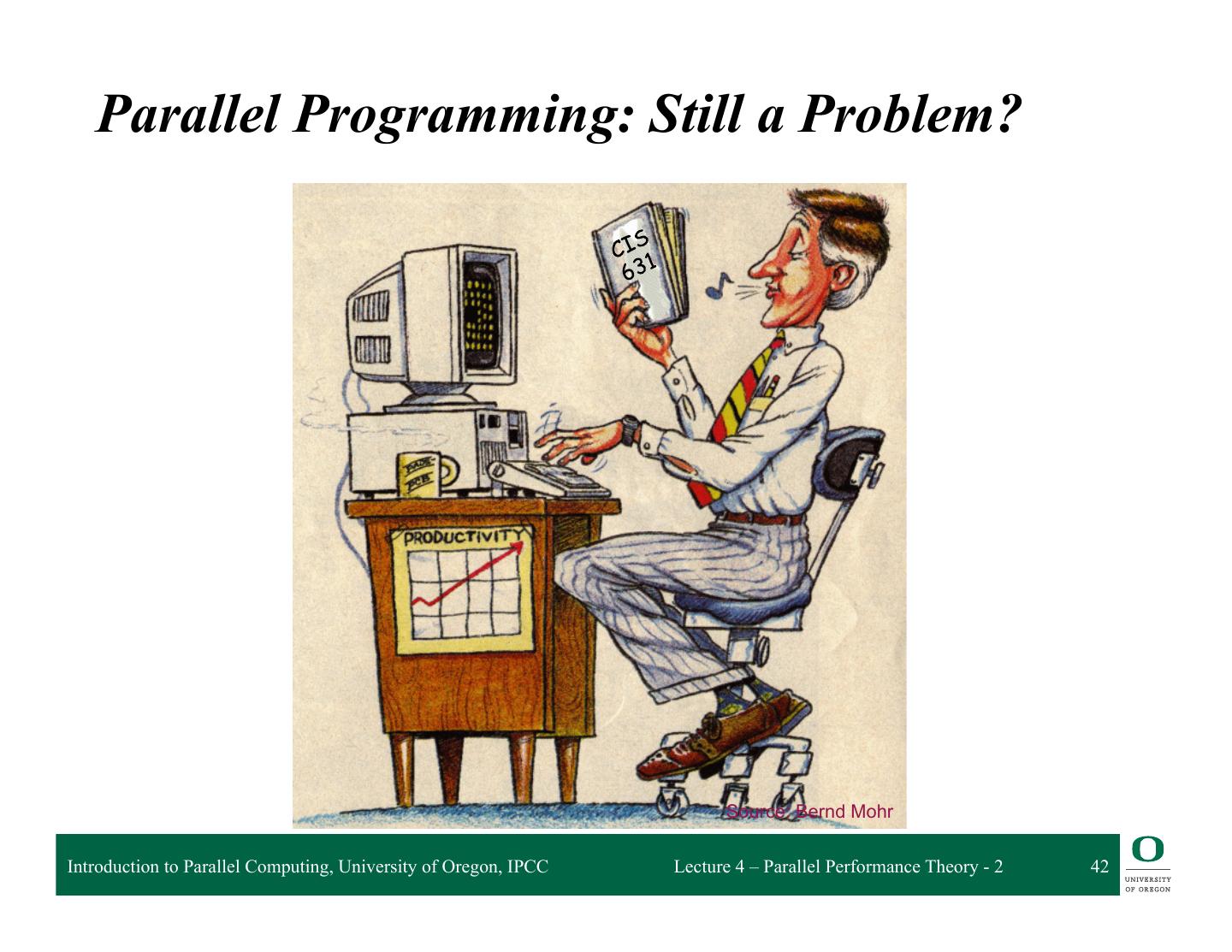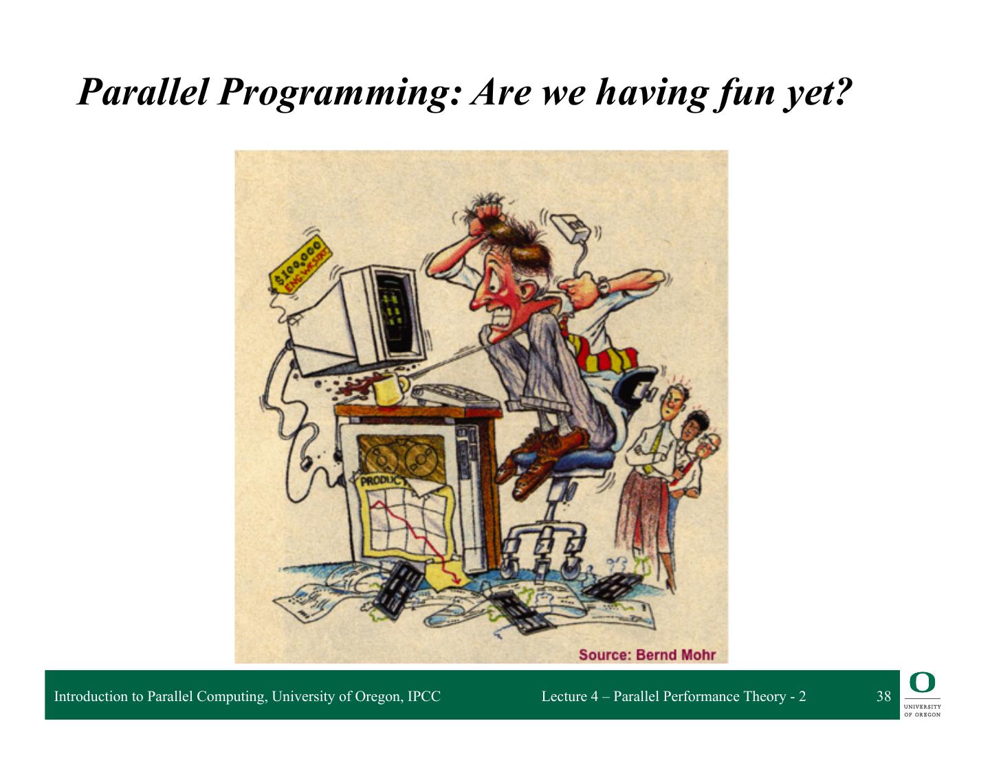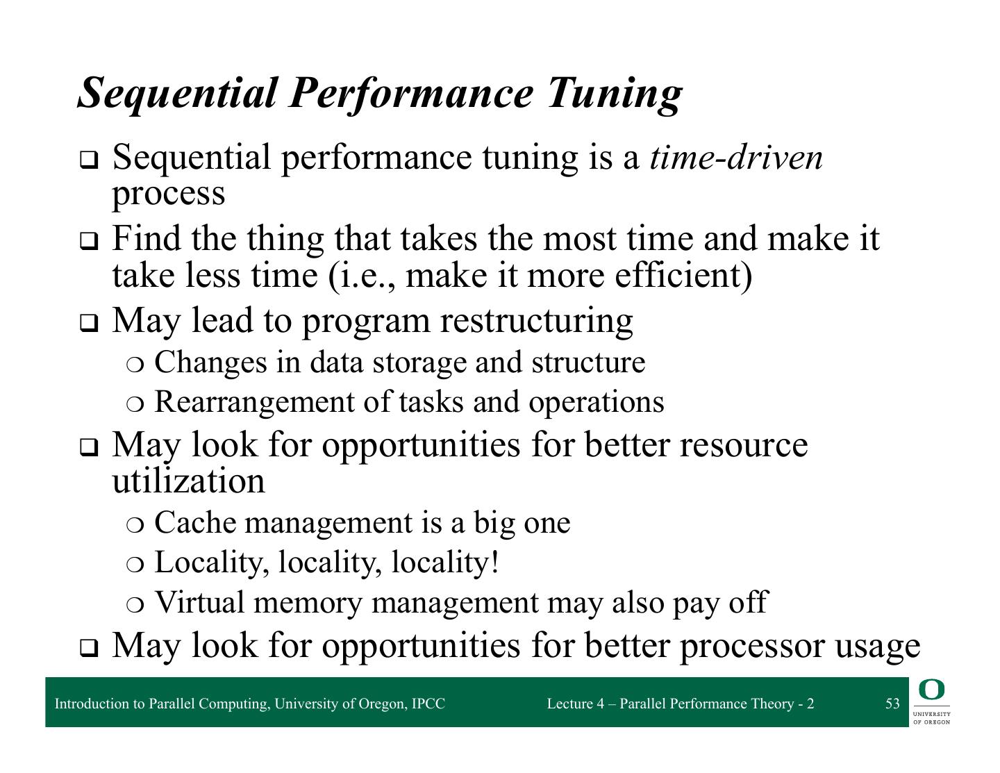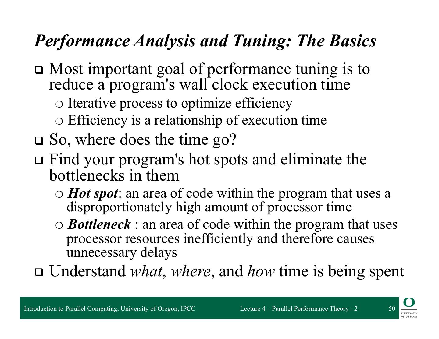 3 . Scalable Parallel Computing q Scalability in parallel architecture ❍ Processor numbers ❍ Memory architecture ❍ Interconnection network ❍ Avoid critical architecture bottlenecks q Scalability in computational problem ❍ Problemsize ❍ Computational algorithms ◆ Computation to memory access ratio ◆ Computation to communication ratio q Parallel programming models and tools q Performance scalability Introduction to Parallel Computing, University of Oregon, IPCC Lecture 4 – Parallel Performance Theory - 2 3