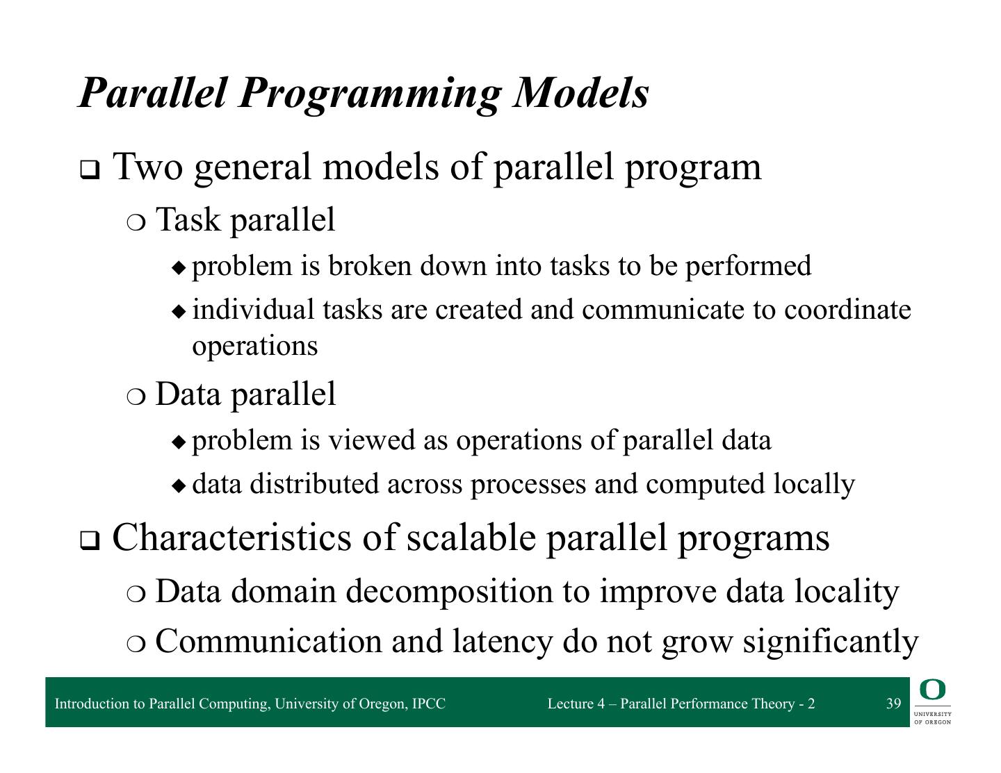 2 . Outline q Scalable parallel execution q Parallel execution models q Isoefficiency q Parallel machine models q Parallel performance engineering Introduction to Parallel Computing, University of Oregon, IPCC Lecture 4 – Parallel Performance Theory - 2 2