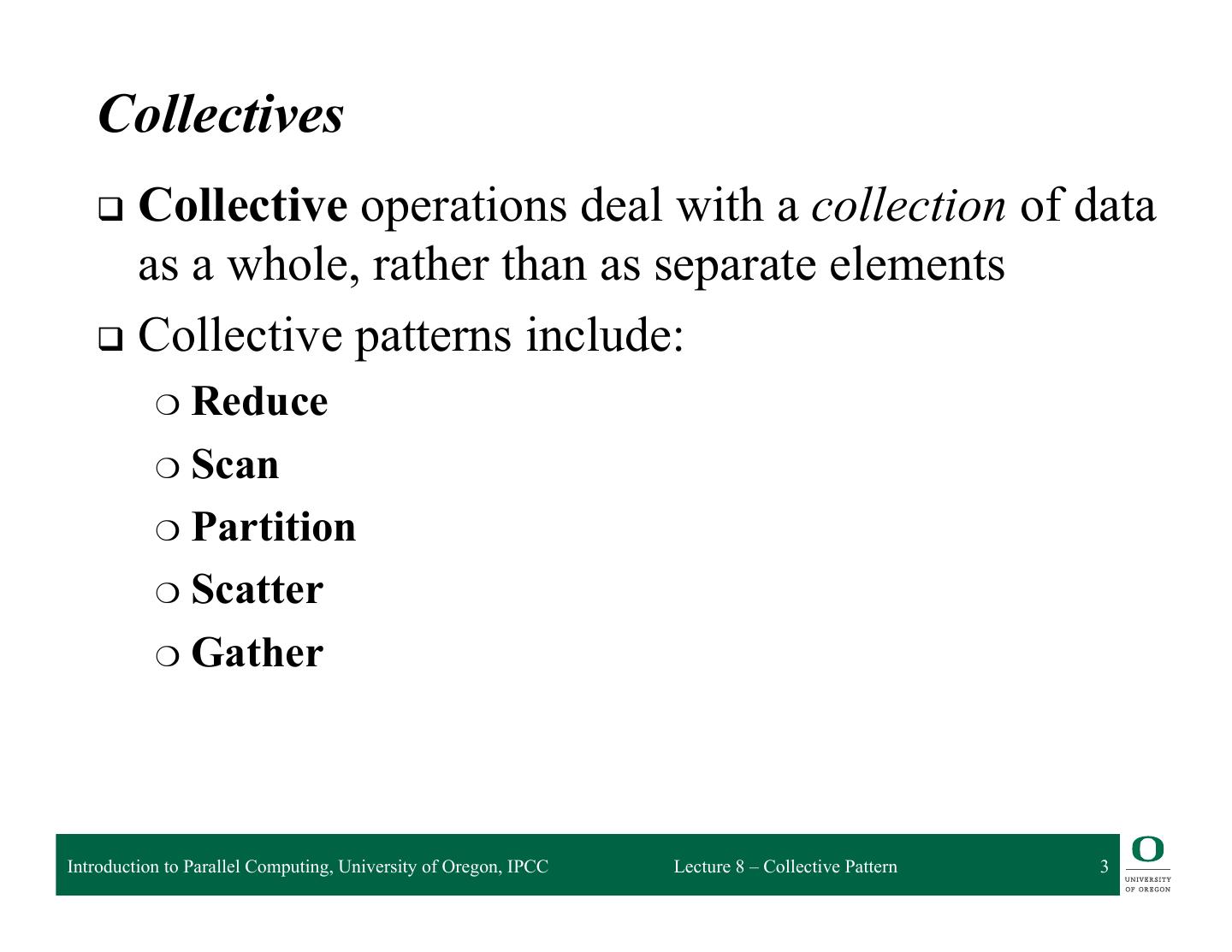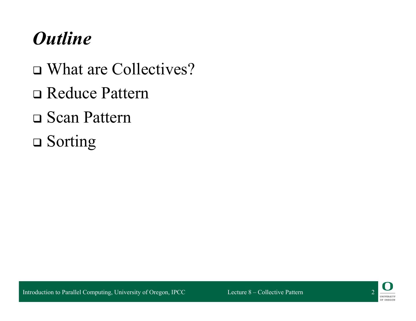2 . Outline q What are Collectives? q Reduce Pattern q Scan Pattern q Sorting Introduction to Parallel Computing, University of Oregon, IPCC Lecture 8 – Collective Pattern 2