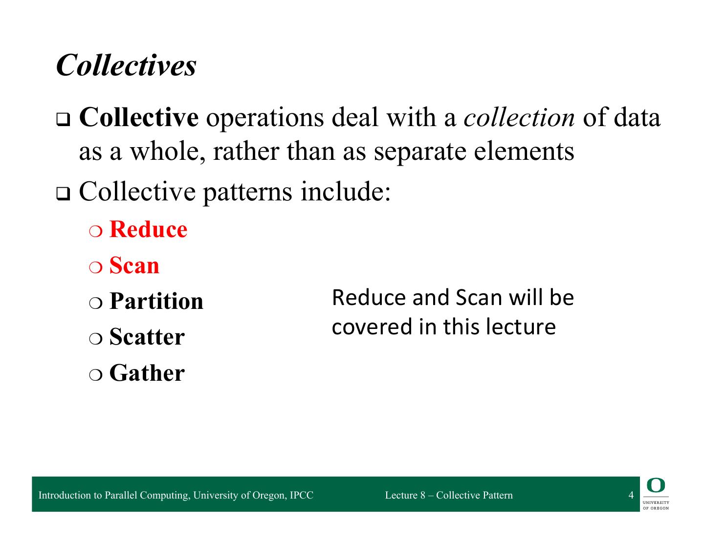 3 . Collectives q Collective operations deal with a collection of data as a whole, rather than as separate elements q Collective patterns include: ❍ Reduce ❍ Scan ❍ Partition ❍ Scatter ❍ Gather Introduction to Parallel Computing, University of Oregon, IPCC Lecture 8 – Collective Pattern 3
