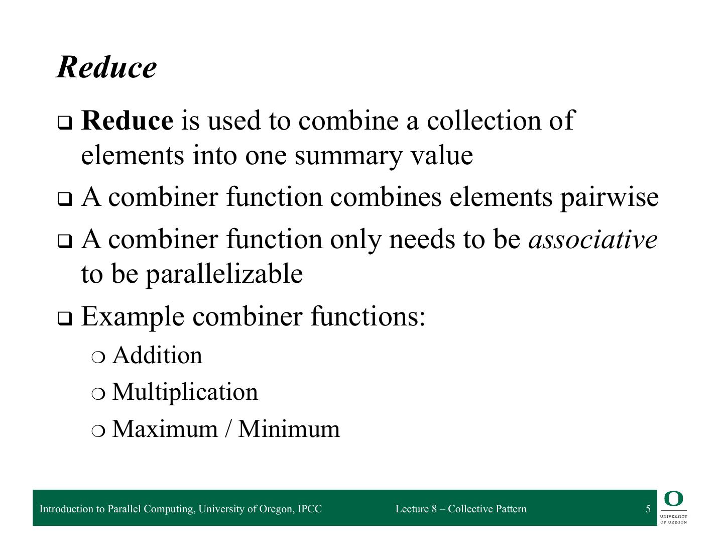 5 . Reduce q Reduce is used to combine a collection of elements into one summary value q A combiner function combines elements pairwise q A combiner function only needs to be associative to be parallelizable q Example combiner functions: ❍ Addition ❍ Multiplication ❍ Maximum / Minimum Introduction to Parallel Computing, University of Oregon, IPCC Lecture 8 – Collective Pattern 5