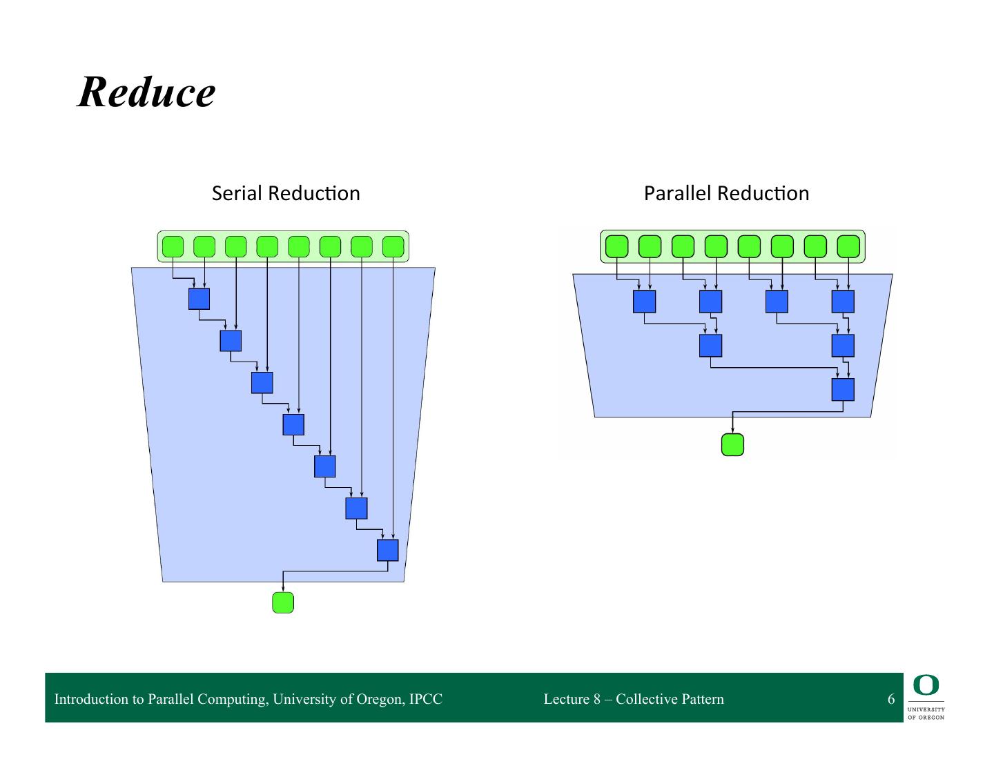 6 . Reduce Serial Reduc4on Parallel Reduc4on Introduction to Parallel Computing, University of Oregon, IPCC Lecture 8 – Collective Pattern 6