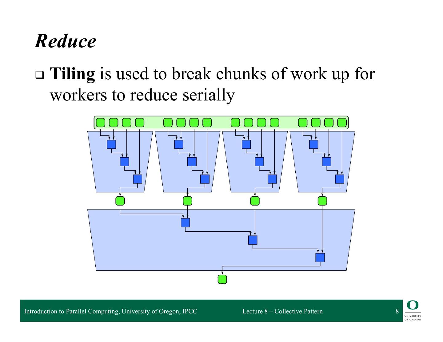 8 . Reduce q Tiling is used to break chunks of work up for workers to reduce serially Introduction to Parallel Computing, University of Oregon, IPCC Lecture 8 – Collective Pattern 8