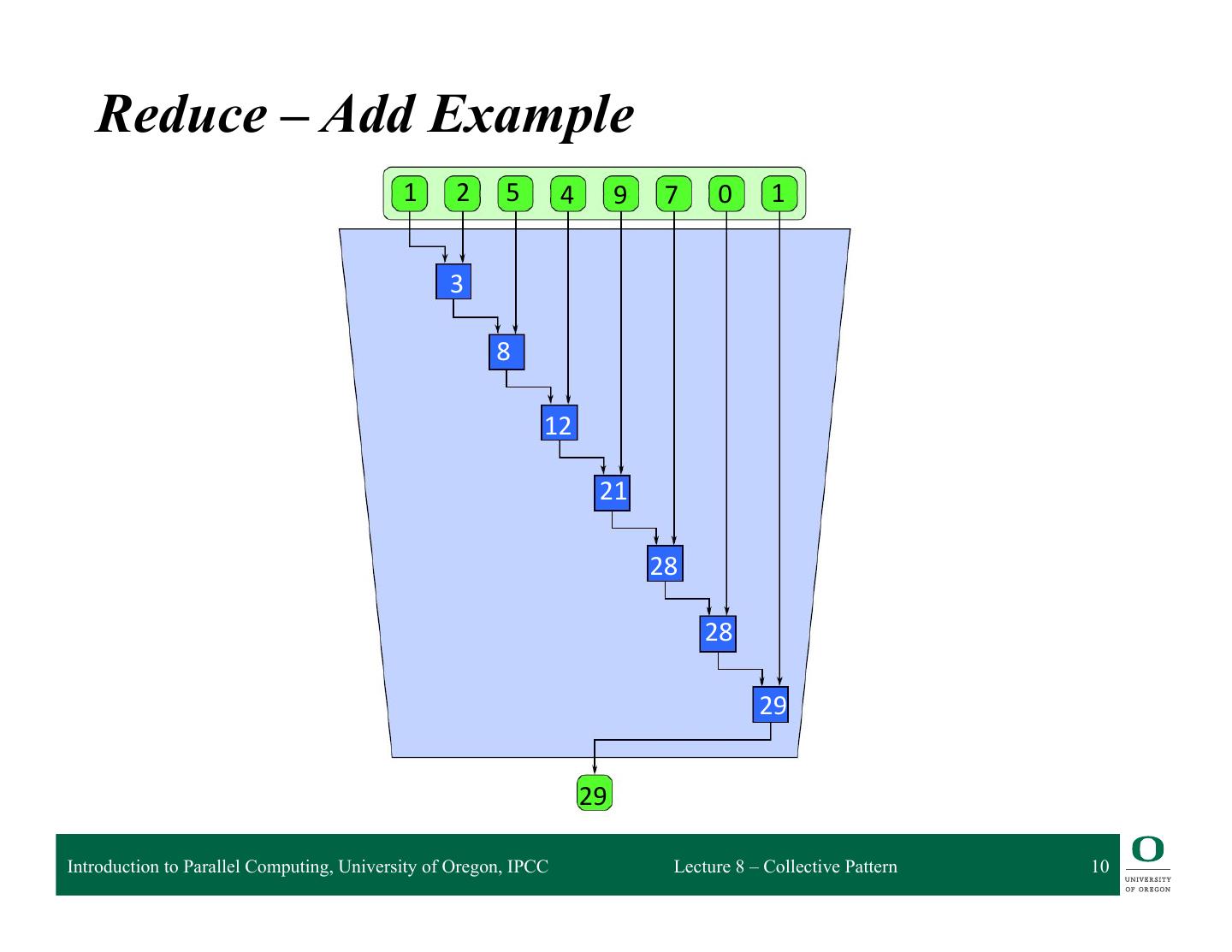 10 . Reduce – Add Example 1 2 5 4 9 7 0 1 3 8 12 21 28 28 29 29 Introduction to Parallel Computing, University of Oregon, IPCC Lecture 8 – Collective Pattern 10
