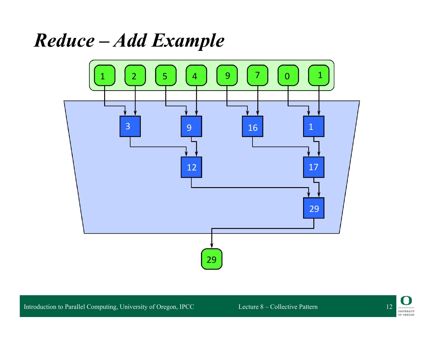 11 . Reduce – Add Example 1 2 5 4 9 7 0 1 Introduction to Parallel Computing, University of Oregon, IPCC Lecture 8 – Collective Pattern 11