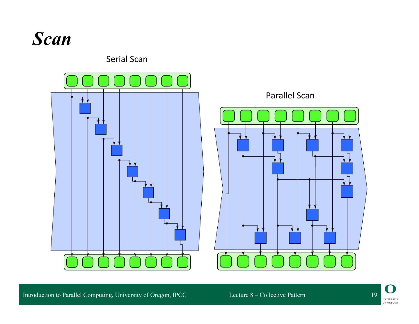 19 . Scan Serial Scan Parallel Scan Introduction to Parallel Computing, University of Oregon, IPCC Lecture 8 – Collective Pattern 19