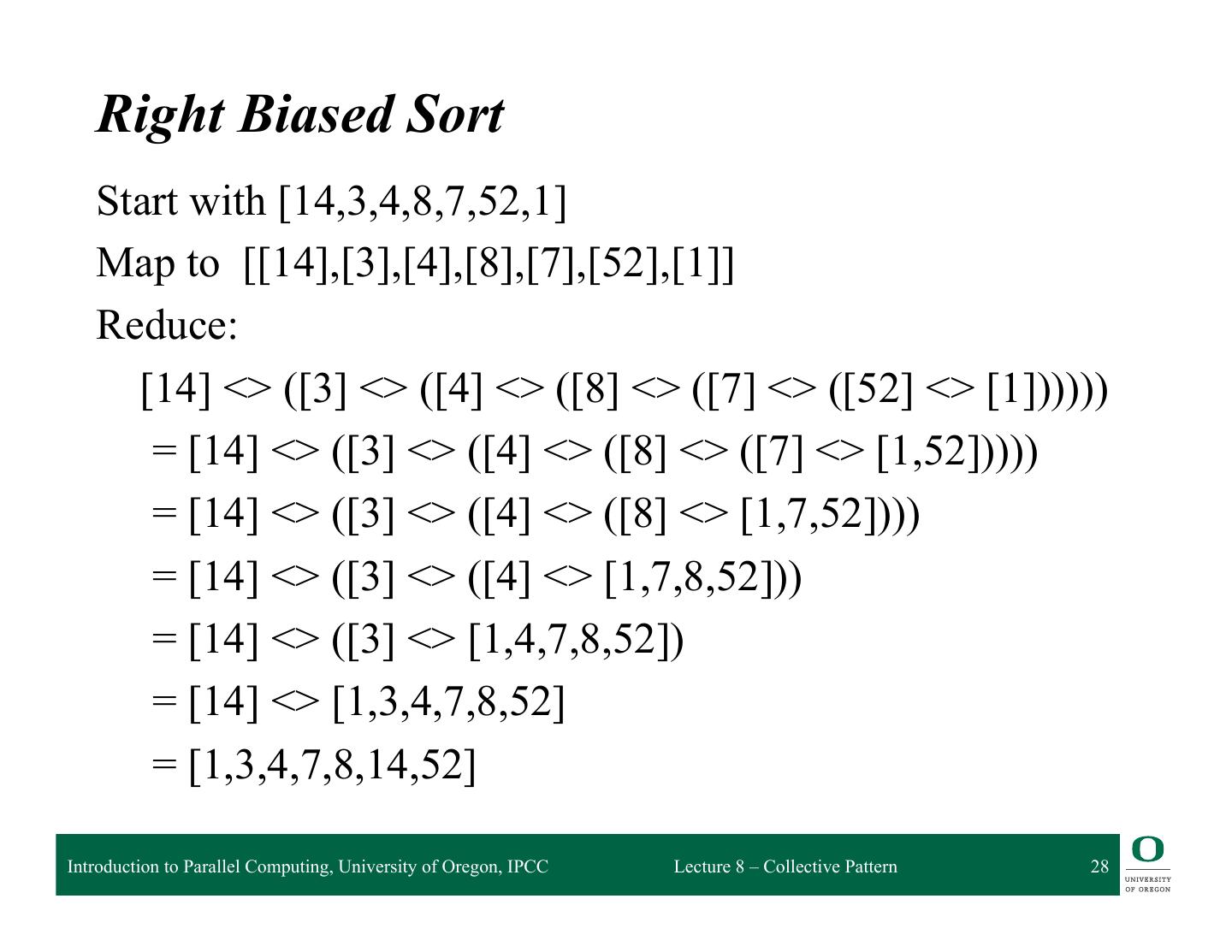 28 . Right Biased Sort Start with [14,3,4,8,7,52,1] Map to [[14],[3],[4],[8],[7],[52],[1]] Reduce: [14] <> ([3] <> ([4] <> ([8] <> ([7] <> ([52] <> [1]))))) = [14] <> ([3] <> ([4] <> ([8] <> ([7] <> [1,52])))) = [14] <> ([3] <> ([4] <> ([8] <> [1,7,52]))) = [14] <> ([3] <> ([4] <> [1,7,8,52])) = [14] <> ([3] <> [1,4,7,8,52]) = [14] <> [1,3,4,7,8,52] = [1,3,4,7,8,14,52] Introduction to Parallel Computing, University of Oregon, IPCC Lecture 8 – Collective Pattern 28