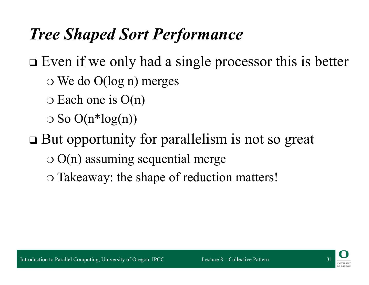 29 . Right Biased Sort Cont q How long did that take? q We did O(n) merges…but each one took O(n) time q O(n2) q We wanted merge sort, but instead we got insertion sort! Introduction to Parallel Computing, University of Oregon, IPCC Lecture 8 – Collective Pattern 29