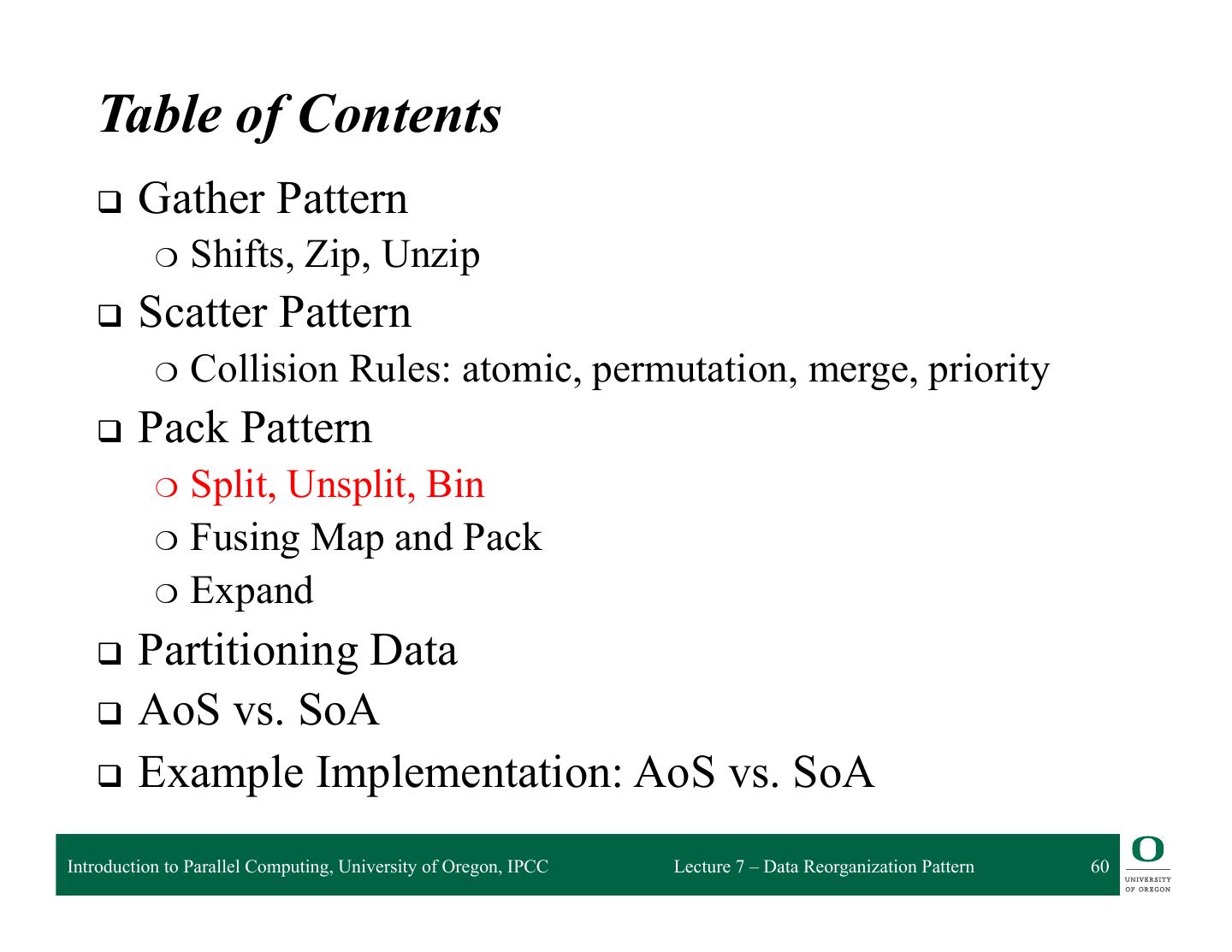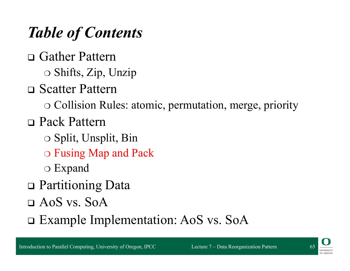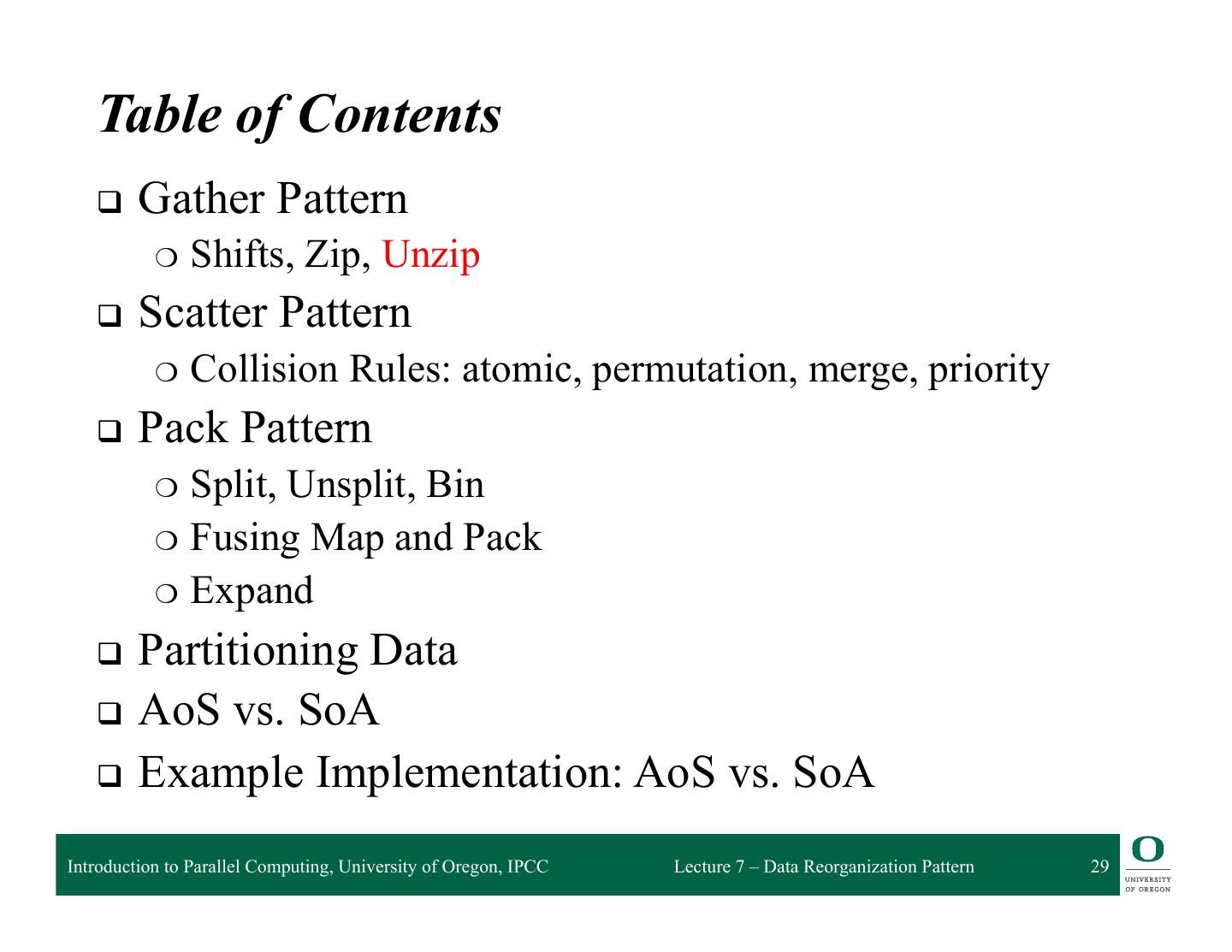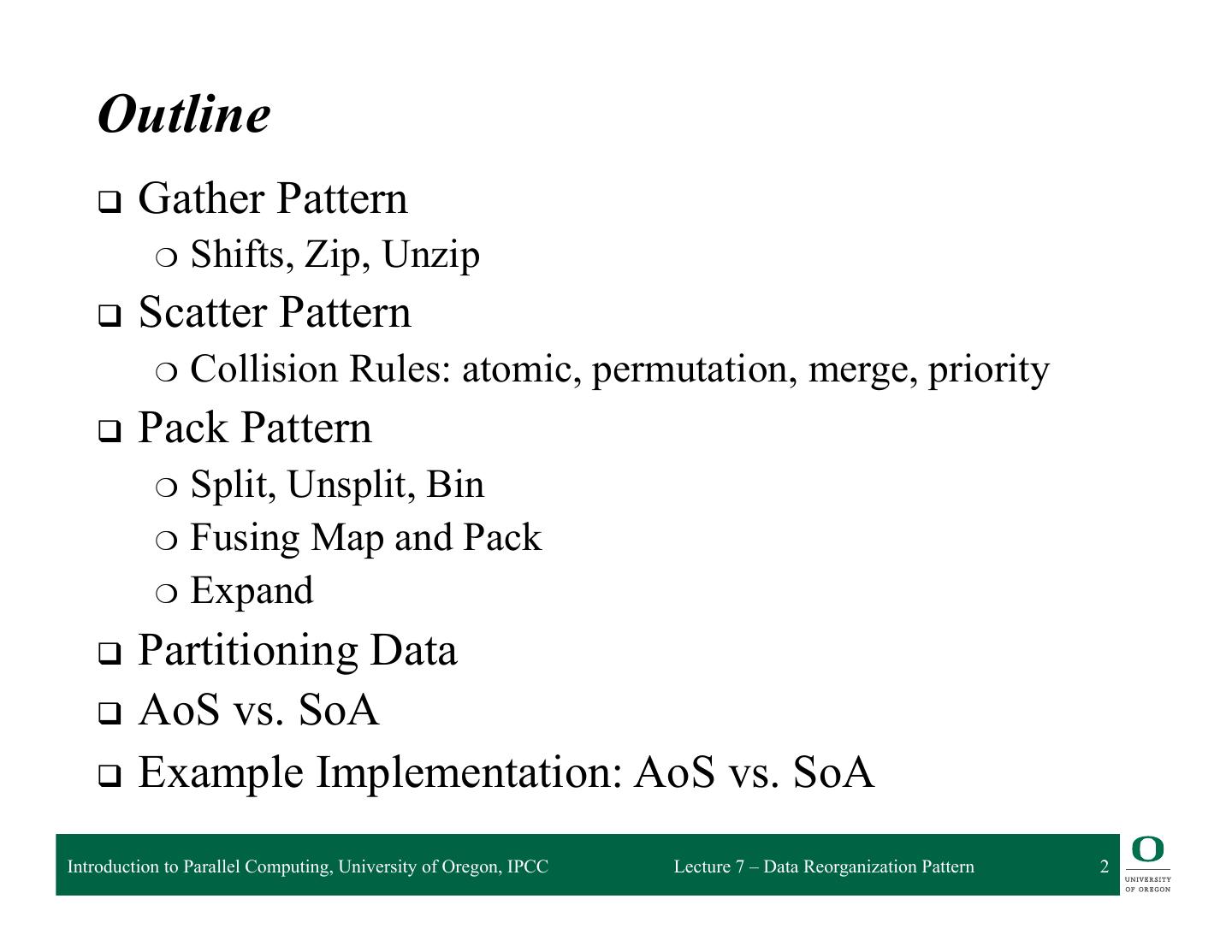 2 . Outline q Gather Pattern ❍ Shifts, Zip, Unzip q Scatter Pattern ❍ Collision Rules: atomic, permutation, merge, priority q Pack Pattern ❍ Split, Unsplit, Bin ❍ Fusing Map and Pack ❍ Expand q Partitioning Data q AoS vs. SoA q Example Implementation: AoS vs. SoA Introduction to Parallel Computing, University of Oregon, IPCC Lecture 7 – Data Reorganization Pattern 2