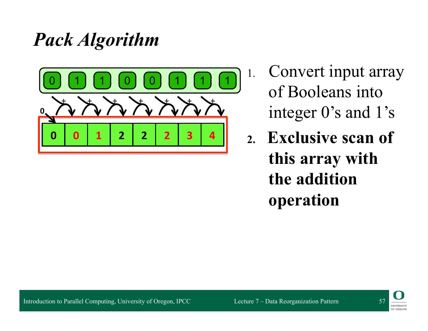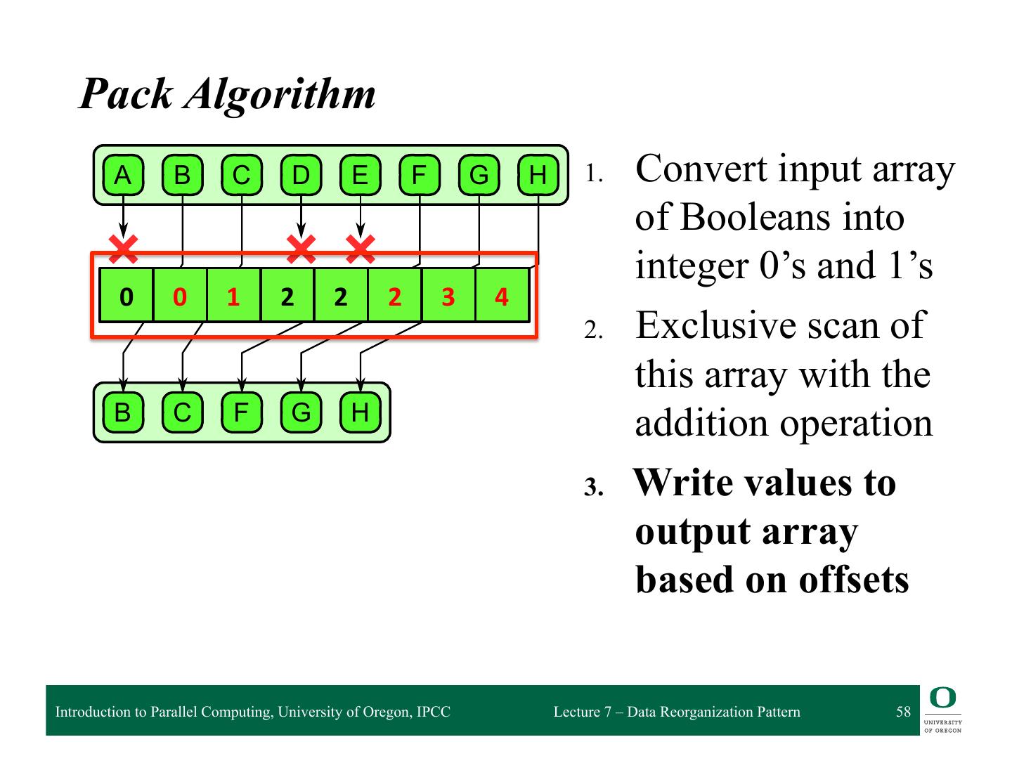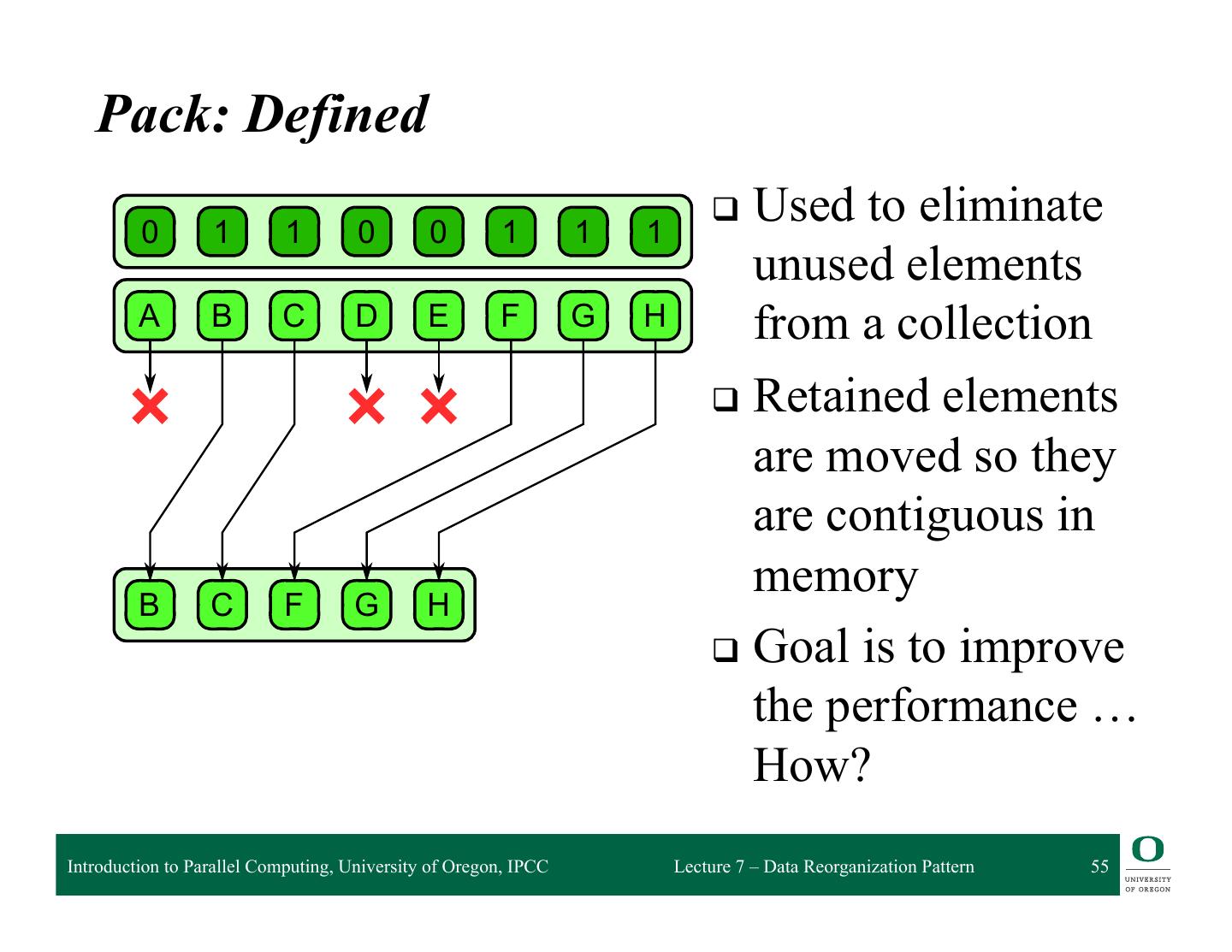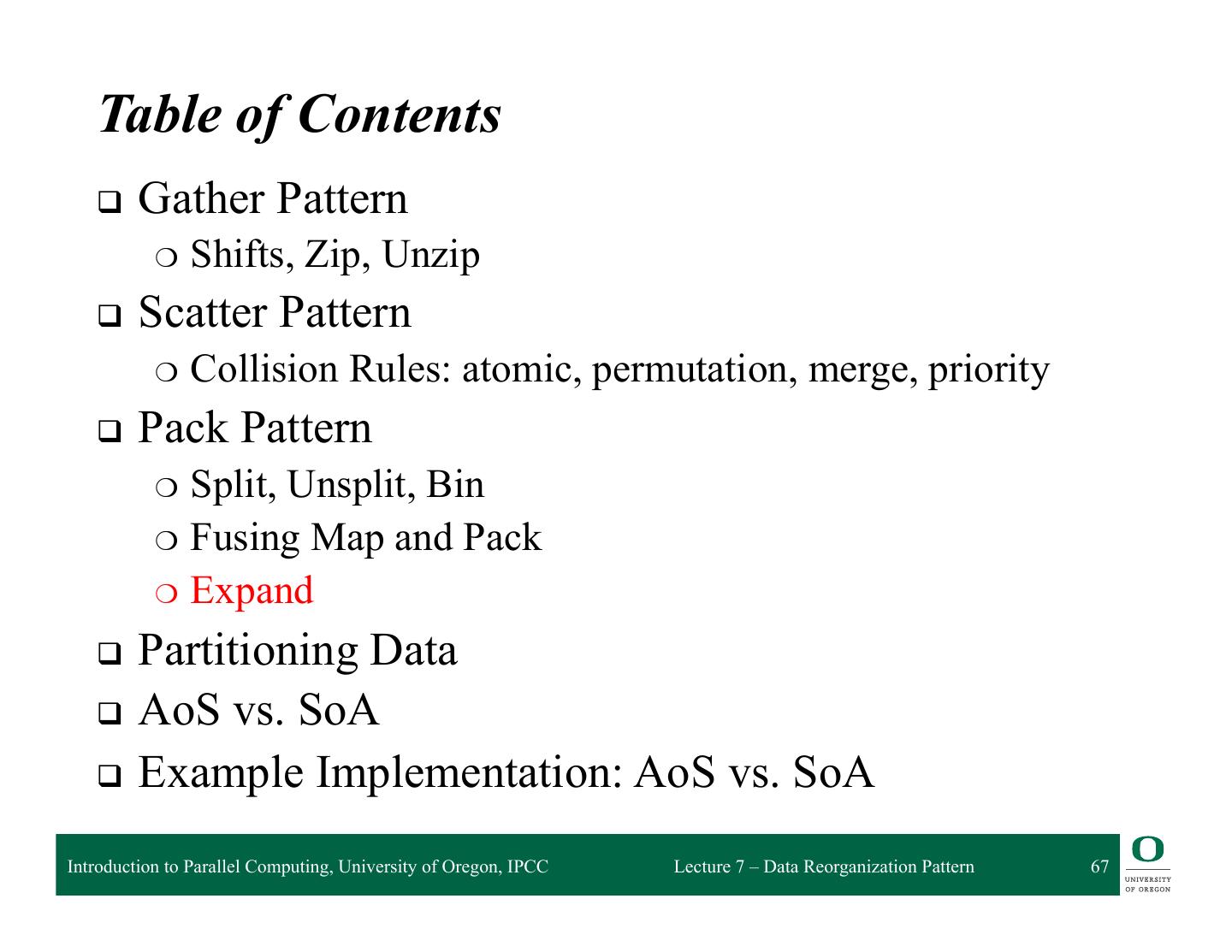 2 . Outline q Gather Pattern ❍ Shifts, Zip, Unzip q Scatter Pattern ❍ Collision Rules: atomic, permutation, merge, priority q Pack Pattern ❍ Split, Unsplit, Bin ❍ Fusing Map and Pack ❍ Expand q Partitioning Data q AoS vs. SoA q Example Implementation: AoS vs. SoA Introduction to Parallel Computing, University of Oregon, IPCC Lecture 7 – Data Reorganization Pattern 2