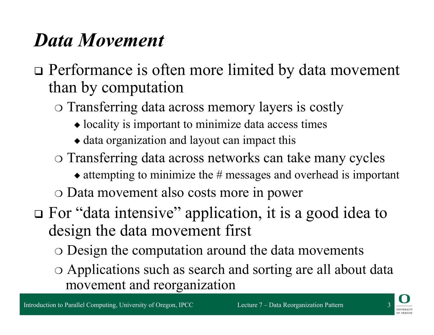 3 . Data Movement q Performance is often more limited by data movement than by computation ❍ Transferring data across memory layers is costly ◆ locality is important to minimize data access times ◆ data organization and layout can impact this ❍ Transferring data across networks can take many cycles ◆ attempting to minimize the # messages and overhead is important ❍ Data movement also costs more in power q For “data intensive” application, it is a good idea to design the data movement first ❍ Design the computation around the data movements ❍ Applications such as search and sorting are all about data movement and reorganization Introduction to Parallel Computing, University of Oregon, IPCC Lecture 7 – Data Reorganization Pattern 3