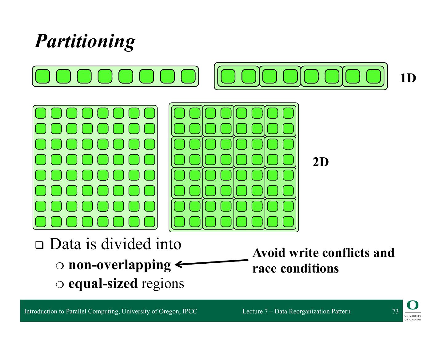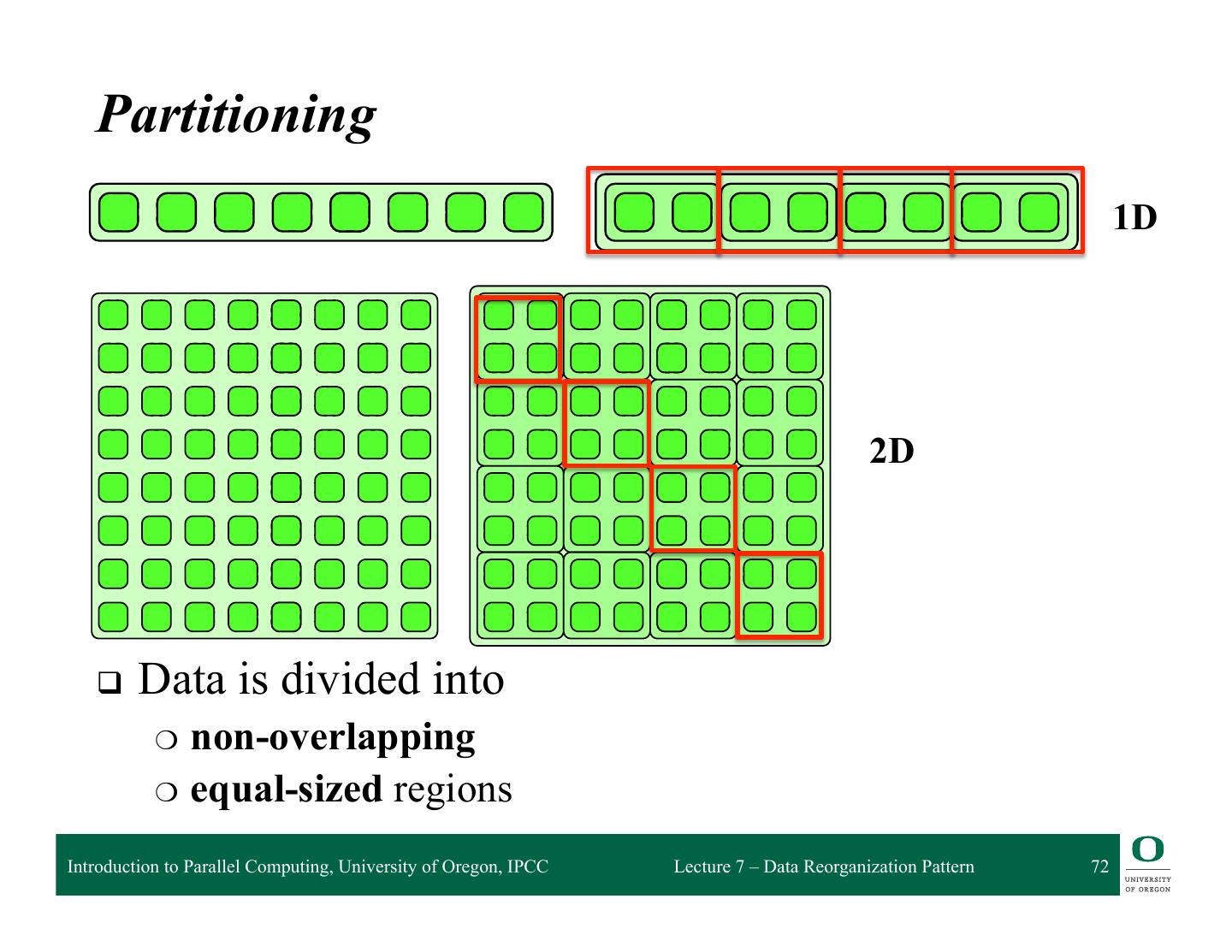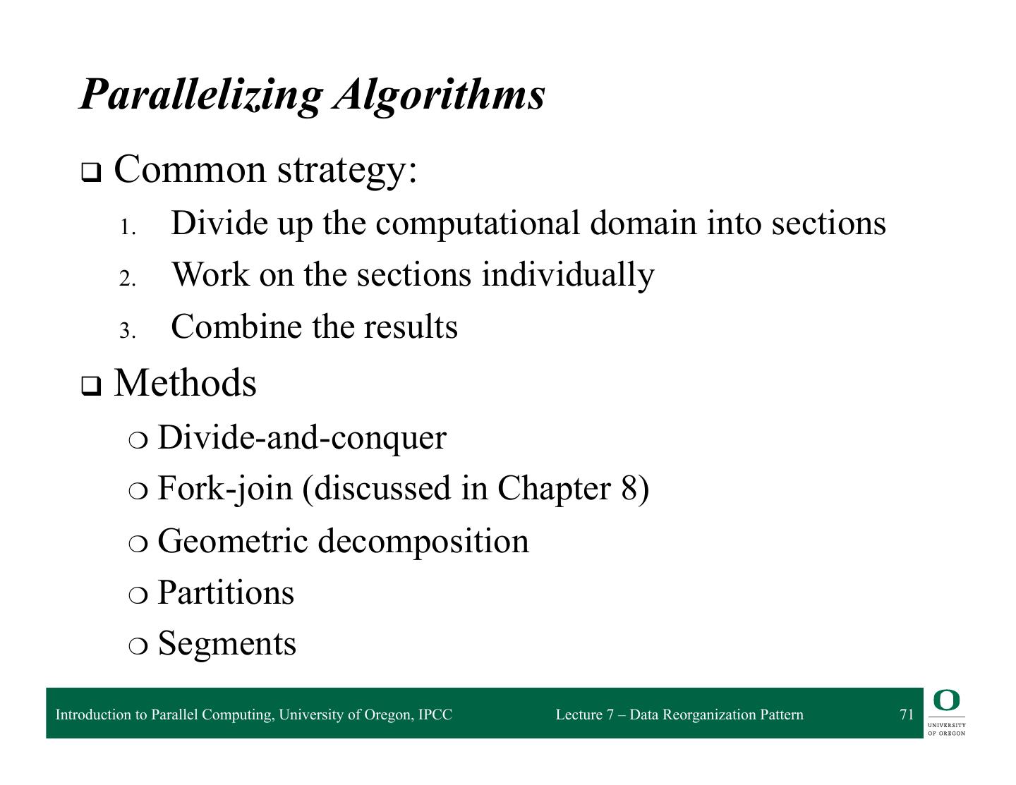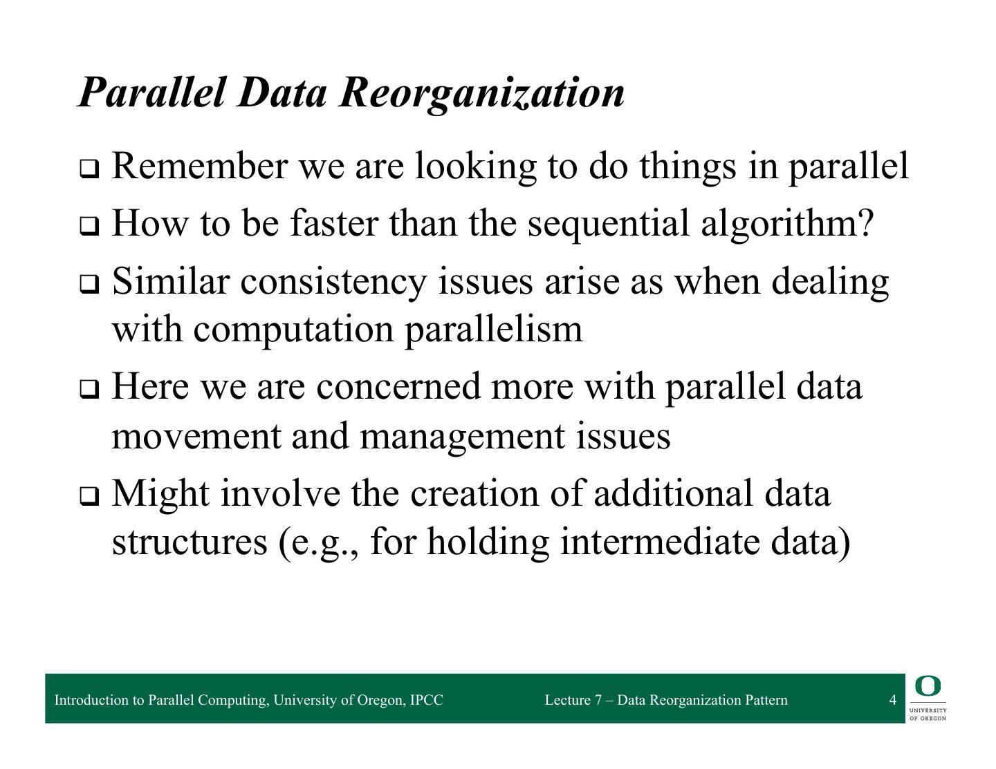 4 . Parallel Data Reorganization q Remember we are looking to do things in parallel q How to be faster than the sequential algorithm? q Similar consistency issues arise as when dealing with computation parallelism q Here we are concerned more with parallel data movement and management issues q Might involve the creation of additional data structures (e.g., for holding intermediate data) Introduction to Parallel Computing, University of Oregon, IPCC Lecture 7 – Data Reorganization Pattern 4