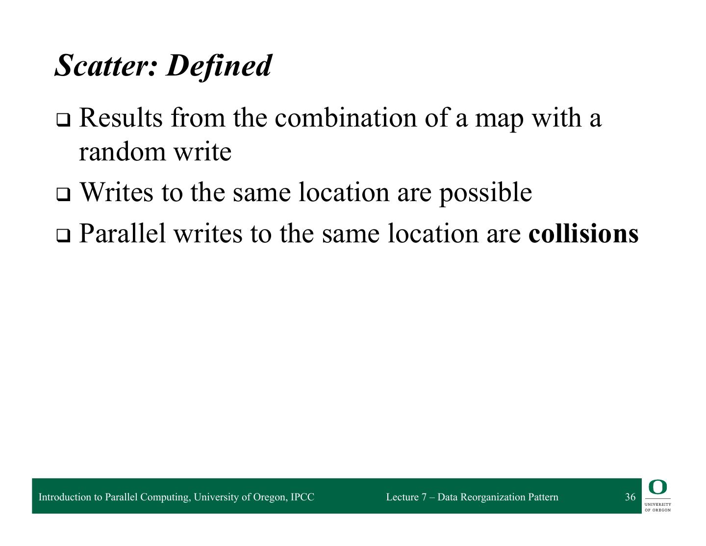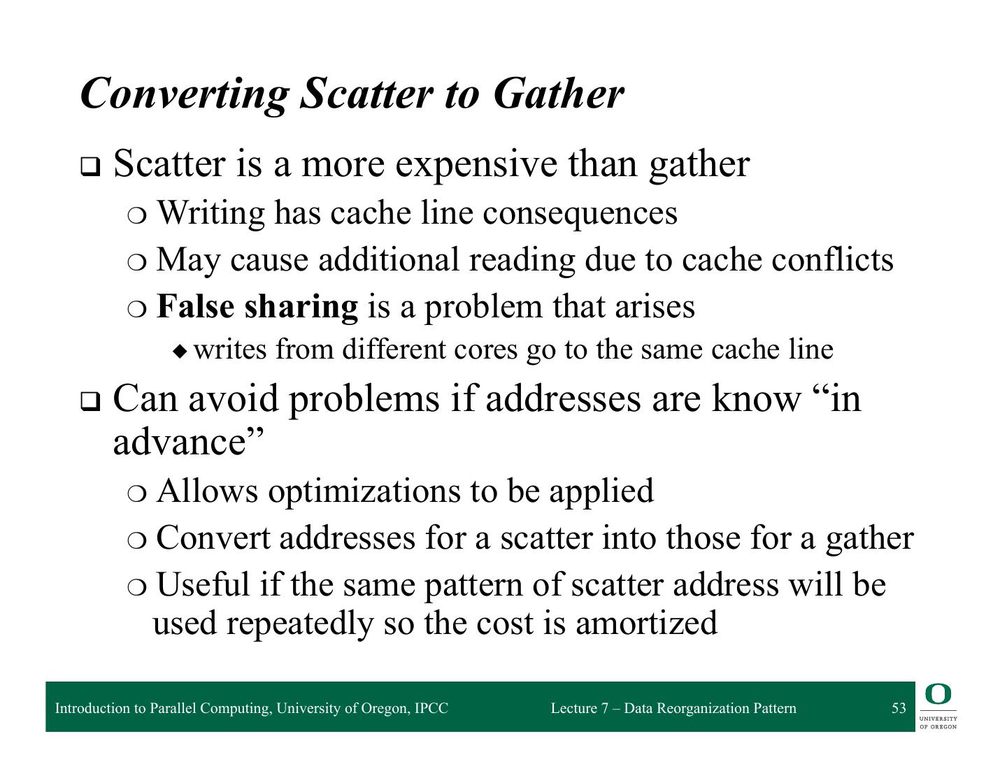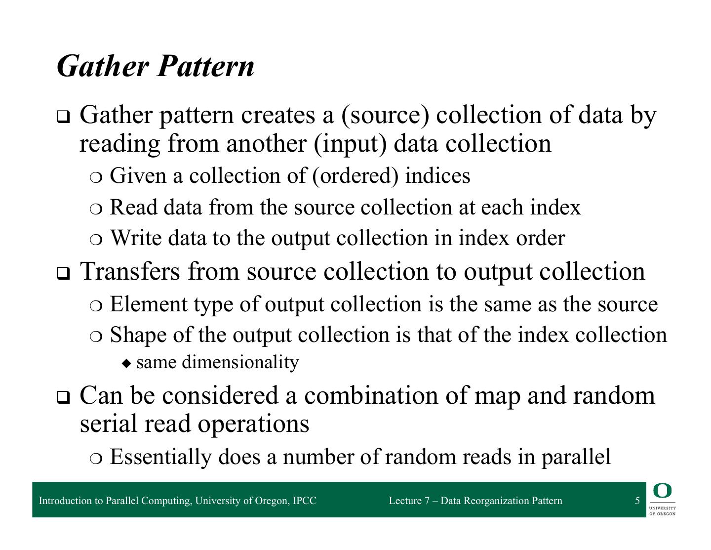 5 . Gather Pattern q Gather pattern creates a (source) collection of data by reading from another (input) data collection ❍ Given a collection of (ordered) indices ❍ Read data from the source collection at each index ❍ Write data to the output collection in index order q Transfers from source collection to output collection ❍ Element type of output collection is the same as the source ❍ Shape of the output collection is that of the index collection ◆ same dimensionality q Can be considered a combination of map and random serial read operations ❍ Essentially does a number of random reads in parallel Introduction to Parallel Computing, University of Oregon, IPCC Lecture 7 – Data Reorganization Pattern 5