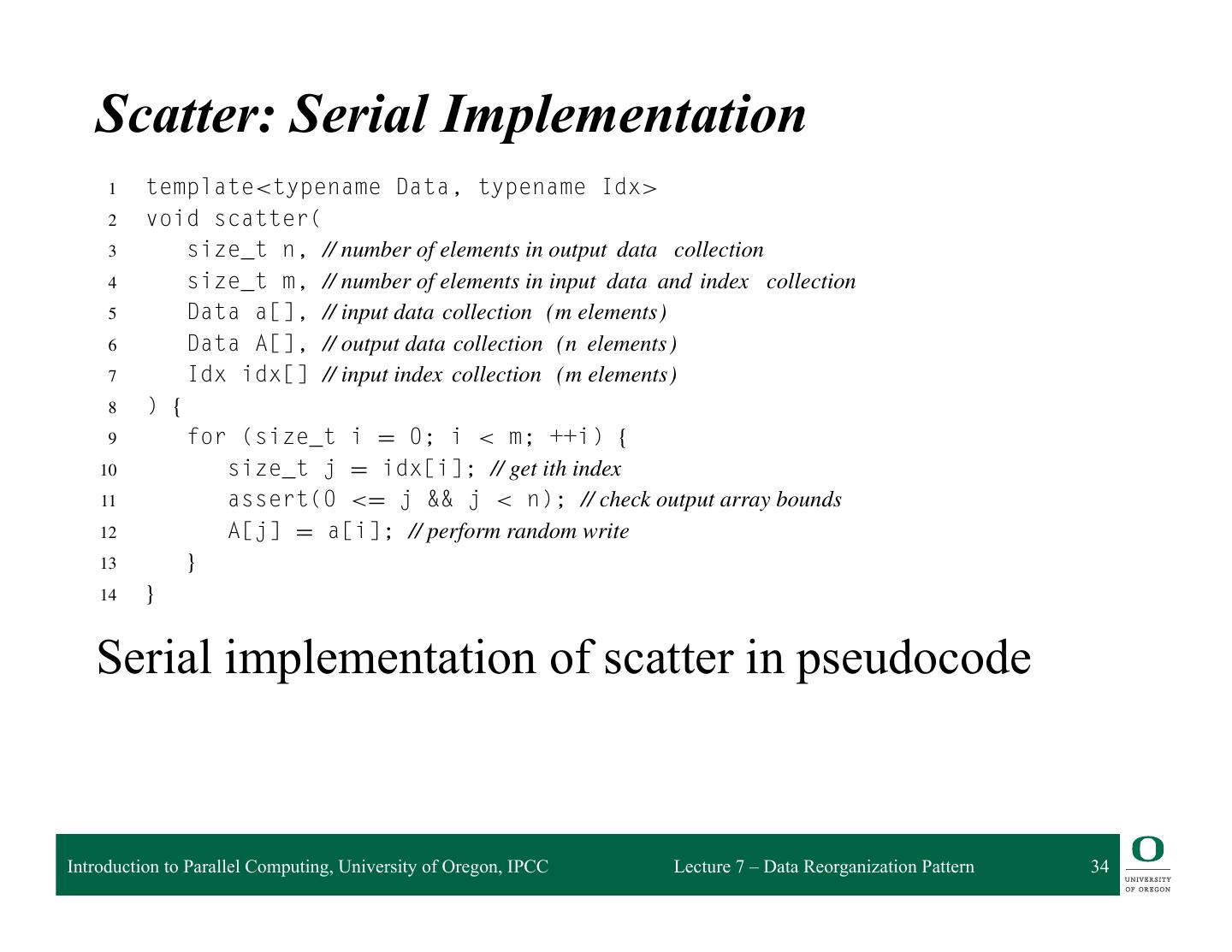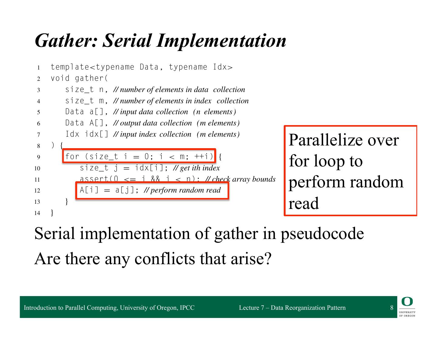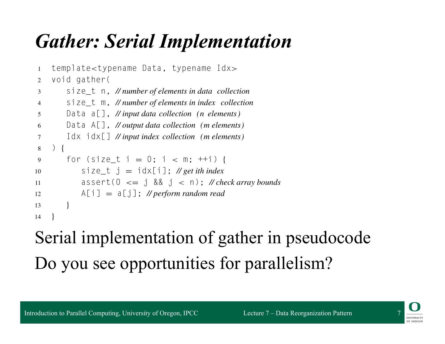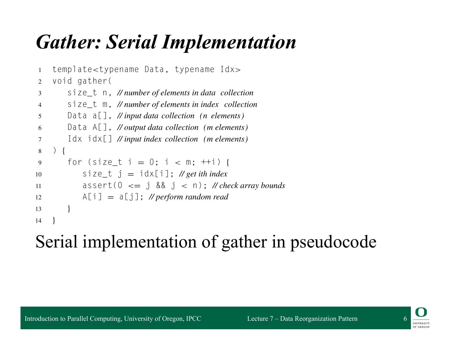6 . The general gather pattern is simple but there are many special cases which can be implement more efficiently, especially on machines with vector instructions. Important special cases include sh and zip, which are diagrammed in Figures 6.2 and 6.3. The inverse of zip, unzip, is also useful. Gather: Serial Implementation 1 template<typename Data, typename Idx> 2 void gather( 3 size_t n, // number of elements in data collection 4 size_t m, // number of elements in index collection 5 Data a[], // input data collection (n elements ) 6 Data A[], // output data collection (m elements) 7 Idx idx[] // input index collection (m elements) 8 ) { 9 for (size_t i = 0; i < m; ++i) { 10 size_t j = idx[i]; // get ith index 11 assert(0 <= j && j < n); // check array bounds 12 A[i] = a[j]; // perform random read 13 } 14 } Serial implementation of gather in pseudocode LISTING 6.1 Serial implementation of gather in pseudocode. This definition also includes bounds checking (assert) durin debugging as an optional but useful feature. Introduction to Parallel Computing, University of Oregon, IPCC Lecture 7 – Data Reorganization Pattern 6