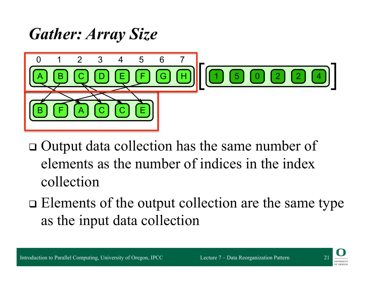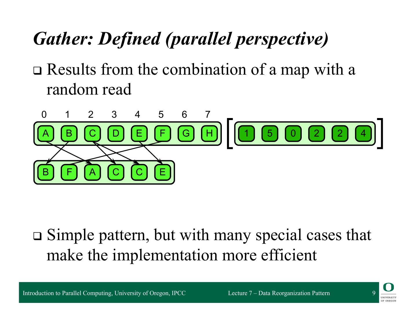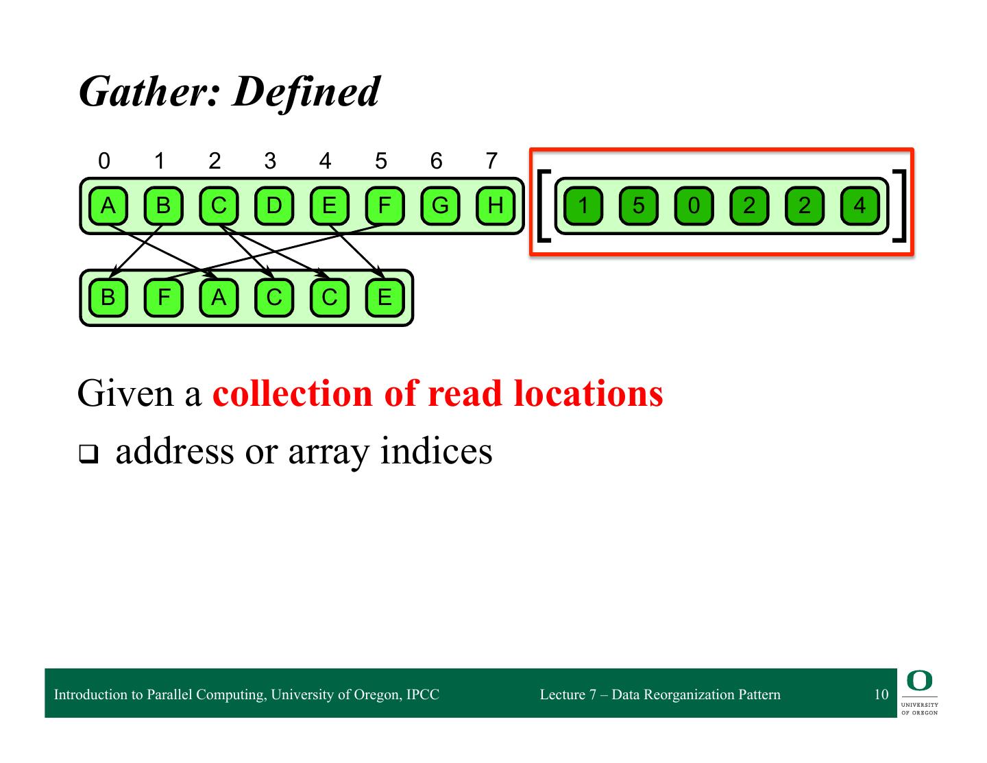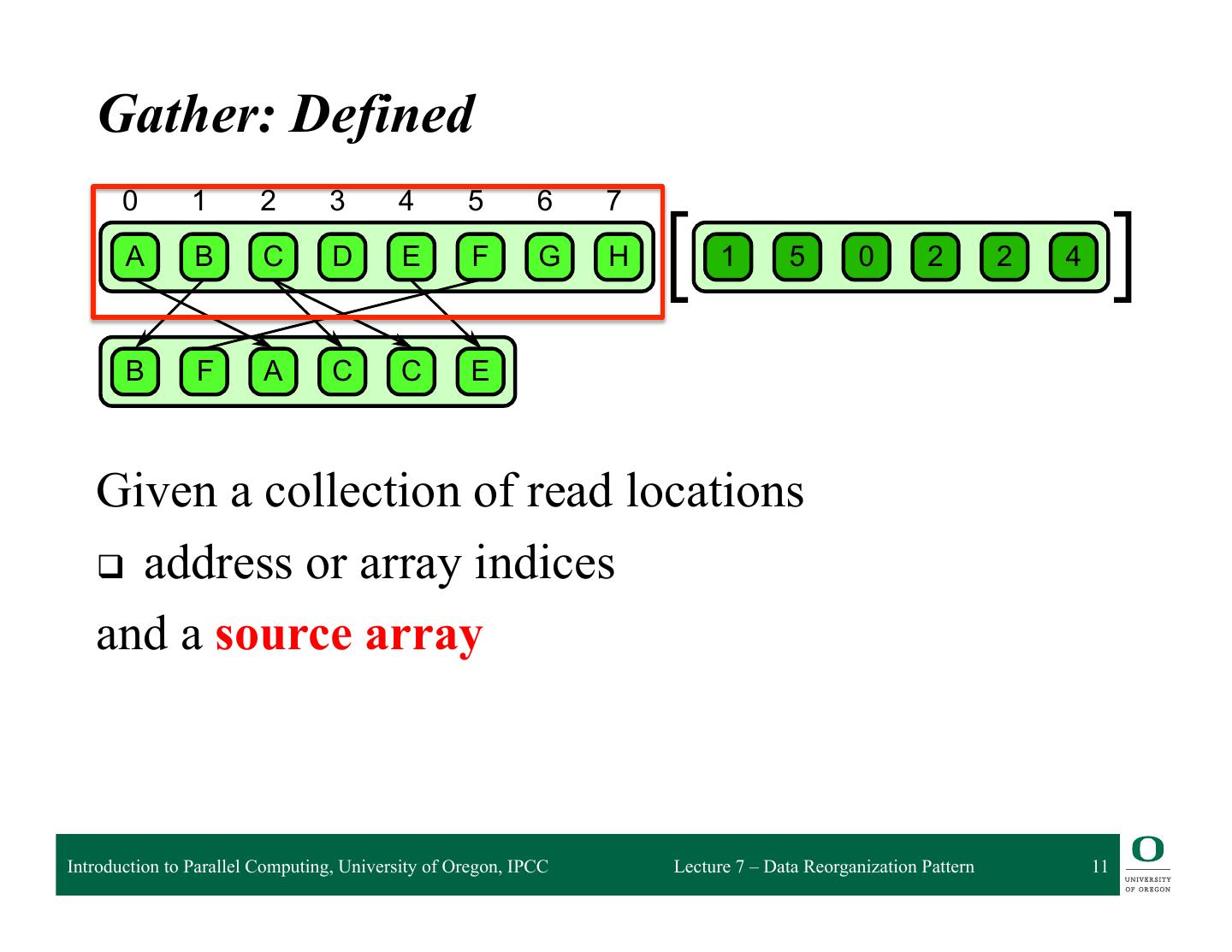 10 . 6.1 Gather Gather: Defined 0 1 2 3 4 5 6 7 A B C D E F G H 1 5 0 2 2 4 B F A C C E 6.1 Given a collection of read locations attern. A collection of data is read from an input collection given a collection of indices. This is q address nt to a map combined withor aarray randomindices read in the map’s elemental function. Introduction to Parallel Computing, University of Oregon, IPCC Lecture 7 – Data Reorganization Pattern 10