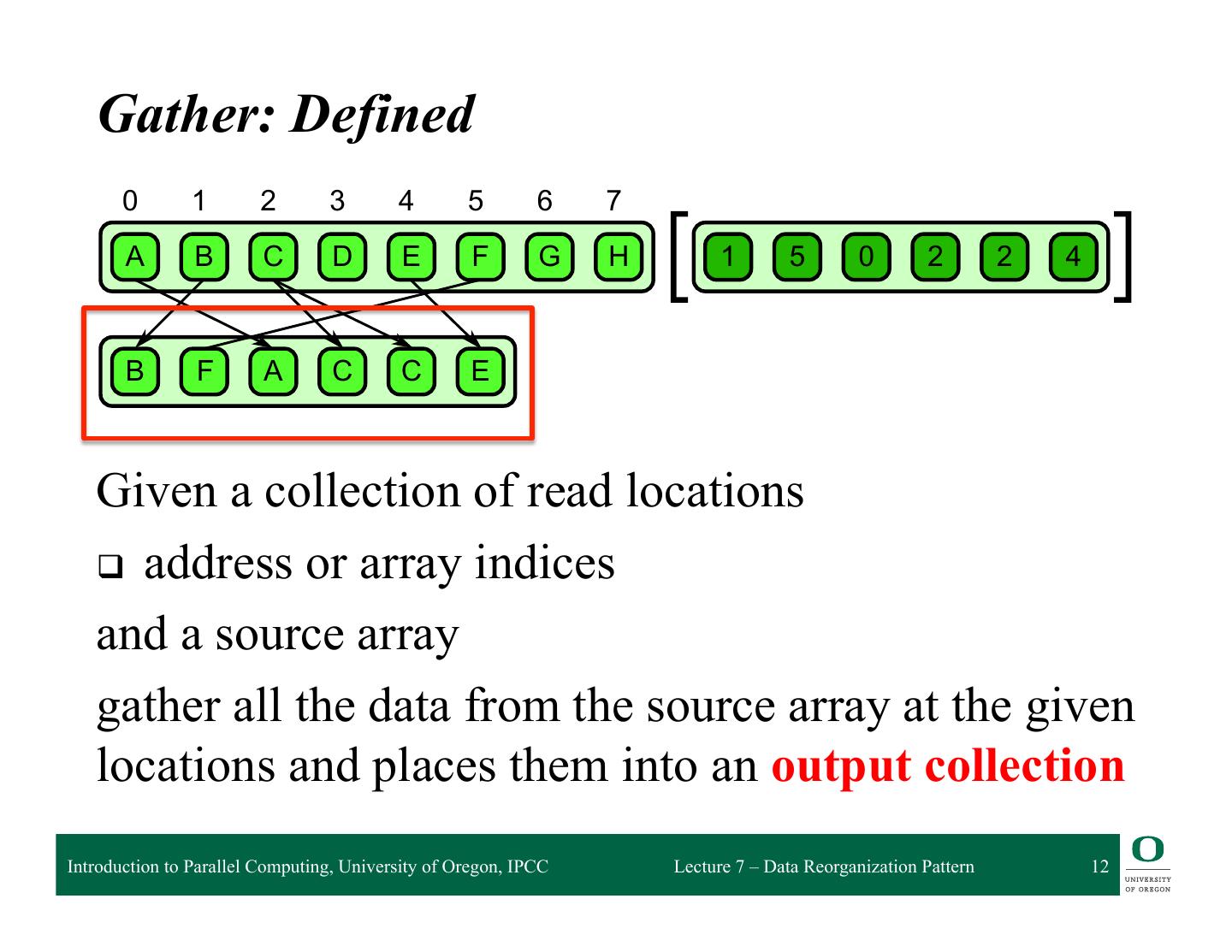 11 . 6.1 Gather Gather: Defined 0 1 2 3 4 5 6 7 A B C D E F G H 1 5 0 2 2 4 B F A C C E 6.1 Given a collection of read locations attern. A collection of data is read from an input collection given a collection of indices. This is q address nt to a map combined withor aarray randomindices read in the map’s elemental function. and a source array Introduction to Parallel Computing, University of Oregon, IPCC Lecture 7 – Data Reorganization Pattern 11
