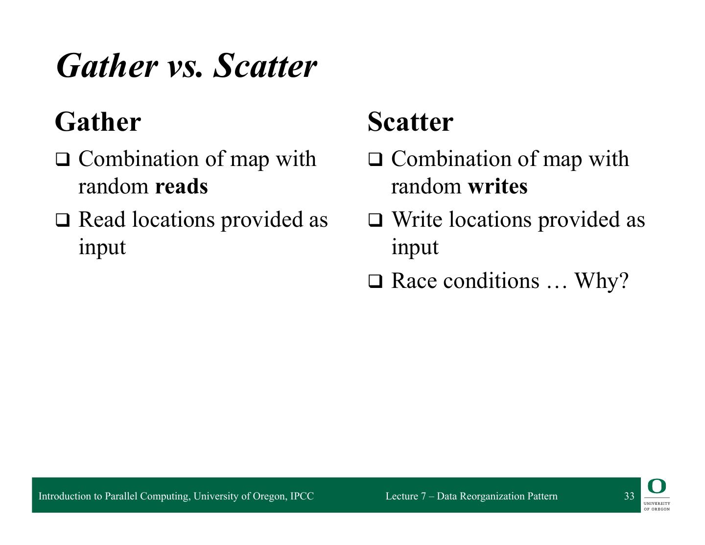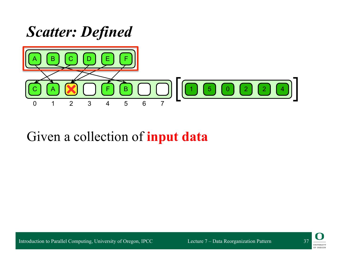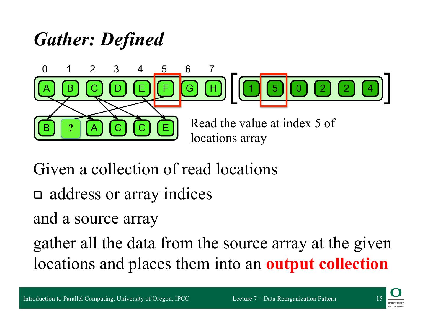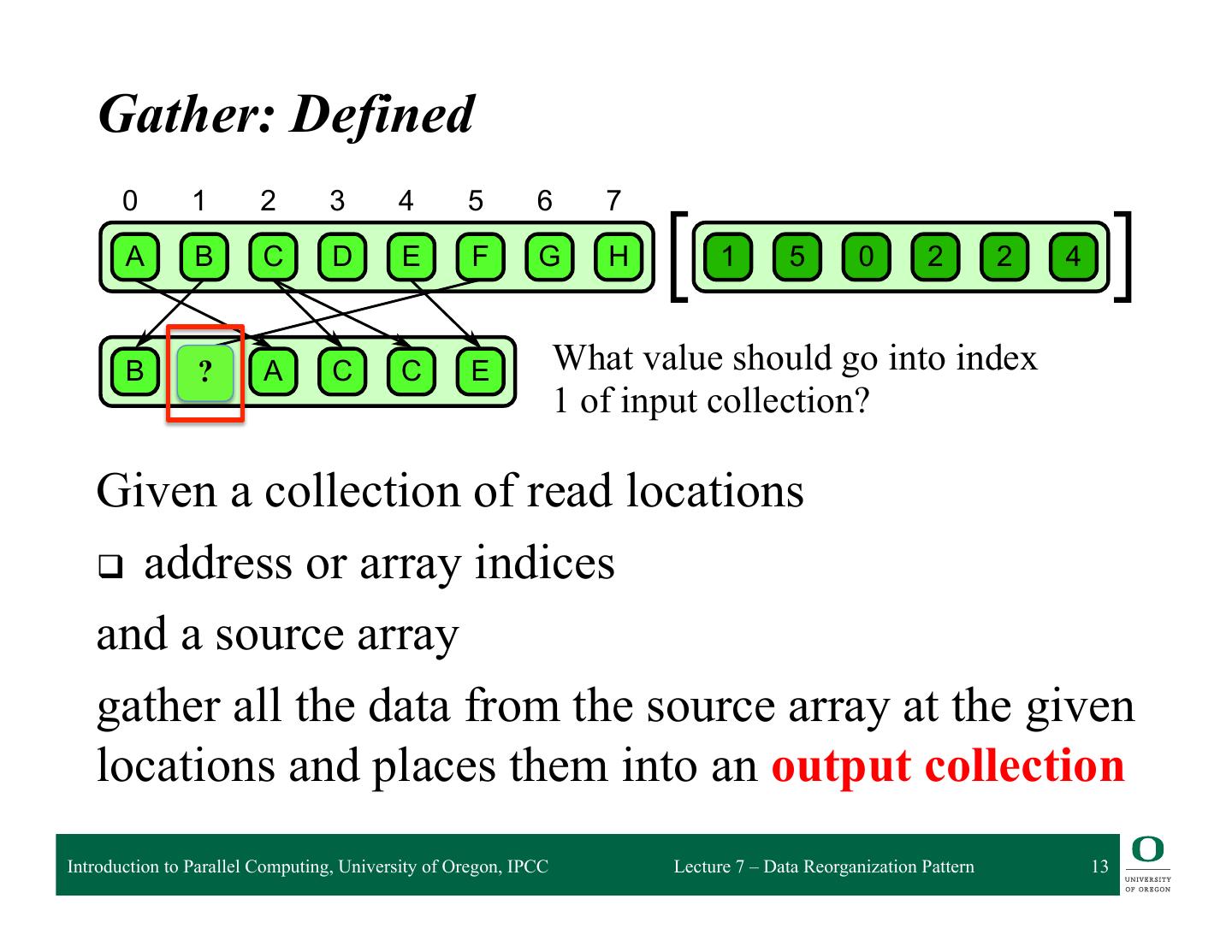 12 . 6.1 Gather Gather: Defined 0 1 2 3 4 5 6 7 A B C D E F G H 1 5 0 2 2 4 B F A C C E 6.1 Given a collection of read locations attern. A collection of data is read from an input collection given a collection of indices. This is q address nt to a map combined withor aarray randomindices read in the map’s elemental function. and a source array gather all the data from the source array at the given locations and places them into an output collection Introduction to Parallel Computing, University of Oregon, IPCC Lecture 7 – Data Reorganization Pattern 12