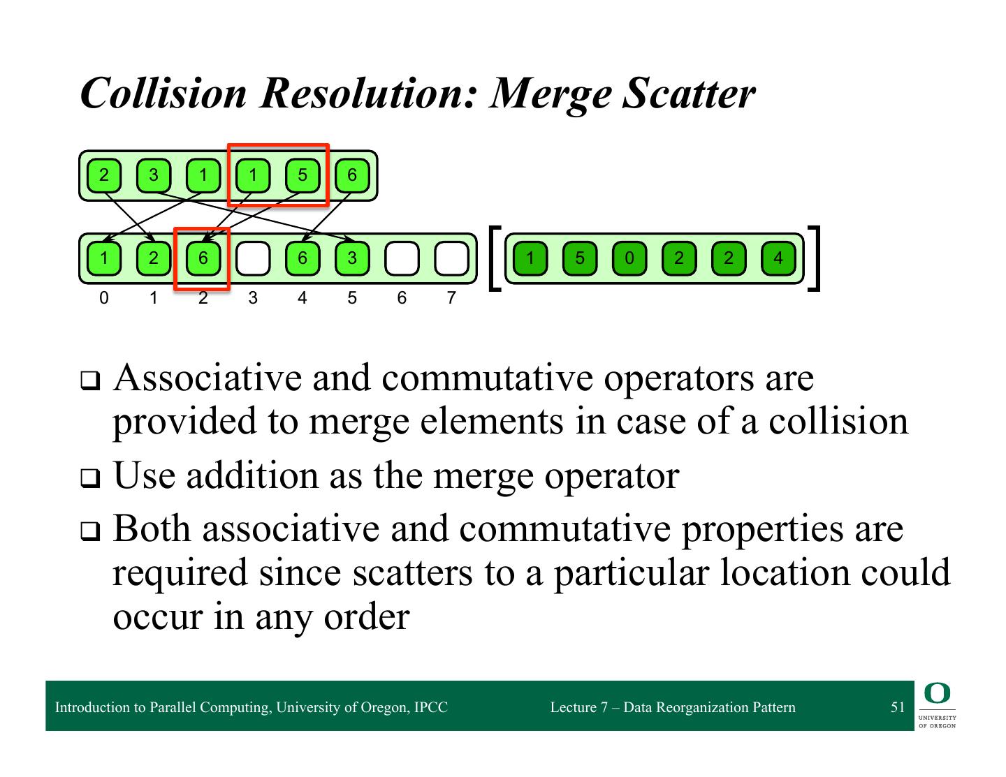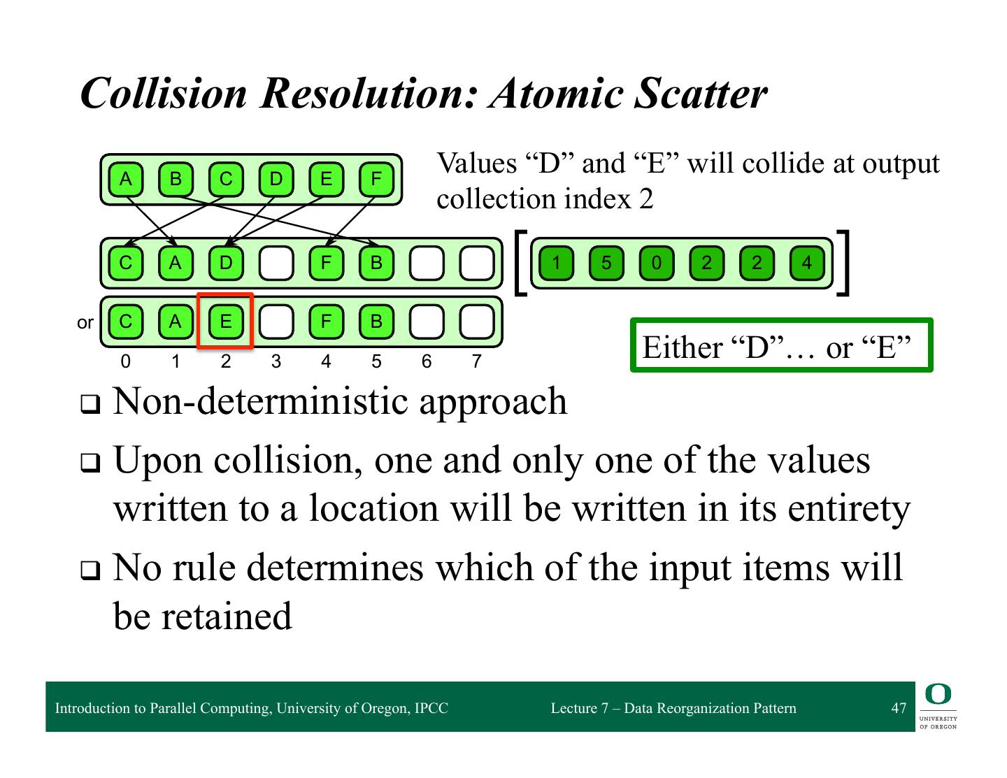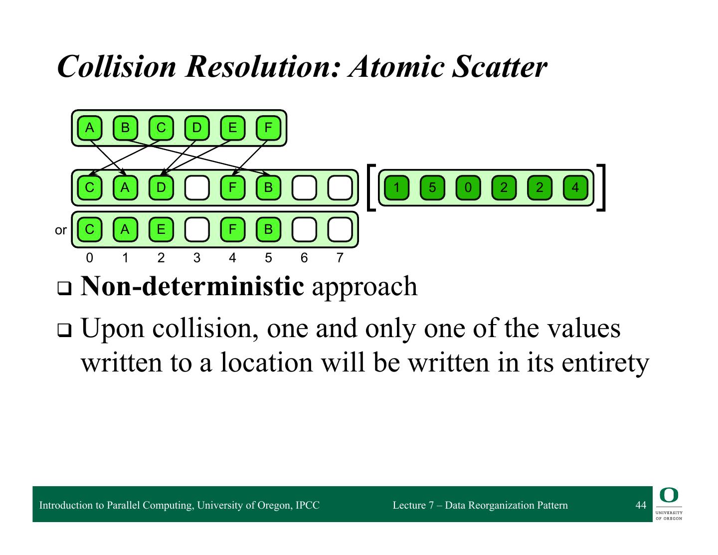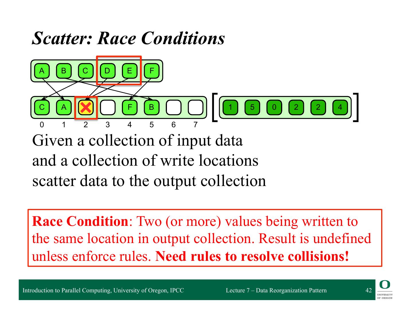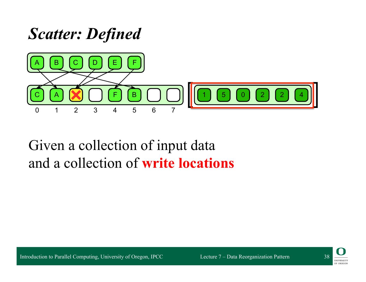 12 . 6.1 Gather Gather: Defined 0 1 2 3 4 5 6 7 A B C D E F G H 1 5 0 2 2 4 B F A C C E 6.1 Given a collection of read locations attern. A collection of data is read from an input collection given a collection of indices. This is q address nt to a map combined withor aarray randomindices read in the map’s elemental function. and a source array gather all the data from the source array at the given locations and places them into an output collection Introduction to Parallel Computing, University of Oregon, IPCC Lecture 7 – Data Reorganization Pattern 12