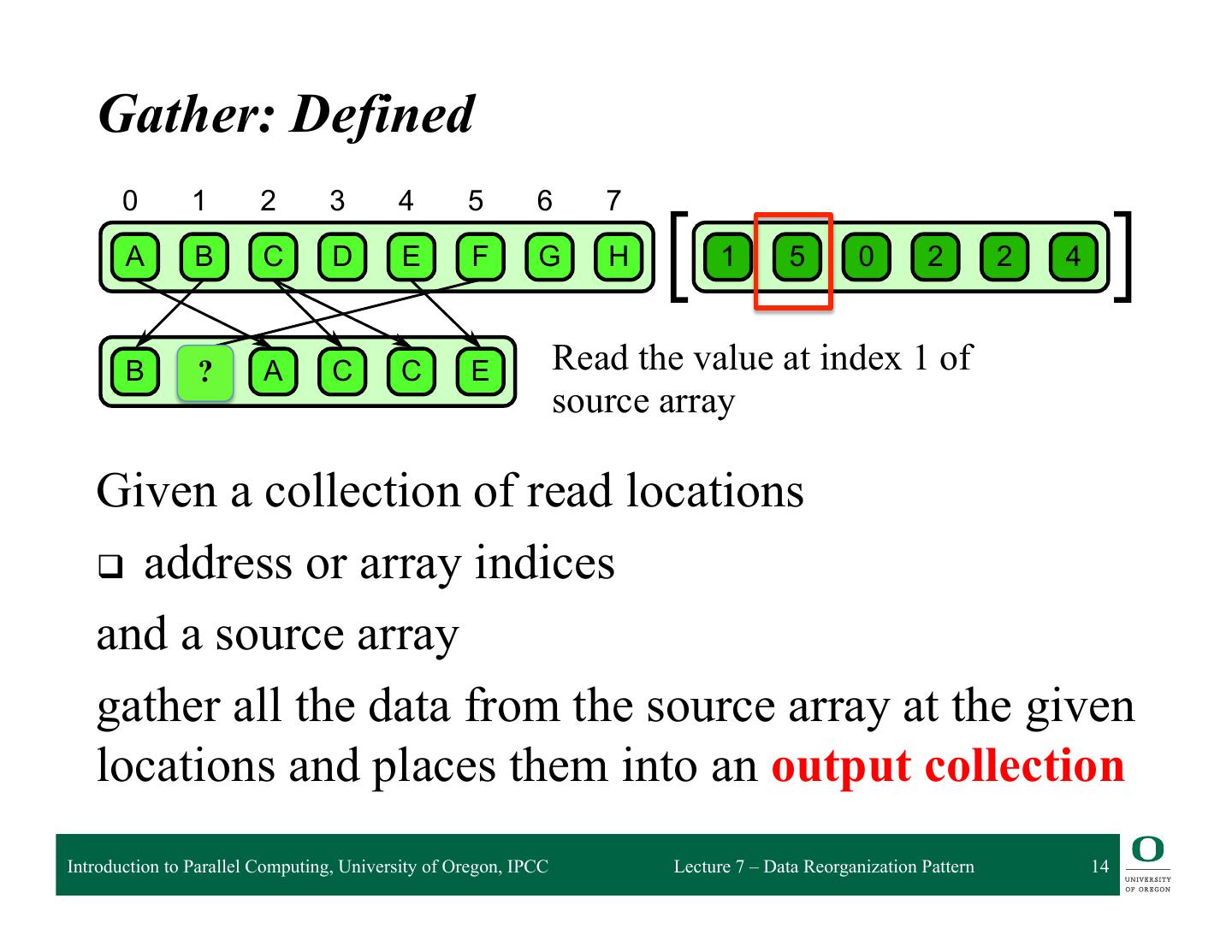 13 . 6.1 Gather Gather: Defined 0 1 2 3 4 5 6 7 A B C D E F G H 1 5 0 2 2 4 B ? F A C C E What value should go into index 1 of input collection? 6.1 Given a collection of read locations attern. A collection of data is read from an input collection given a collection of indices. This is q address nt to a map combined withor aarray randomindices read in the map’s elemental function. and a source array gather all the data from the source array at the given locations and places them into an output collection Introduction to Parallel Computing, University of Oregon, IPCC Lecture 7 – Data Reorganization Pattern 13