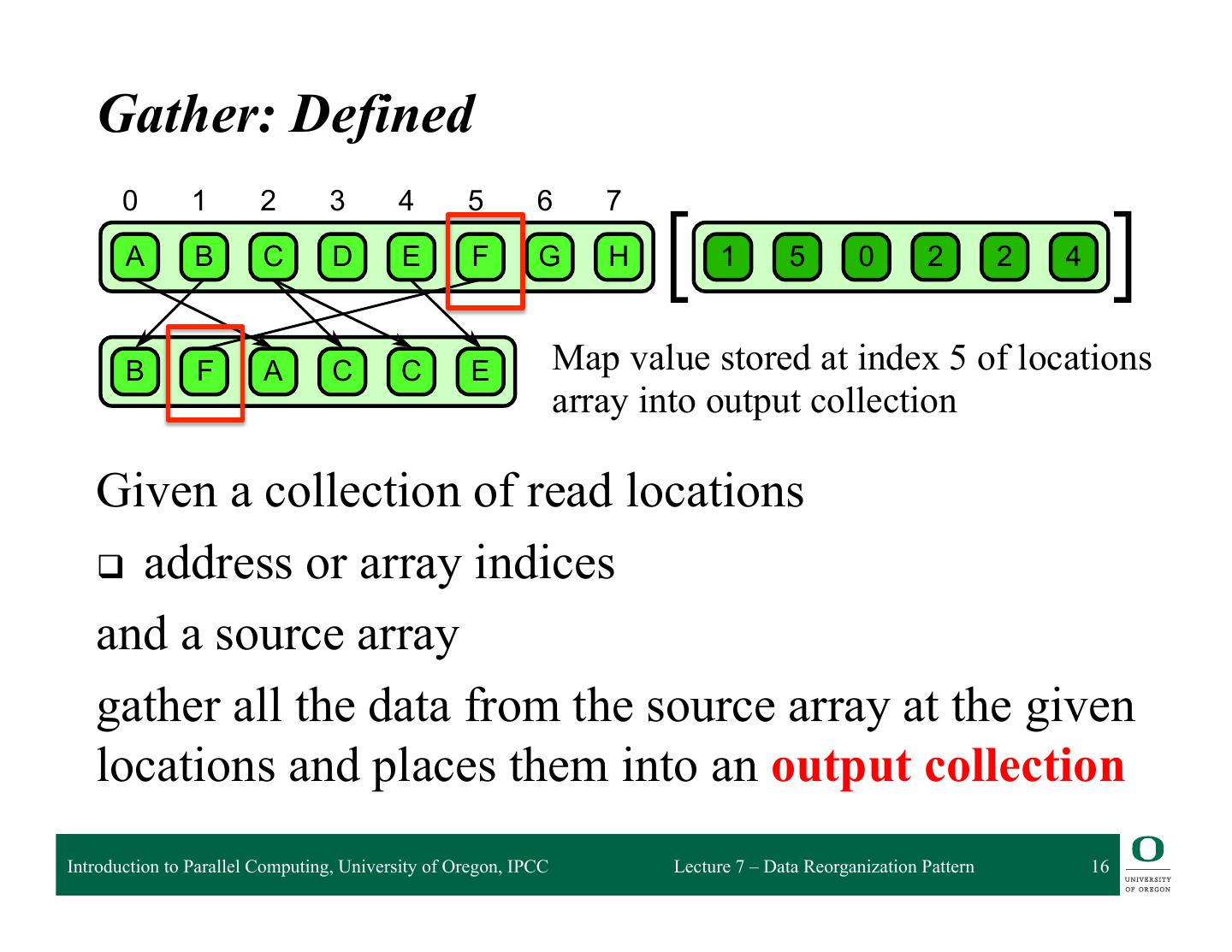 15 . 6.1 Gather Gather: Defined 0 1 2 3 4 5 6 7 A B C D E F G H 1 5 0 2 2 4 B ? F A C C E Read the value at index 5 of locations array 6.1 Given a collection of read locations attern. A collection of data is read from an input collection given a collection of indices. This is q address nt to a map combined withor aarray randomindices read in the map’s elemental function. and a source array gather all the data from the source array at the given locations and places them into an output collection Introduction to Parallel Computing, University of Oregon, IPCC Lecture 7 – Data Reorganization Pattern 15