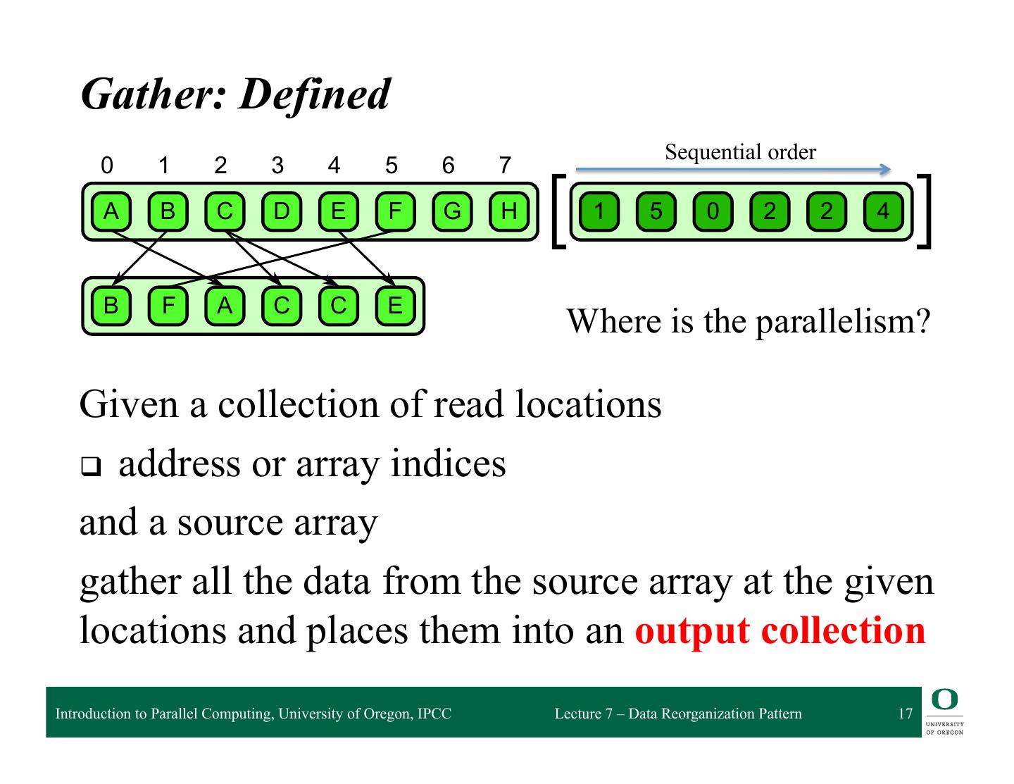 16 . 6.1 Gather Gather: Defined 0 1 2 3 4 5 6 7 A B C D E F G H 1 5 0 2 2 4 B F A C C E Map value stored at index 5 of locations array into output collection 6.1 Given a collection of read locations attern. A collection of data is read from an input collection given a collection of indices. This is q address nt to a map combined withor aarray randomindices read in the map’s elemental function. and a source array gather all the data from the source array at the given locations and places them into an output collection Introduction to Parallel Computing, University of Oregon, IPCC Lecture 7 – Data Reorganization Pattern 16