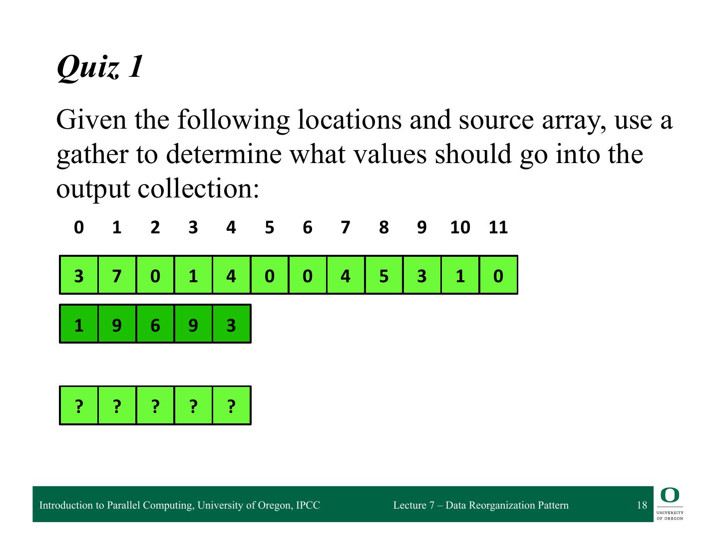 18 . Quiz 1 Given the following locations and source array, use a gather to determine what values should go into the output collection: 0 1 2 3 4 5 6 7 8 9 10 11 3 7 0 1 4 0 0 4 5 3 1 0 1 9 6 9 3 ? ? ? ? ? Introduction to Parallel Computing, University of Oregon, IPCC Lecture 7 – Data Reorganization Pattern 18