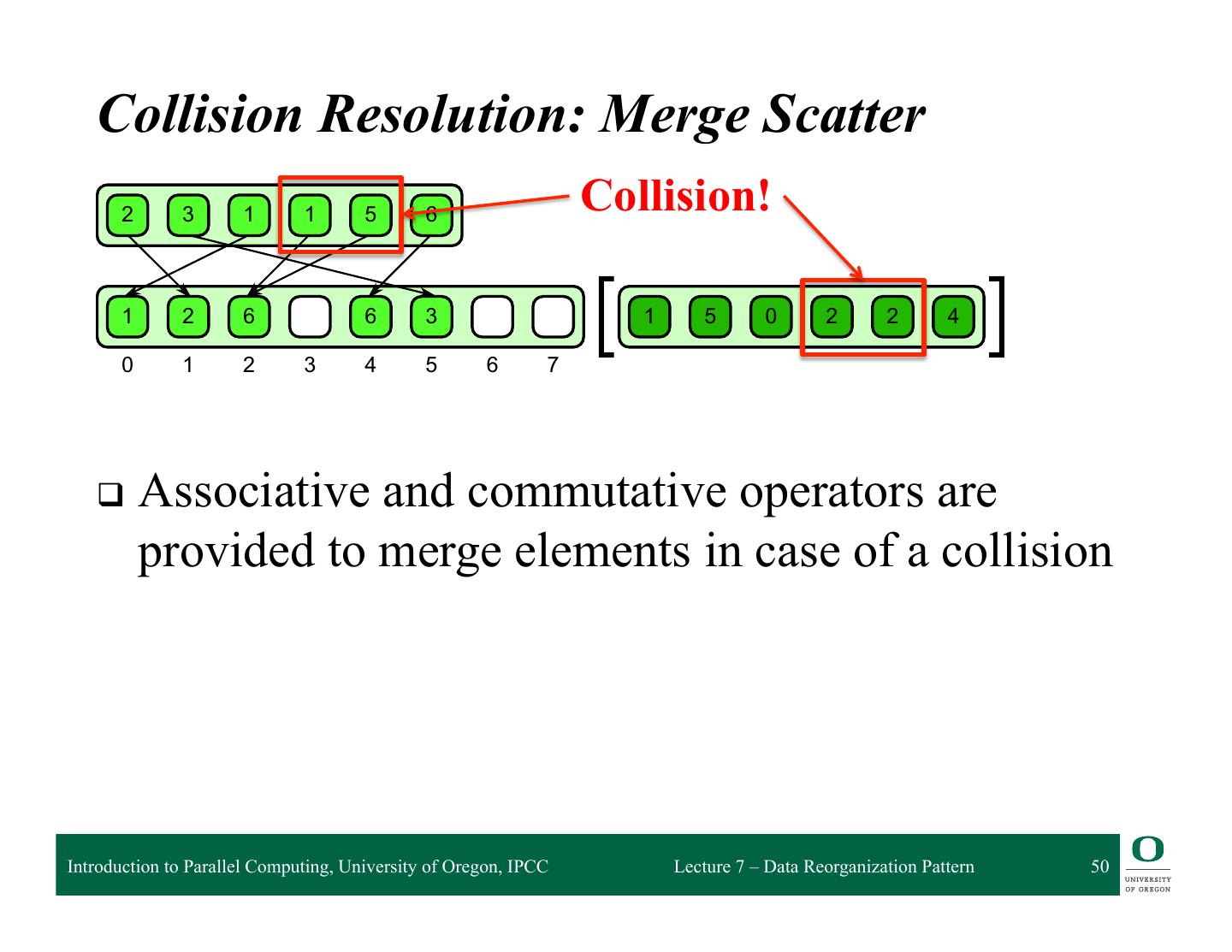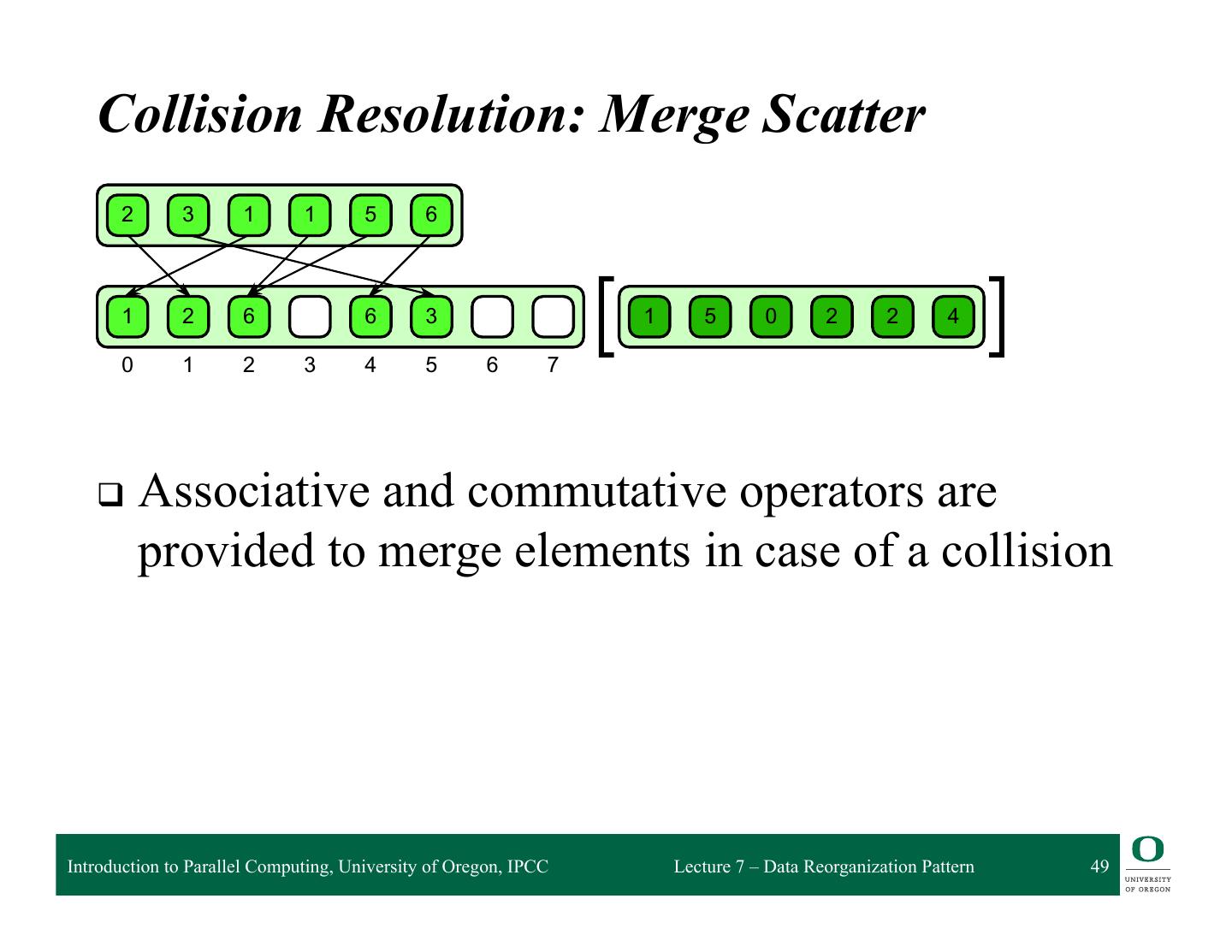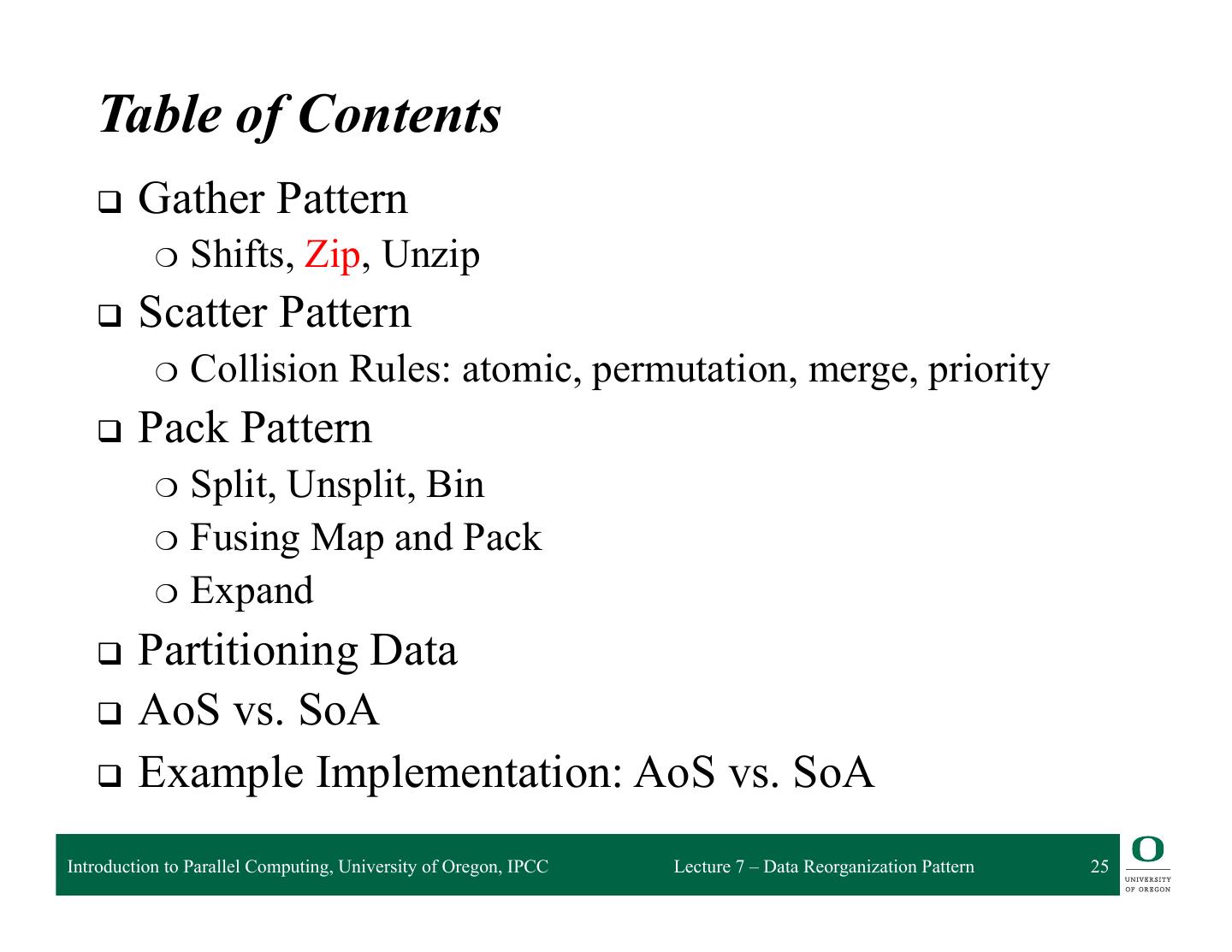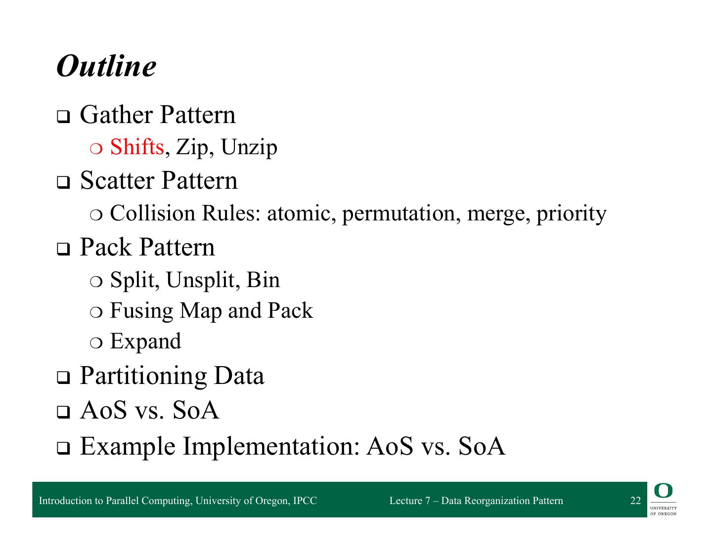 22 . Outline q Gather Pattern ❍ Shifts, Zip, Unzip q Scatter Pattern ❍ Collision Rules: atomic, permutation, merge, priority q Pack Pattern ❍ Split, Unsplit, Bin ❍ Fusing Map and Pack ❍ Expand q Partitioning Data q AoS vs. SoA q Example Implementation: AoS vs. SoA Introduction to Parallel Computing, University of Oregon, IPCC Lecture 7 – Data Reorganization Pattern 22