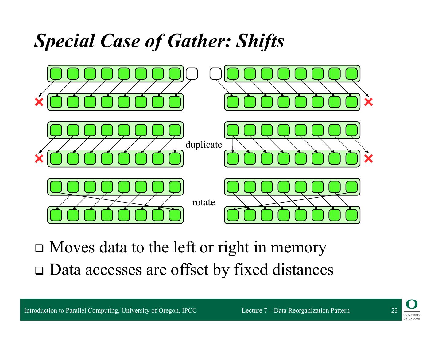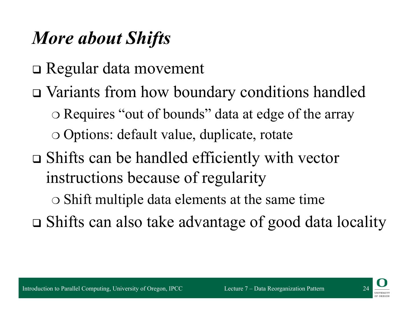 24 . More about Shifts q Regular data movement q Variants from how boundary conditions handled ❍ Requires “out of bounds” data at edge of the array ❍ Options: default value, duplicate, rotate q Shifts can be handled efficiently with vector instructions because of regularity ❍ Shift multiple data elements at the same time q Shifts can also take advantage of good data locality Introduction to Parallel Computing, University of Oregon, IPCC Lecture 7 – Data Reorganization Pattern 24