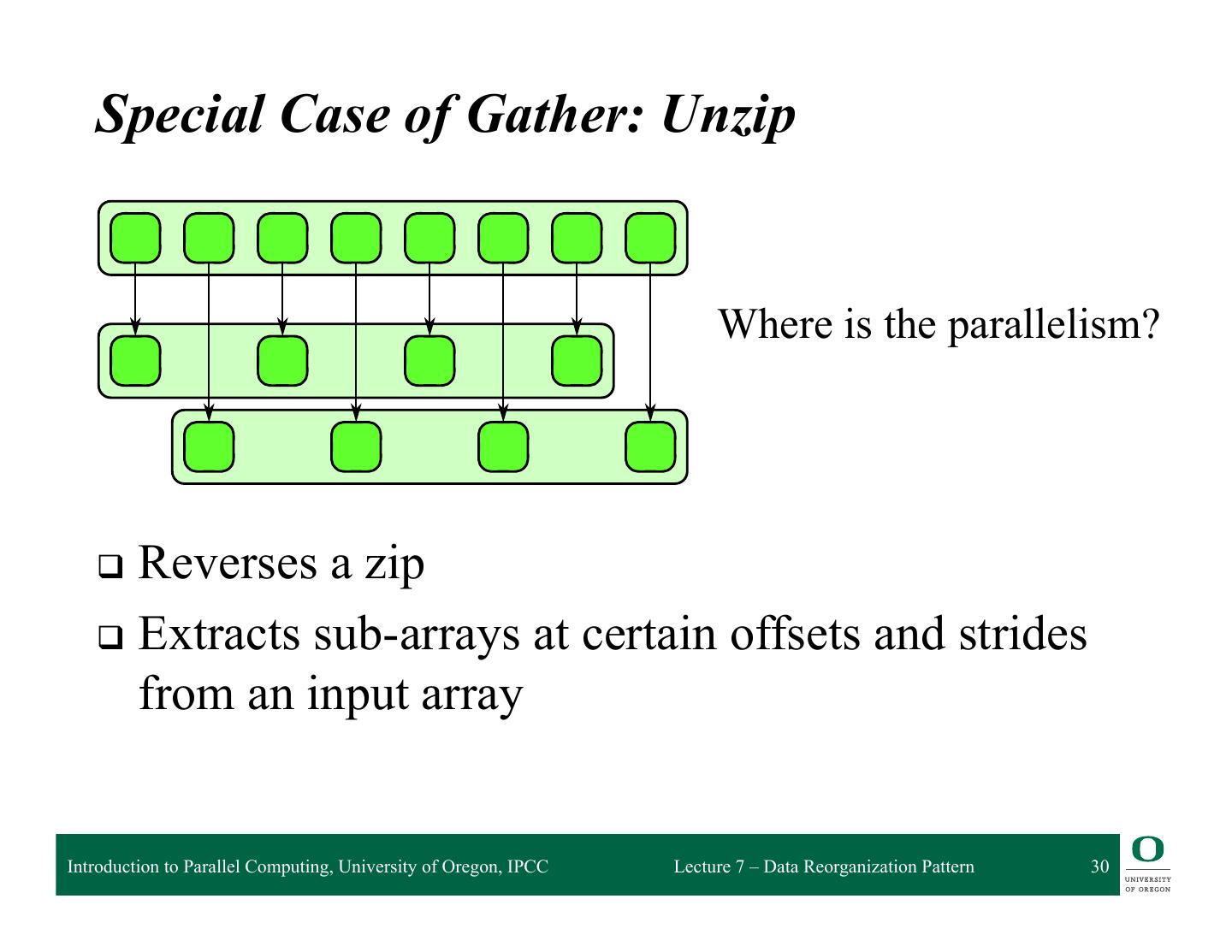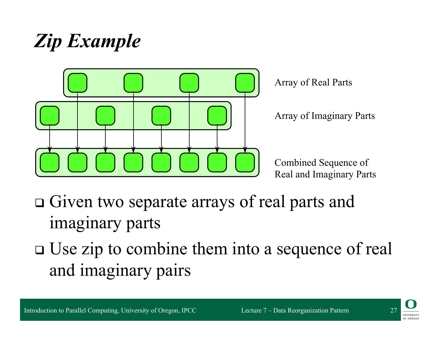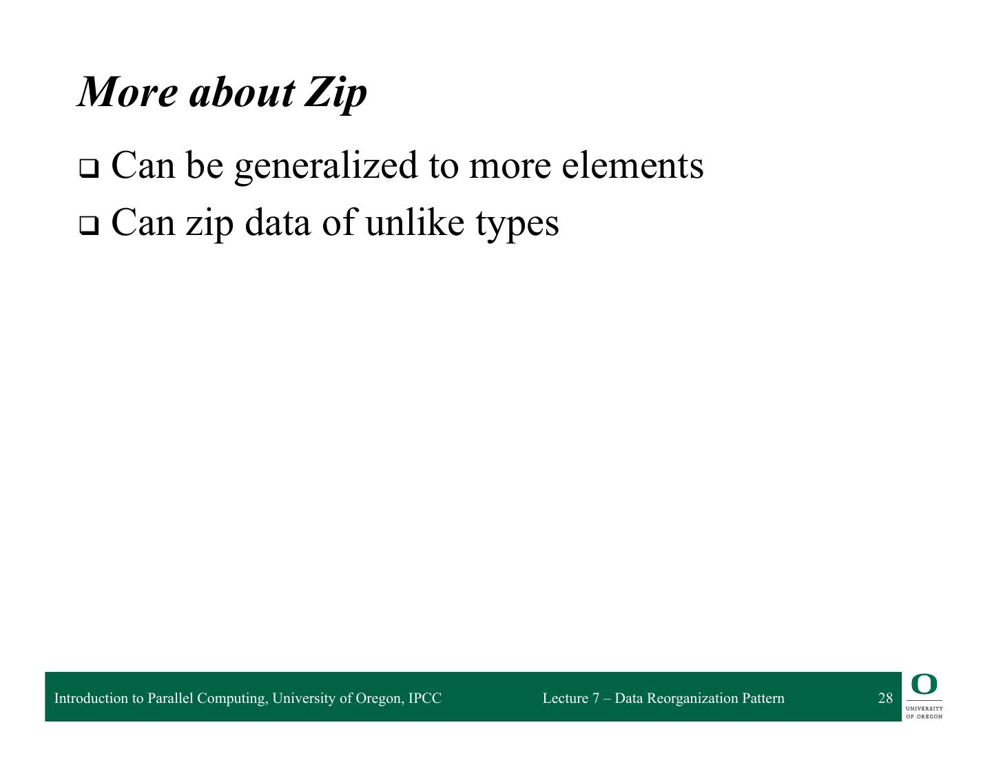 28 . More about Zip q Can be generalized to more elements q Can zip data of unlike types Introduction to Parallel Computing, University of Oregon, IPCC Lecture 7 – Data Reorganization Pattern 28