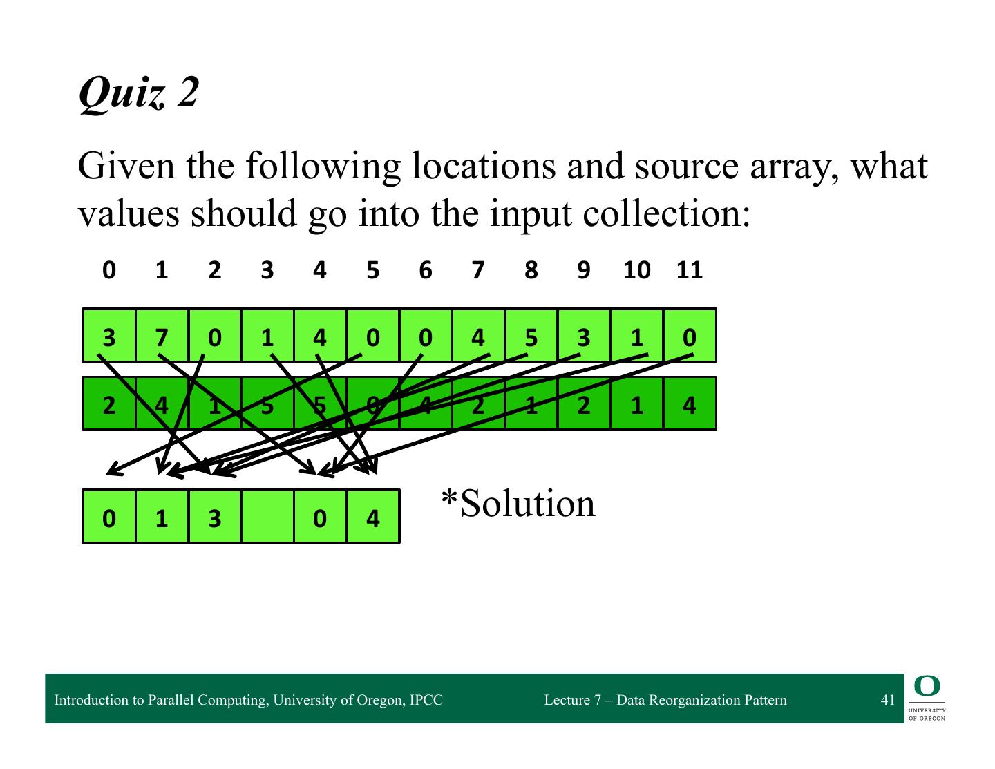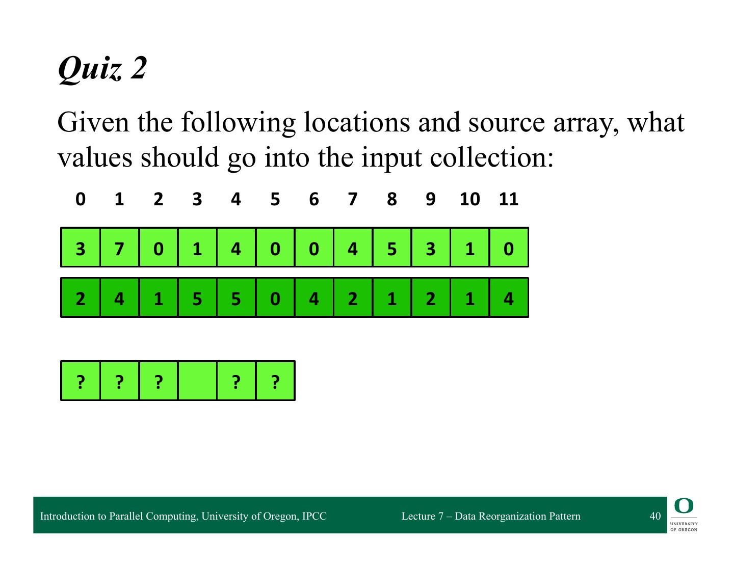 19 . Quiz 1 Given the following locations and source array, use a gather to determine what values should go into the output collection: 0 1 2 3 4 5 6 7 8 9 10 11 3 7 0 1 4 0 0 4 5 3 1 0 1 9 6 9 3 7 3 0 3 1 Introduction to Parallel Computing, University of Oregon, IPCC Lecture 7 – Data Reorganization Pattern 19