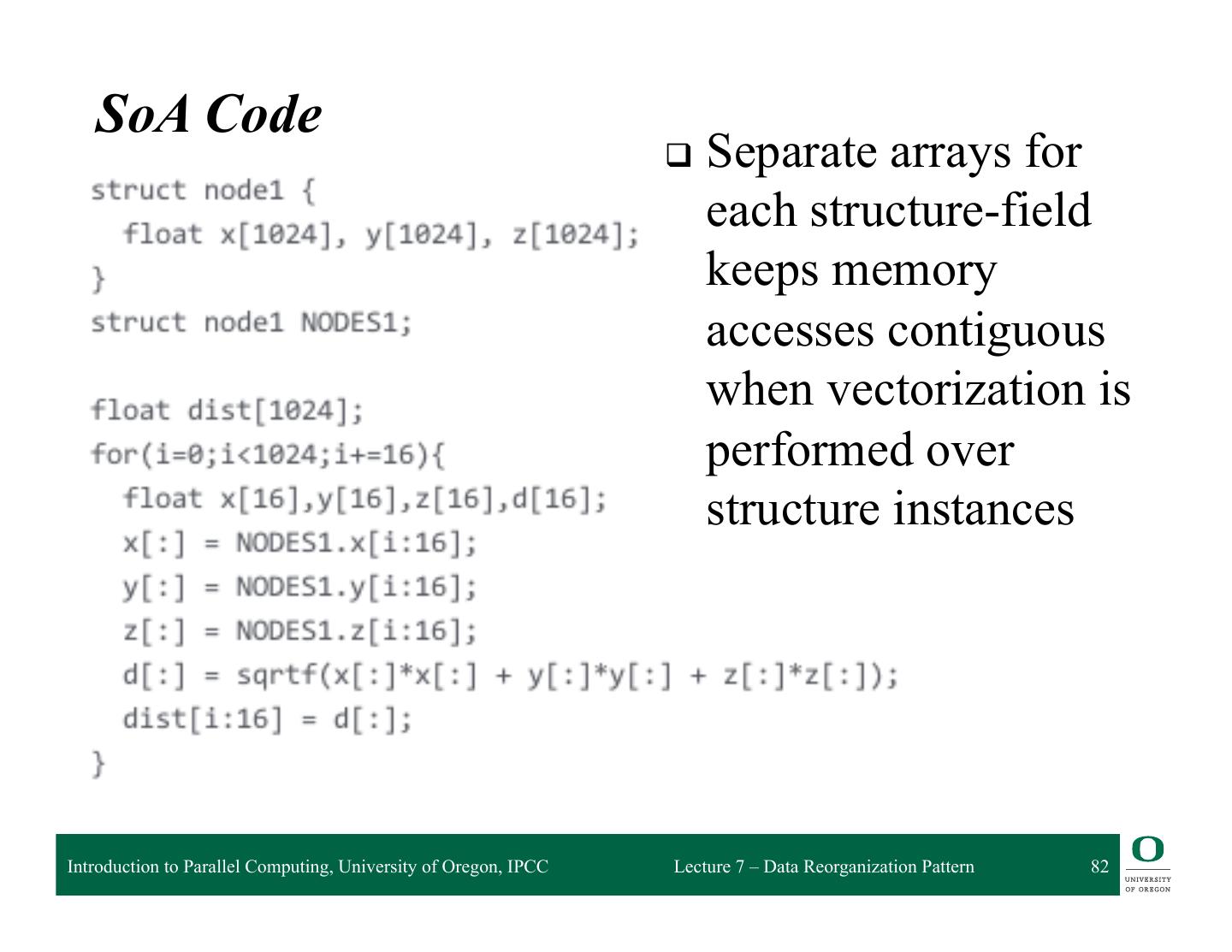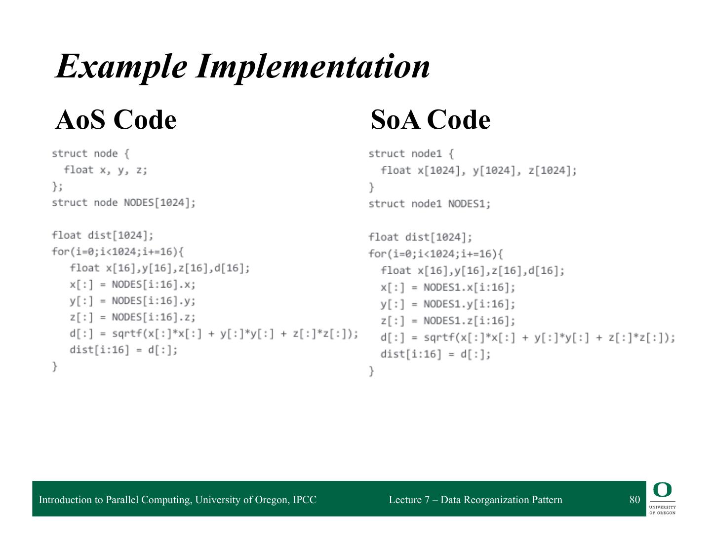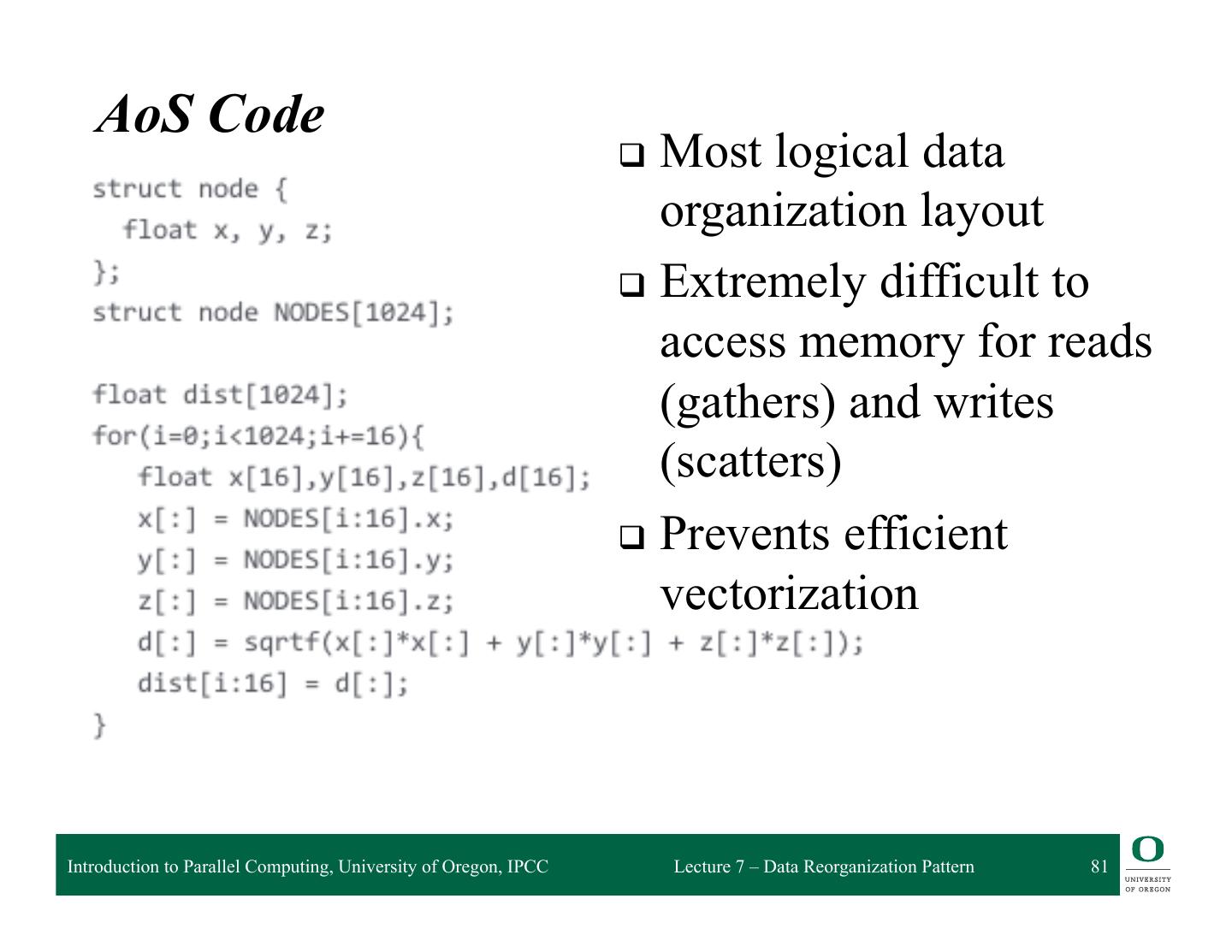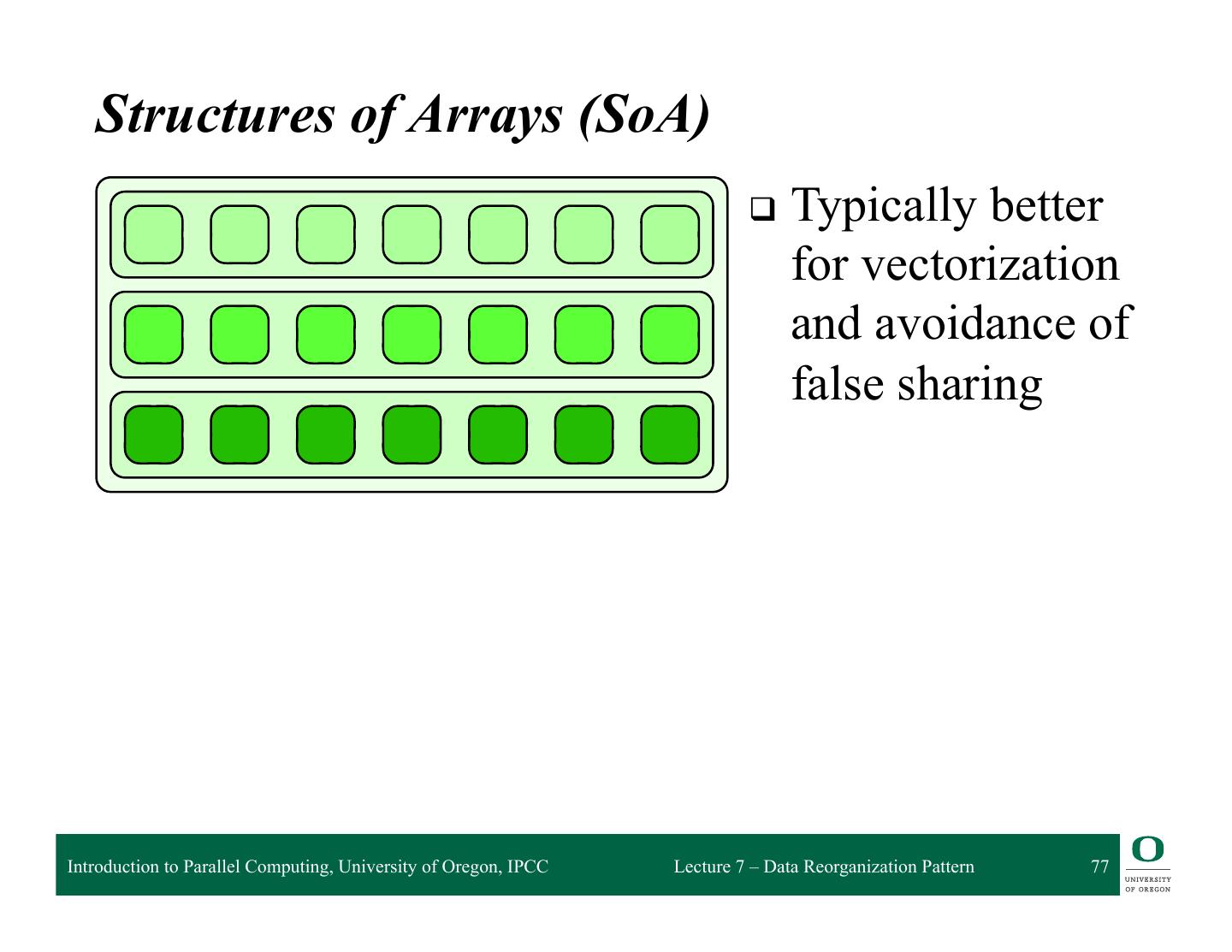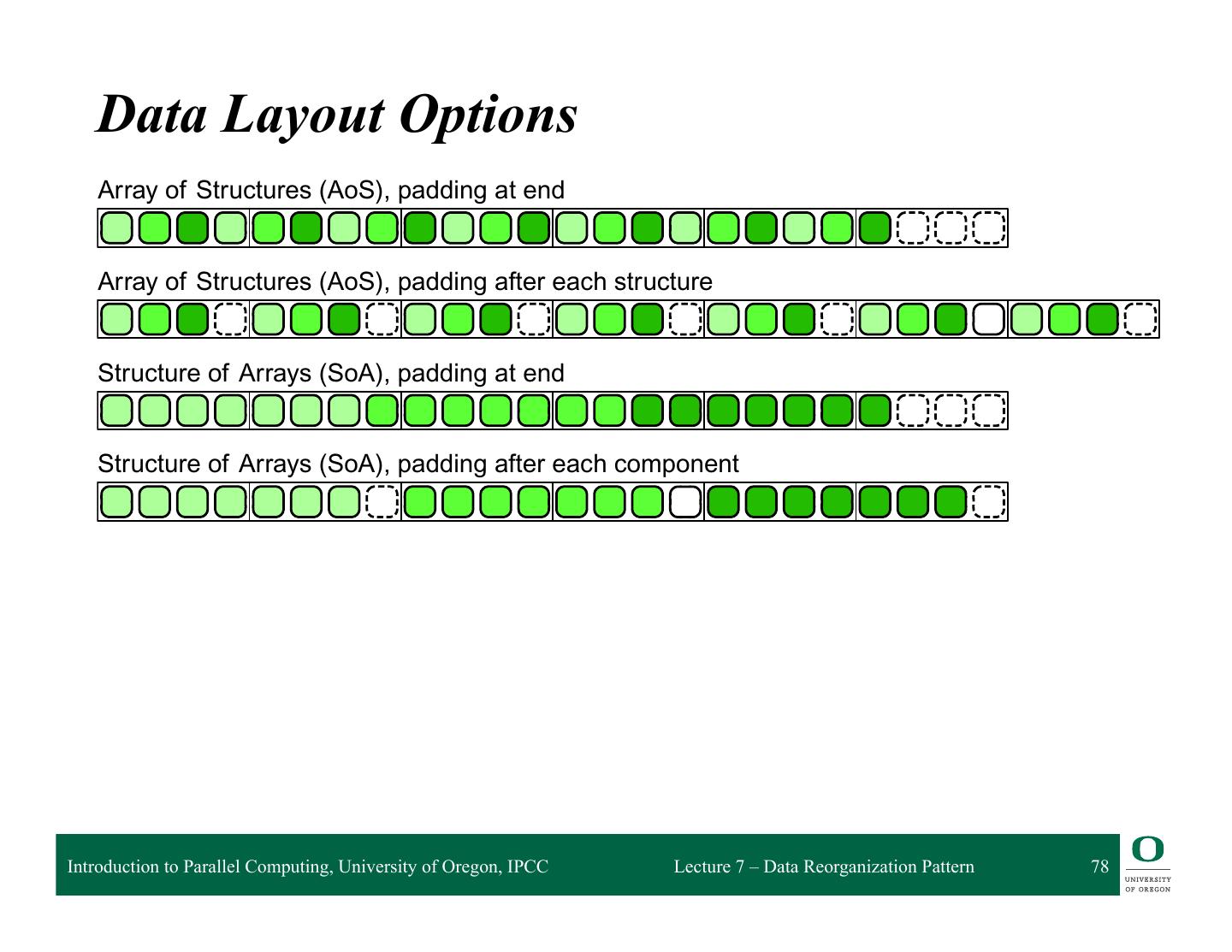 25 . Table of Contents q Gather Pattern ❍ Shifts, Zip, Unzip q Scatter Pattern ❍ Collision Rules: atomic, permutation, merge, priority q Pack Pattern ❍ Split, Unsplit, Bin ❍ Fusing Map and Pack ❍ Expand q Partitioning Data q AoS vs. SoA q Example Implementation: AoS vs. SoA Introduction to Parallel Computing, University of Oregon, IPCC Lecture 7 – Data Reorganization Pattern 25