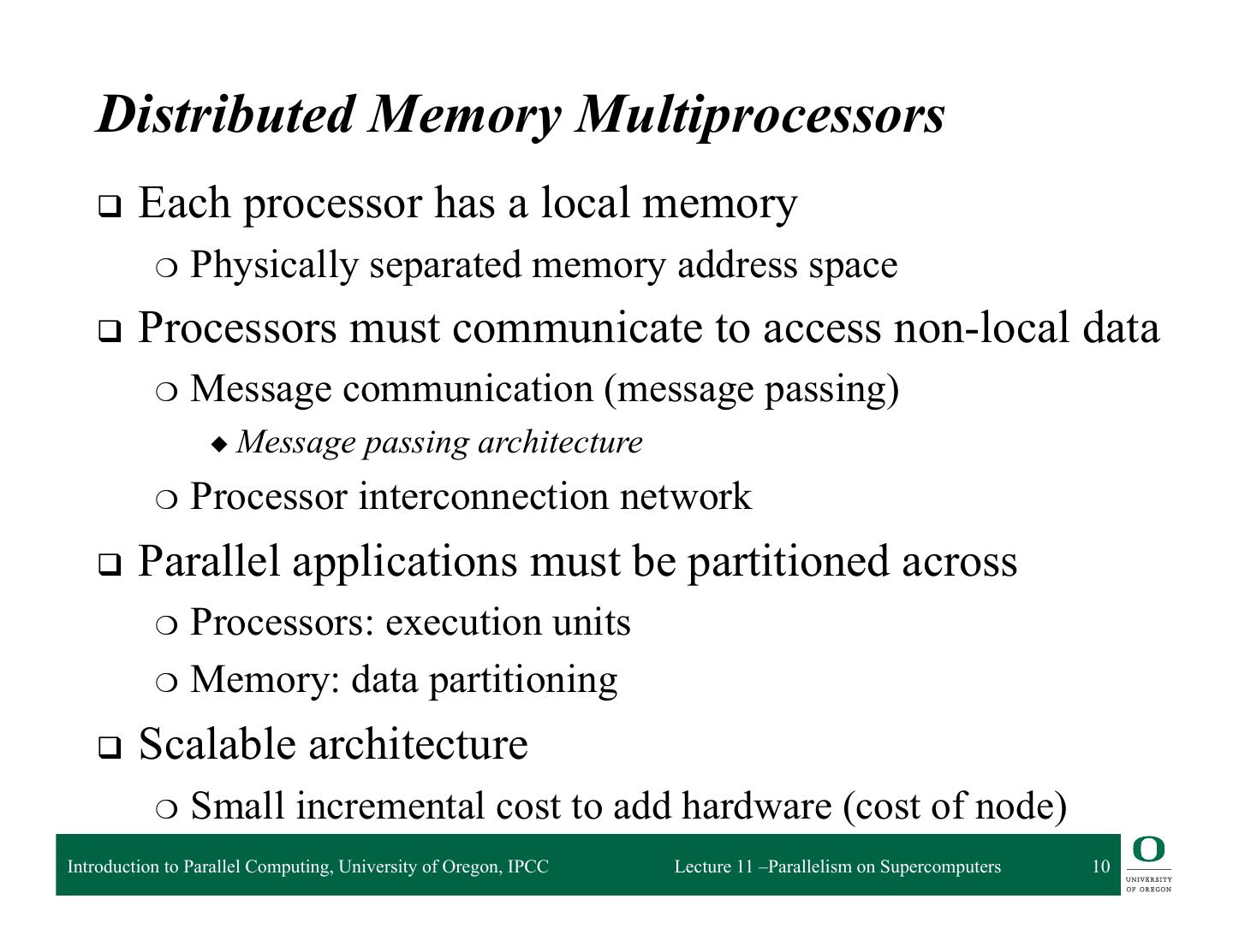 10 . Distributed Memory Multiprocessors q Each processor has a local memory ❍ Physically separated memory address space q Processors must communicate to access non-local data ❍ Message communication (message passing) ◆ Message passing architecture ❍ Processor interconnection network q Parallel applications must be partitioned across ❍ Processors: execution units ❍ Memory: data partitioning q Scalable architecture ❍ Small incremental cost to add hardware (cost of node) Introduction to Parallel Computing, University of Oregon, IPCC Lecture 11 –Parallelism on Supercomputers 10