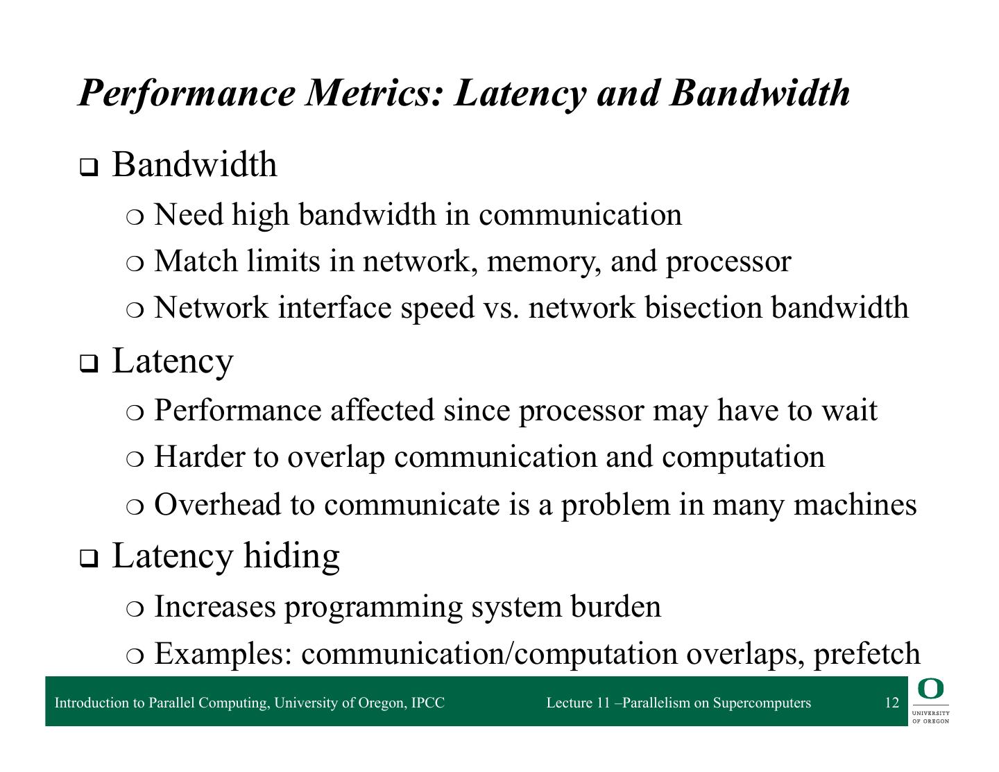 12 . Performance Metrics: Latency and Bandwidth q Bandwidth ❍ Need high bandwidth in communication ❍ Match limits in network, memory, and processor ❍ Network interface speed vs. network bisection bandwidth q Latency ❍ Performance affected since processor may have to wait ❍ Harder to overlap communication and computation ❍ Overhead to communicate is a problem in many machines q Latency hiding ❍ Increases programming system burden ❍ Examples: communication/computation overlaps, prefetch Introduction to Parallel Computing, University of Oregon, IPCC Lecture 11 –Parallelism on Supercomputers 12