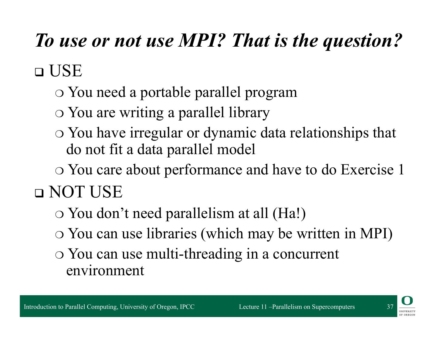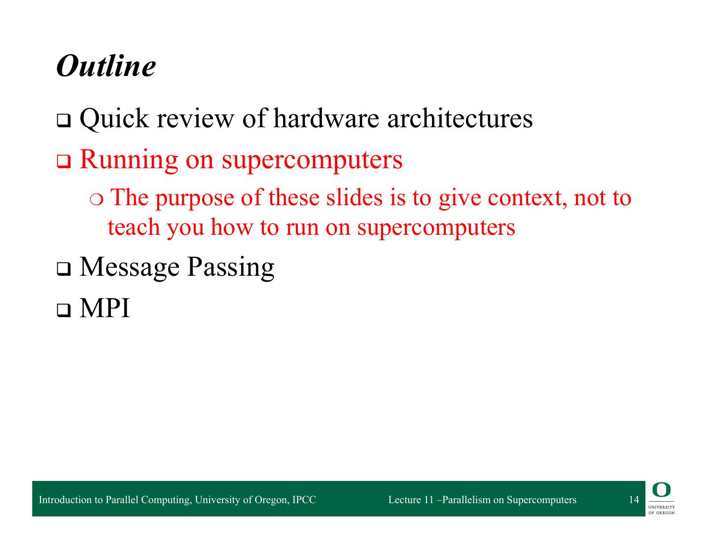14 . Outline q Quickreview of hardware architectures q Running on supercomputers ❍ The purpose of these slides is to give context, not to teach you how to run on supercomputers q Message Passing q MPI Introduction to Parallel Computing, University of Oregon, IPCC Lecture 11 –Parallelism on Supercomputers 14