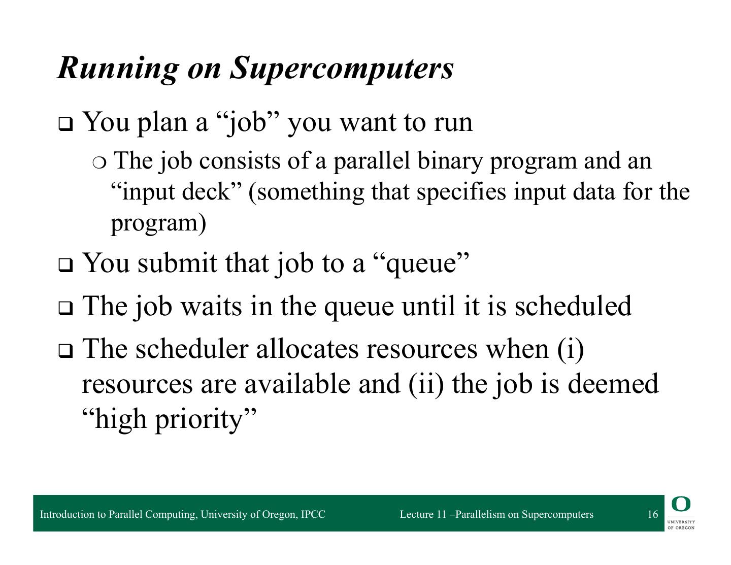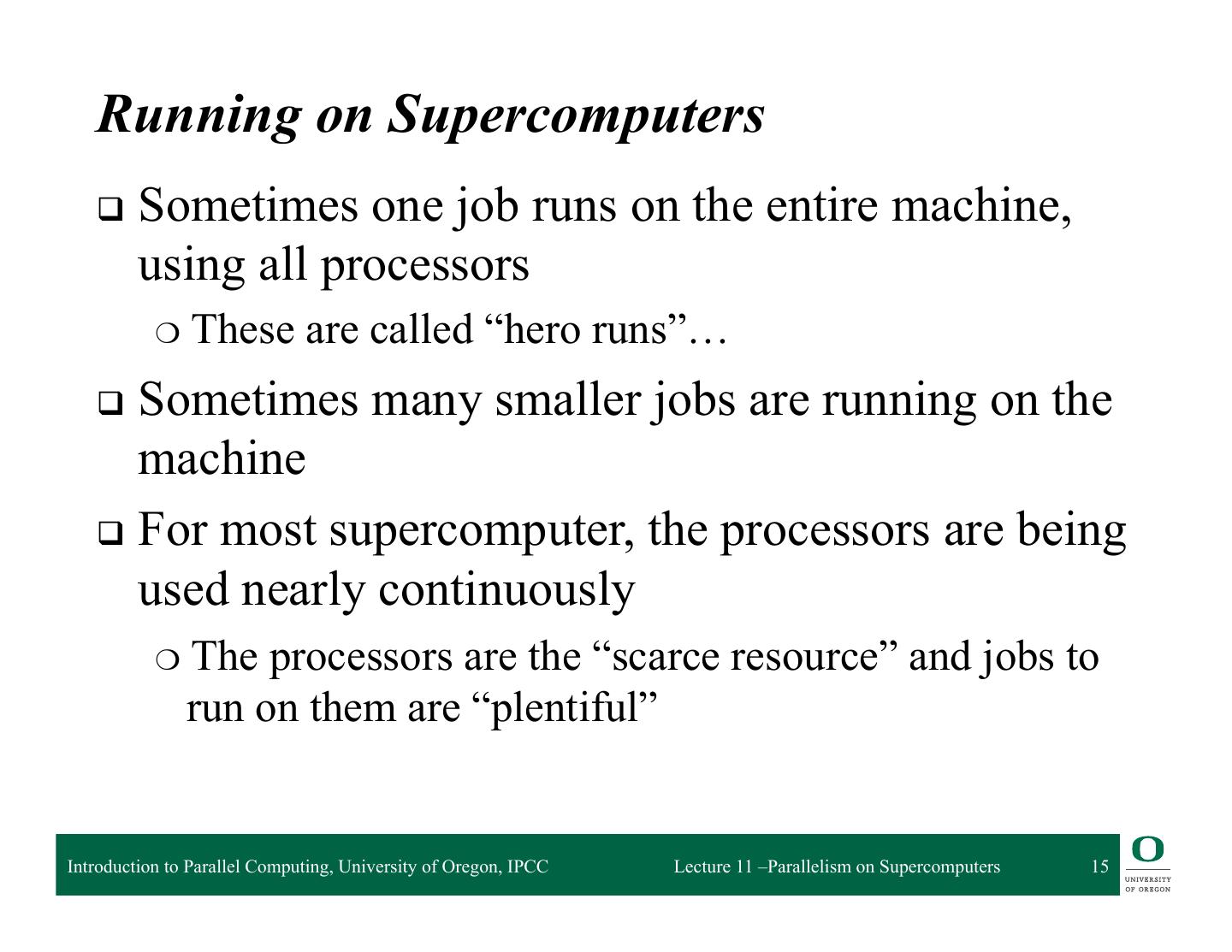 15 . Running on Supercomputers q Sometimes one job runs on the entire machine, using all processors ❍ These are called “hero runs”… q Sometimes many smaller jobs are running on the machine q For most supercomputer, the processors are being used nearly continuously ❍ The processors are the “scarce resource” and jobs to run on them are “plentiful” Introduction to Parallel Computing, University of Oregon, IPCC Lecture 11 –Parallelism on Supercomputers 15